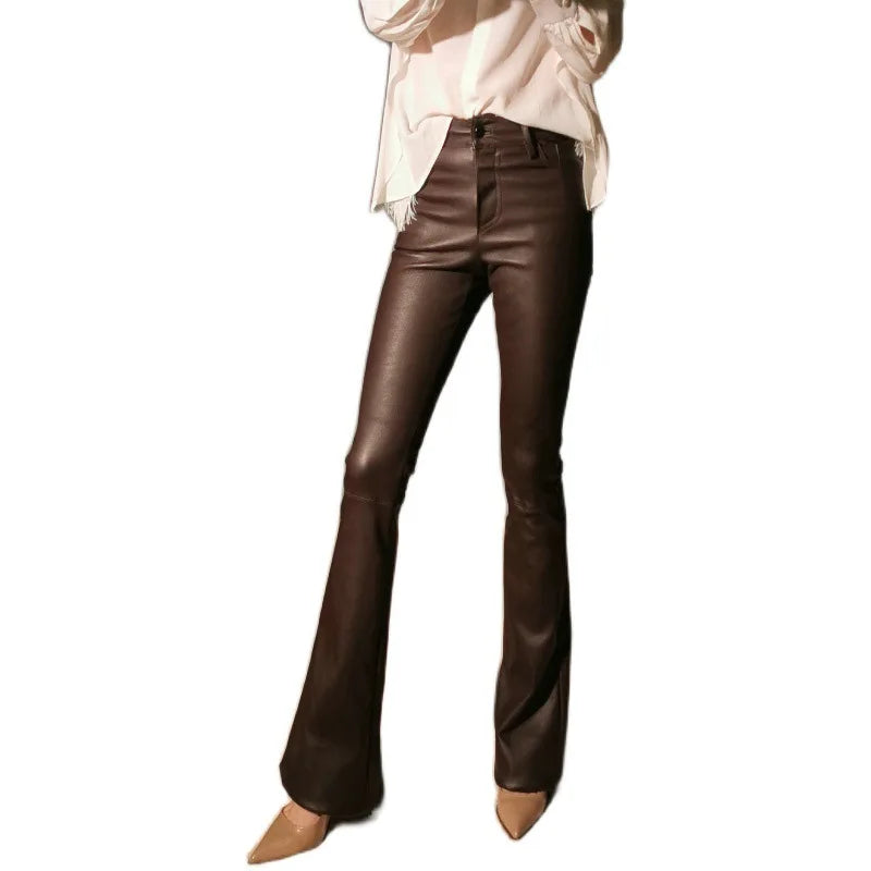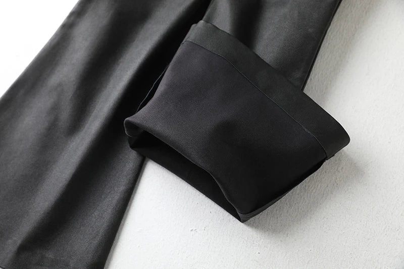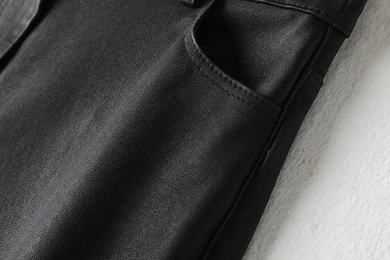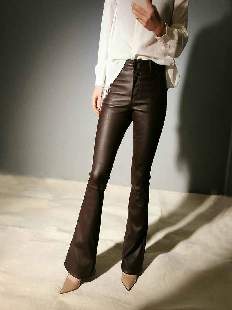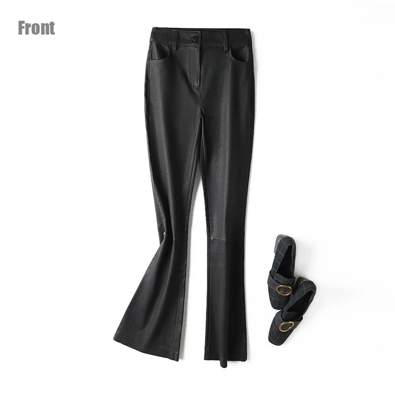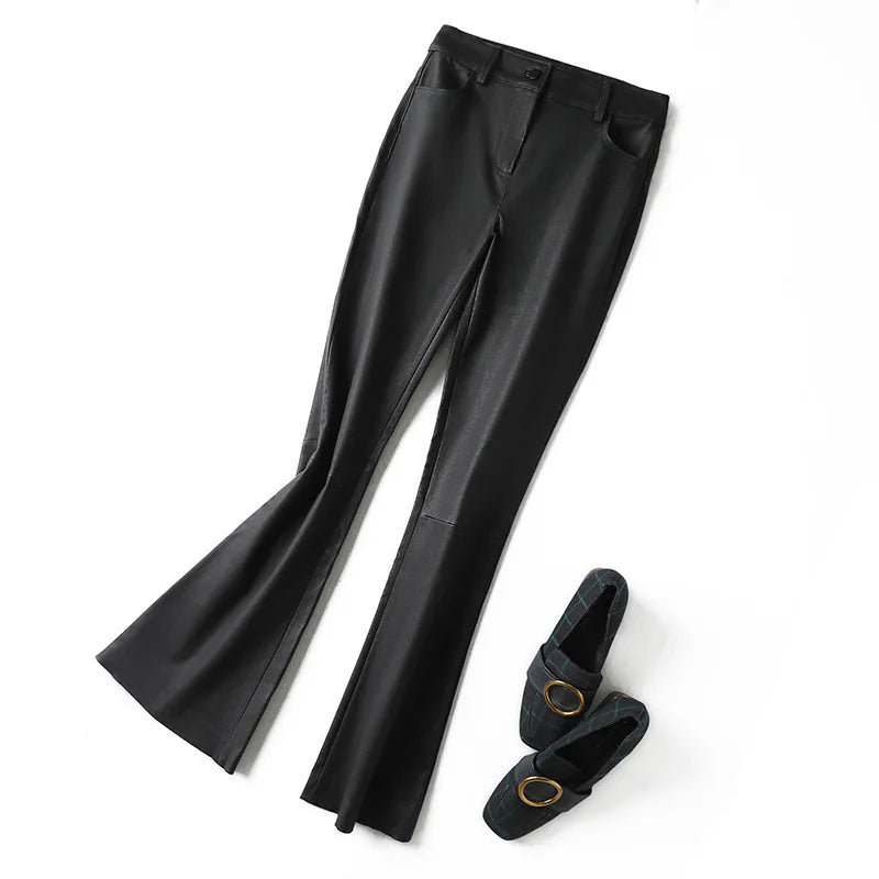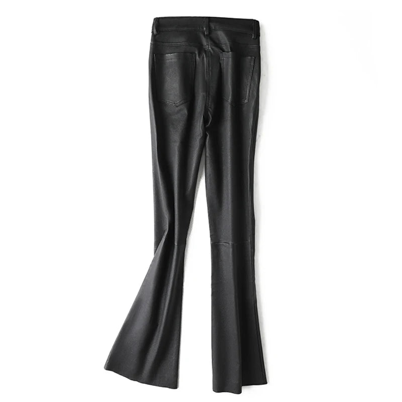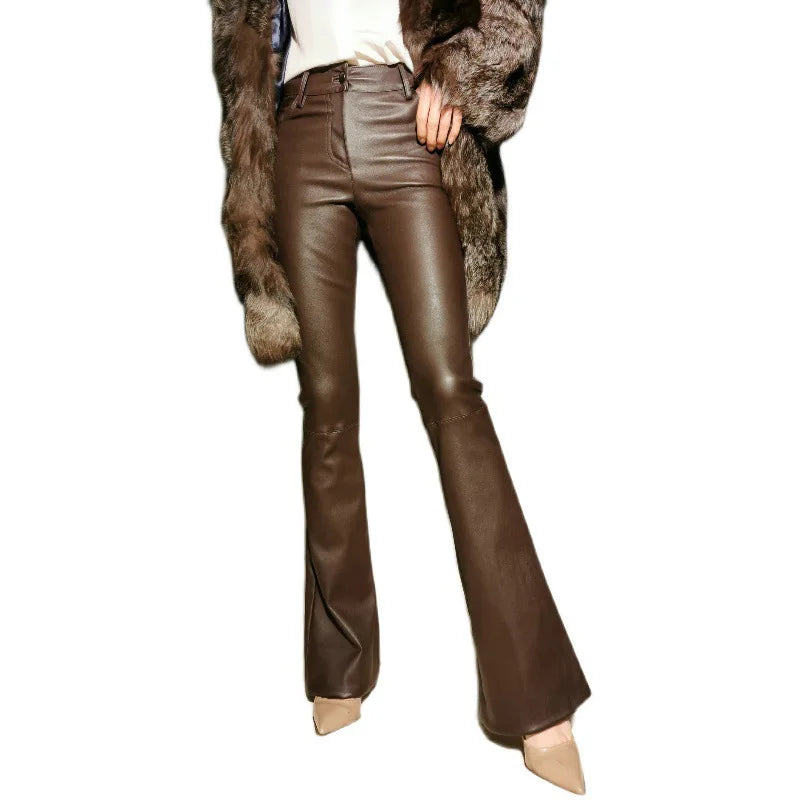 Women's Autumn Winter Mid Waist Skinny Flared Stretch Leather Pants