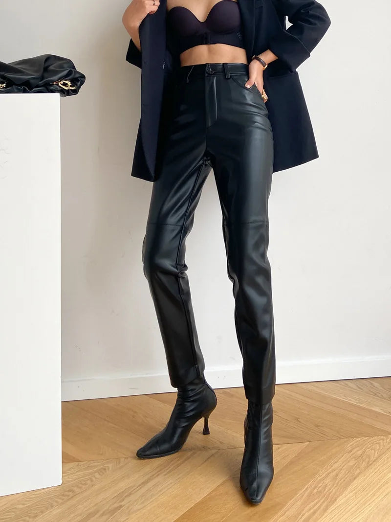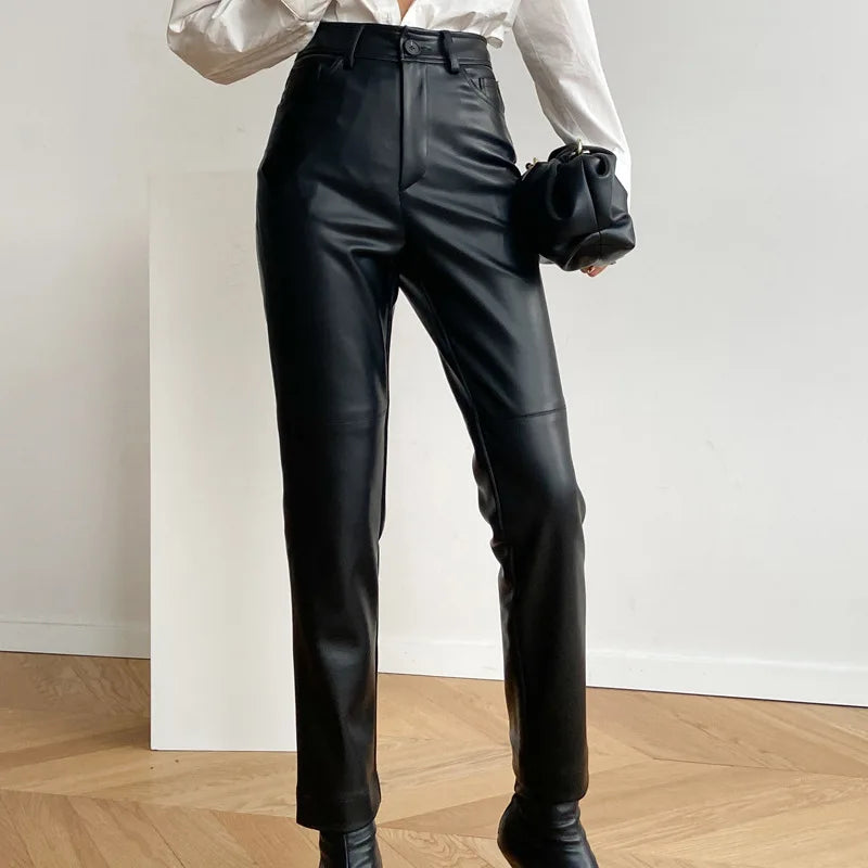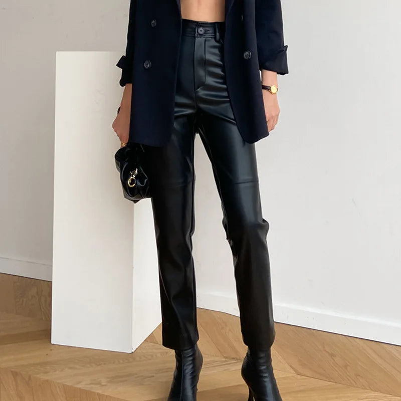 Women's Business Casual Sheepskin High Waist Straight Leg Slim Pants