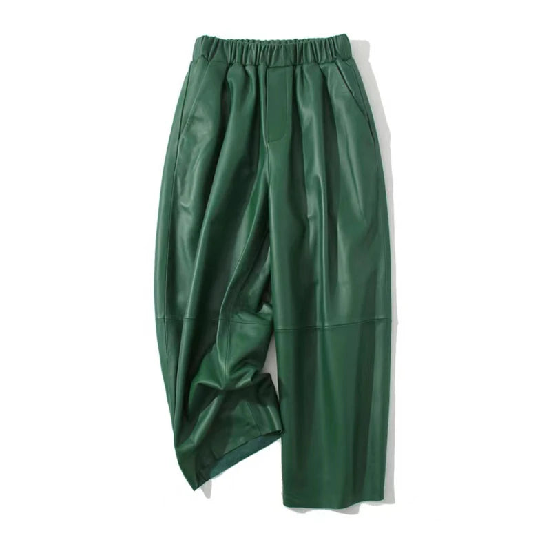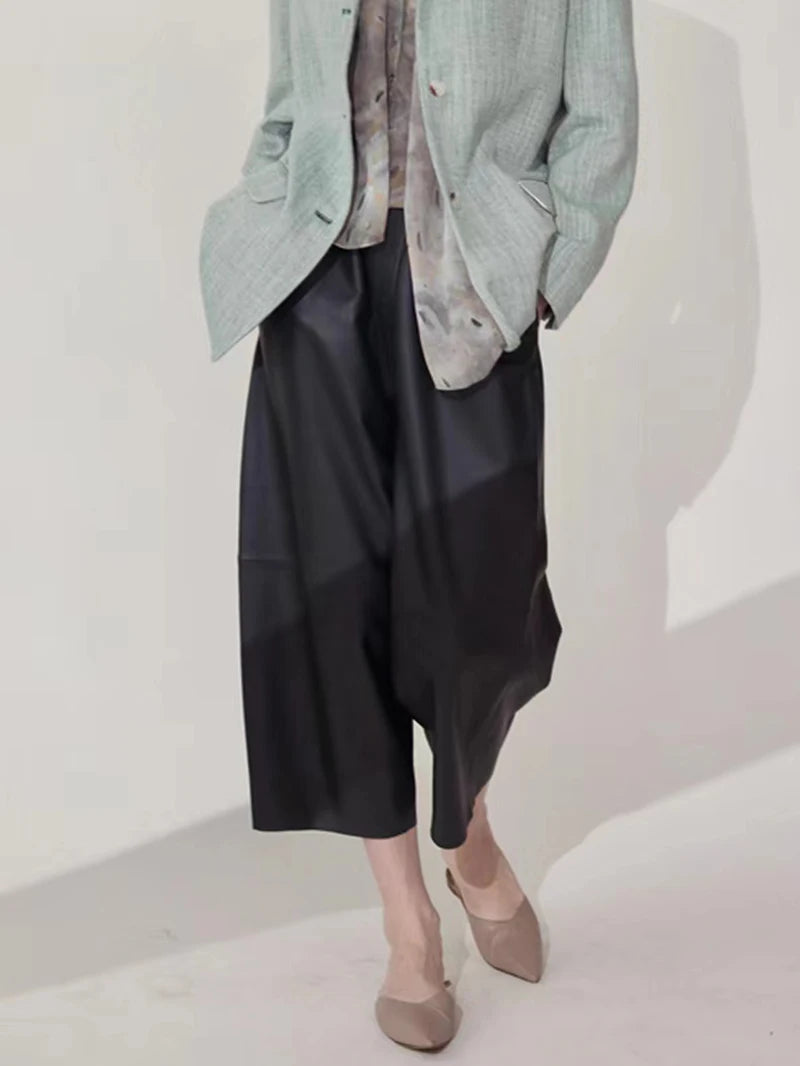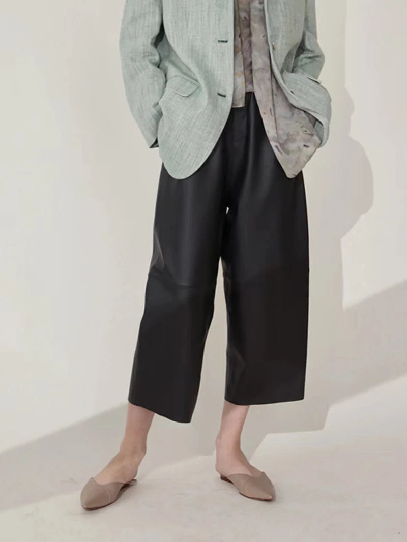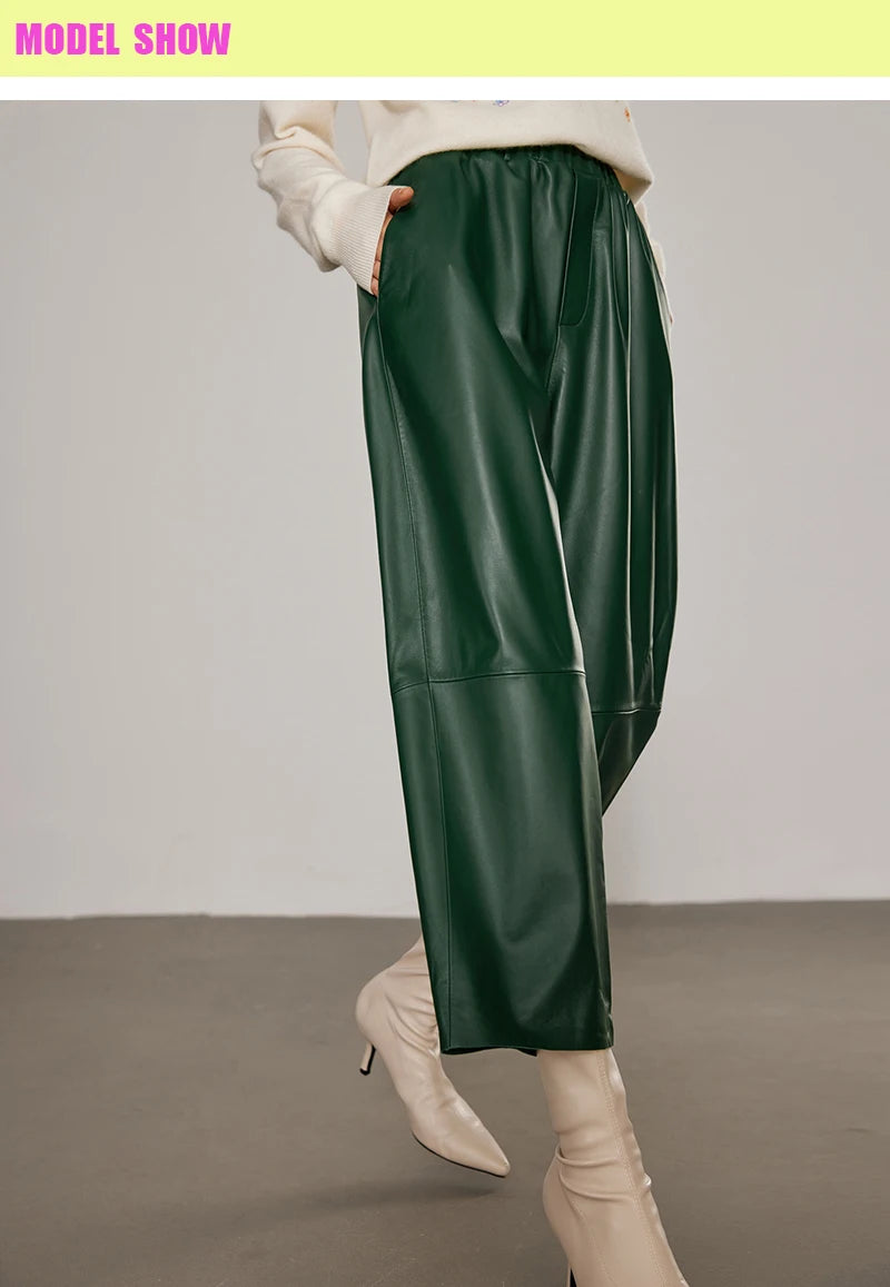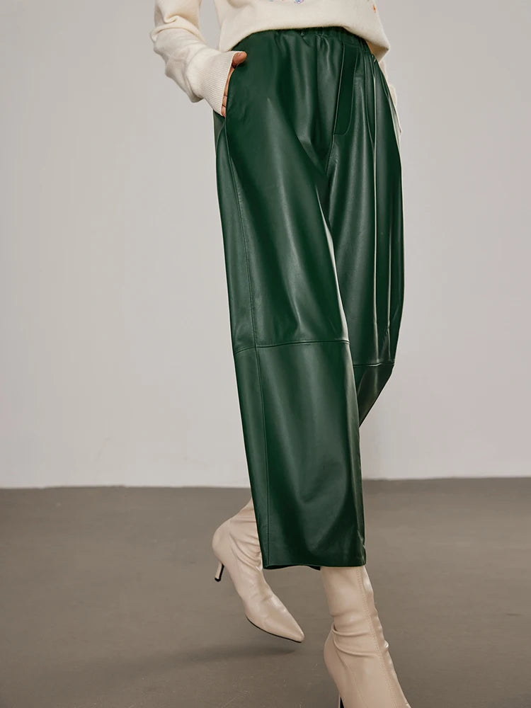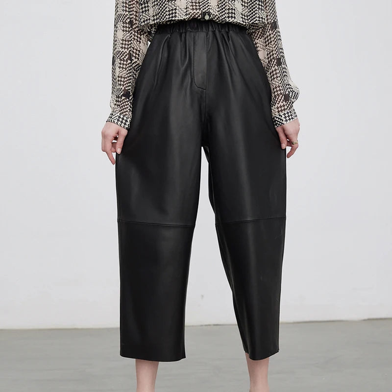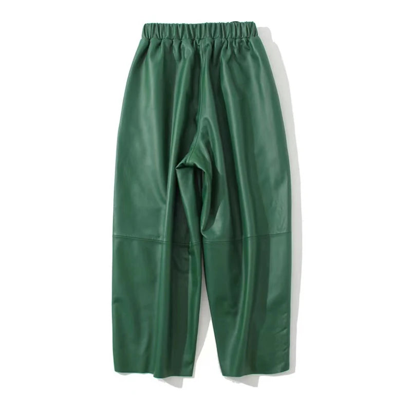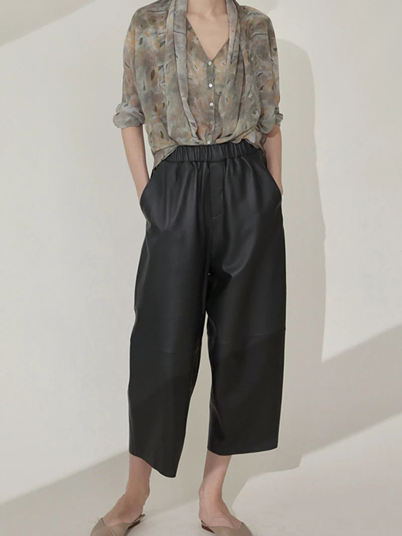 Women's Elastic Waist Sheepskin Wide Leg Harem Ankle Style Cropped Grandma Pants