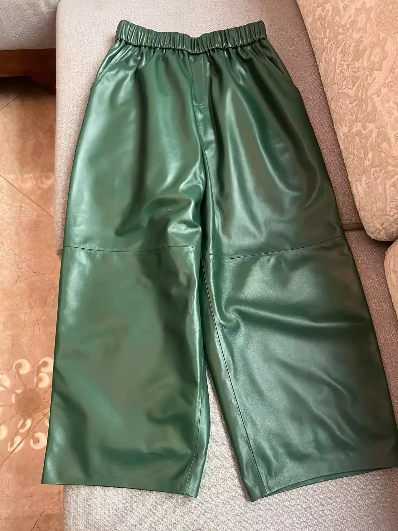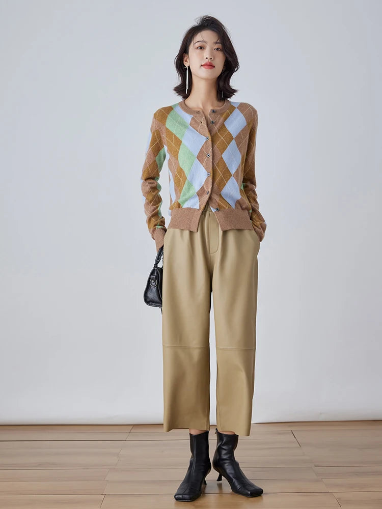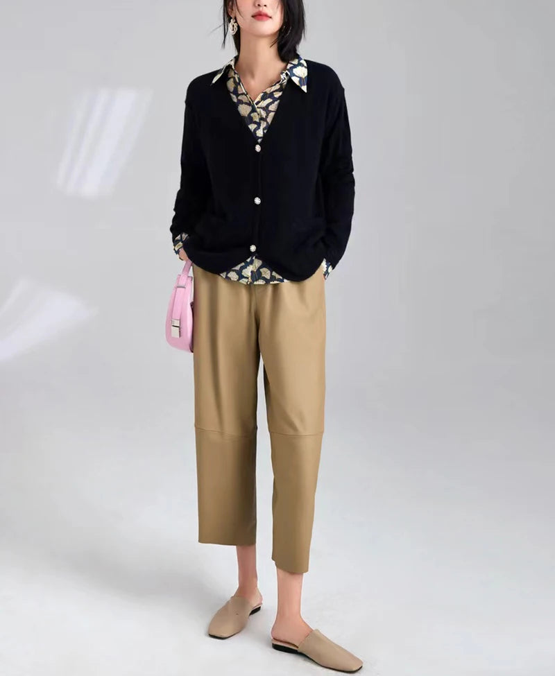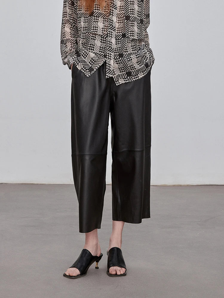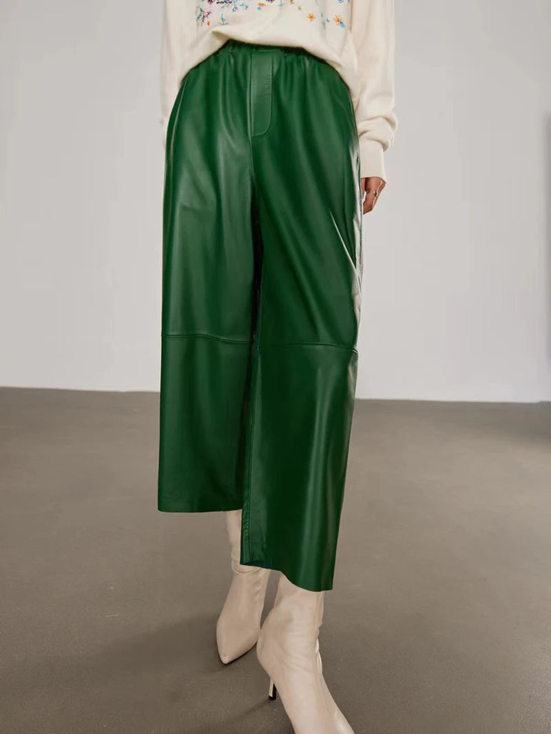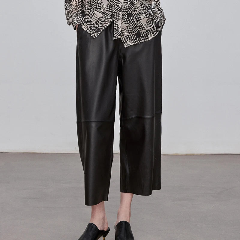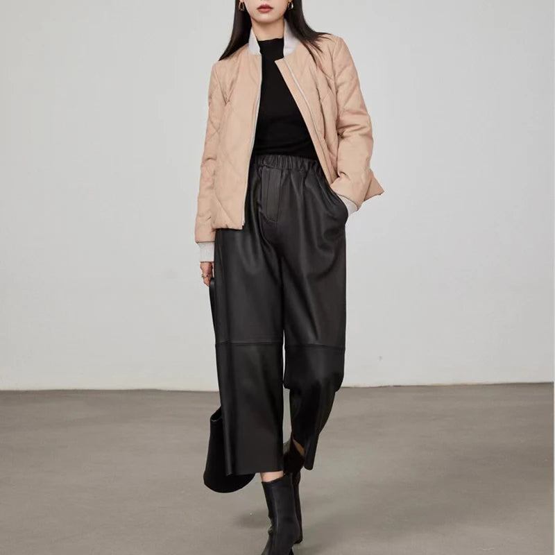 Women's Elastic Waist Sheepskin Wide Leg Harem Ankle Style Cropped Grandma Pants