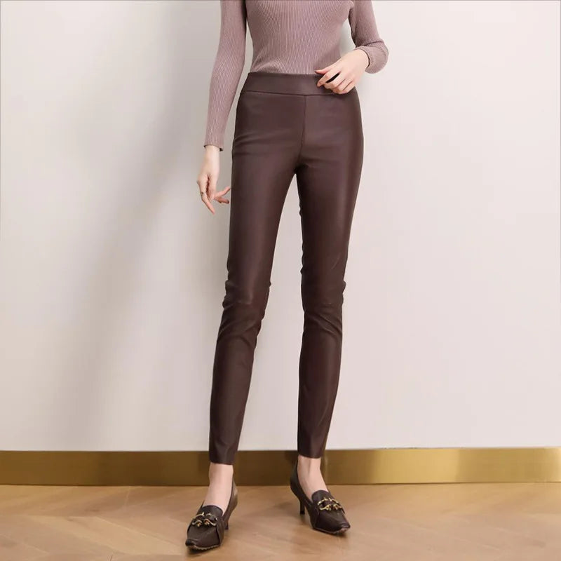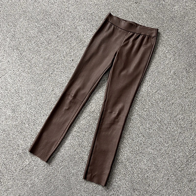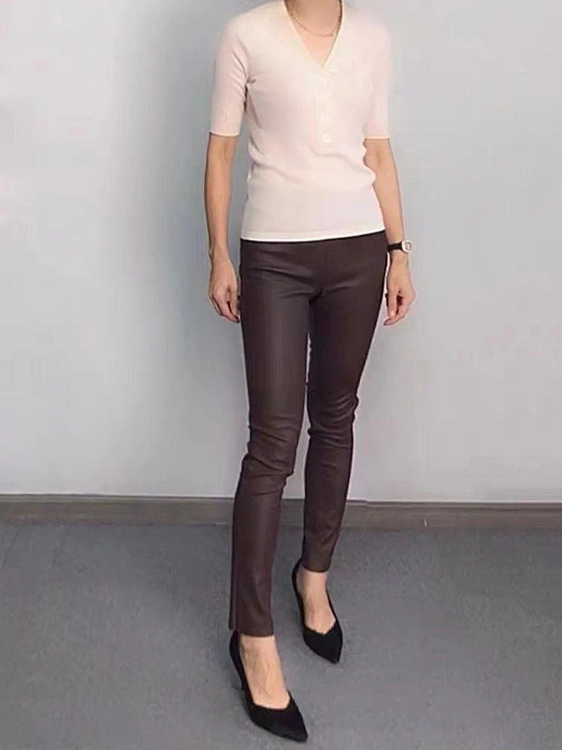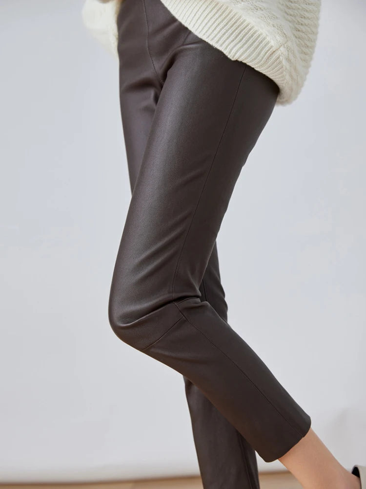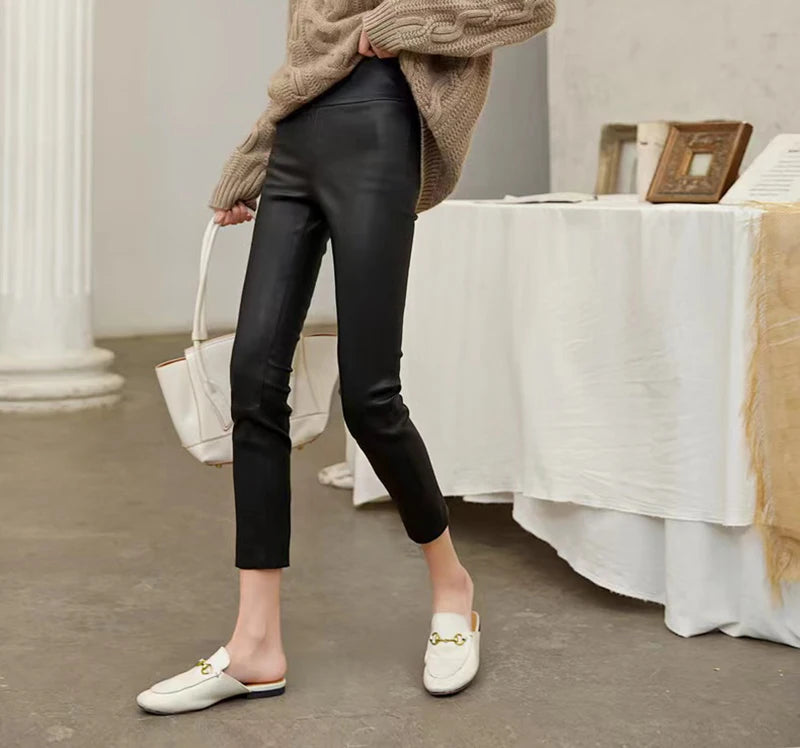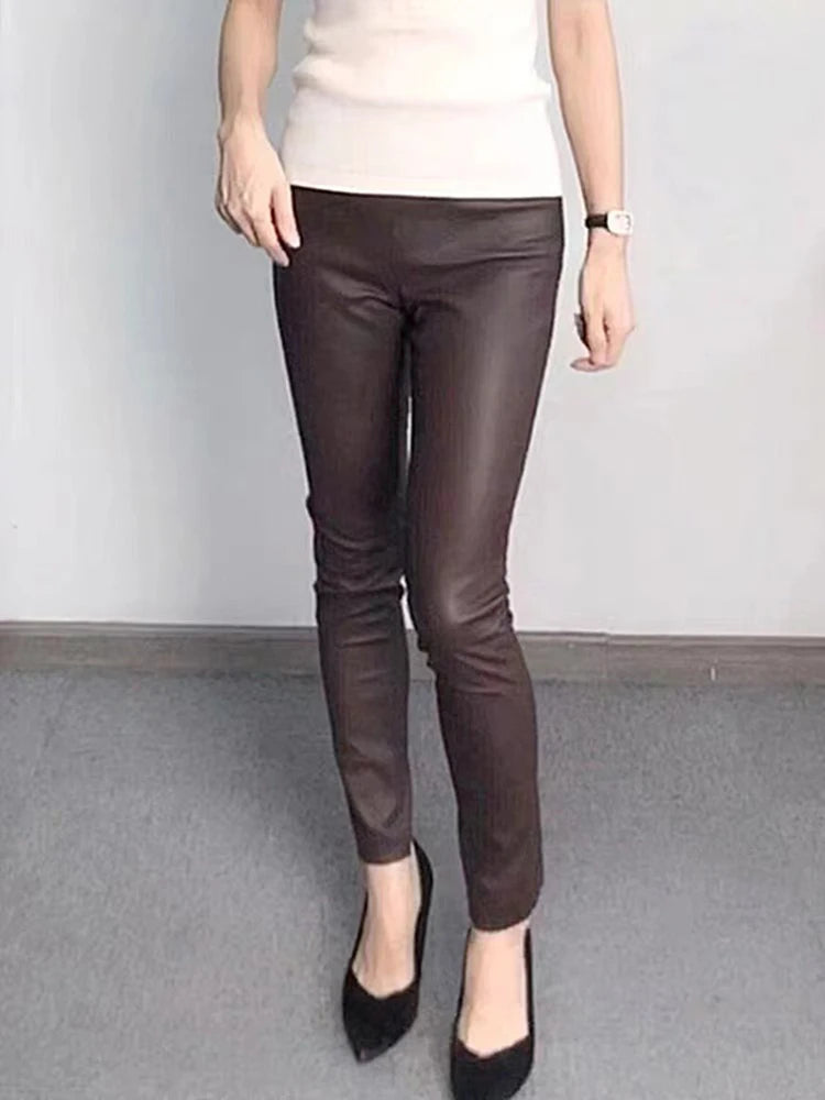 Women's Genuine Sheepskin Leather Simple Casual Elastic Waist Skinny Pants