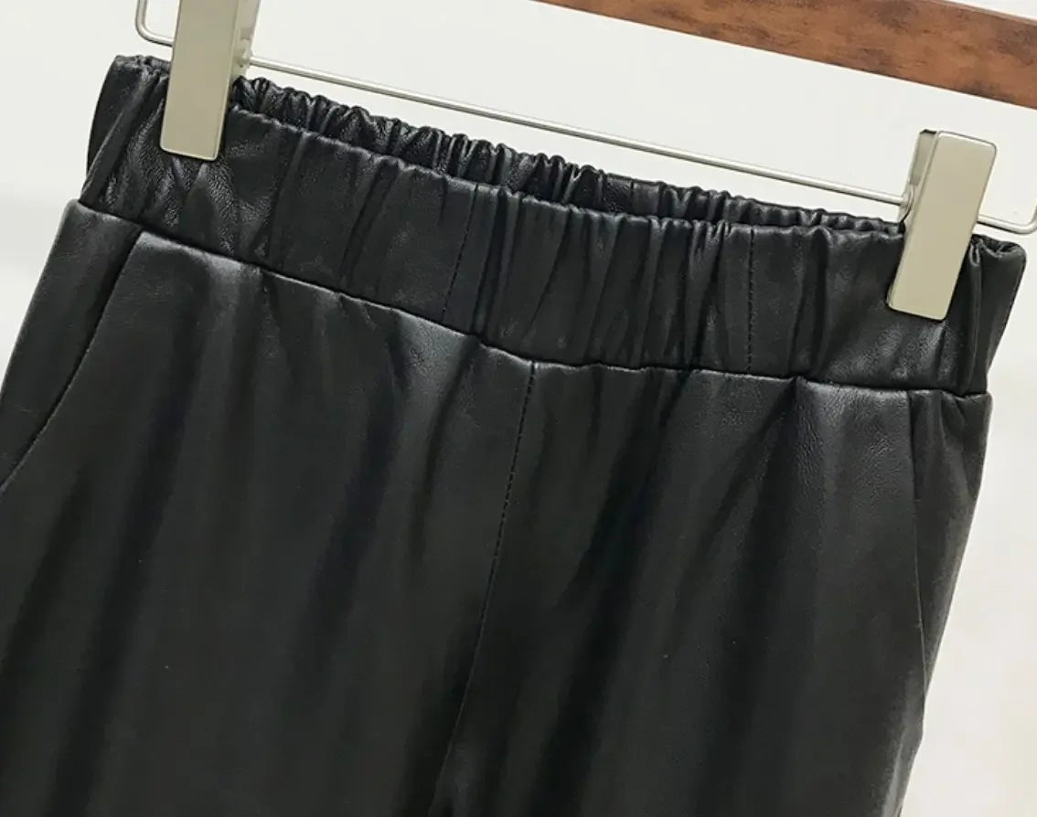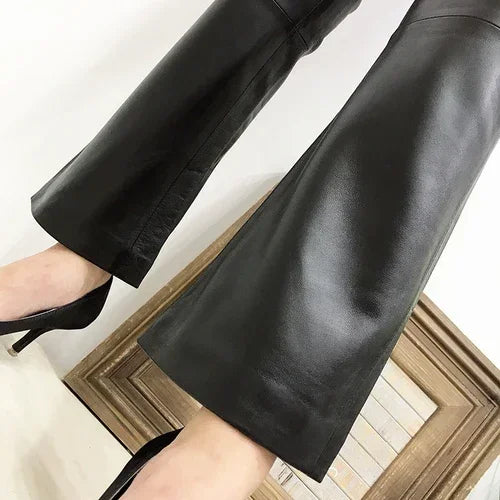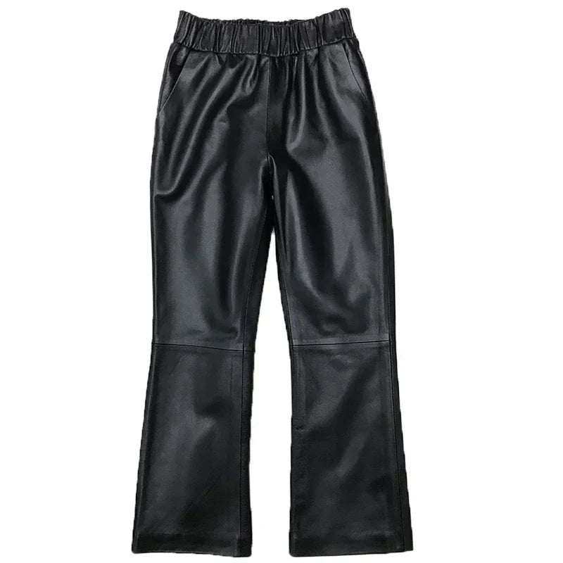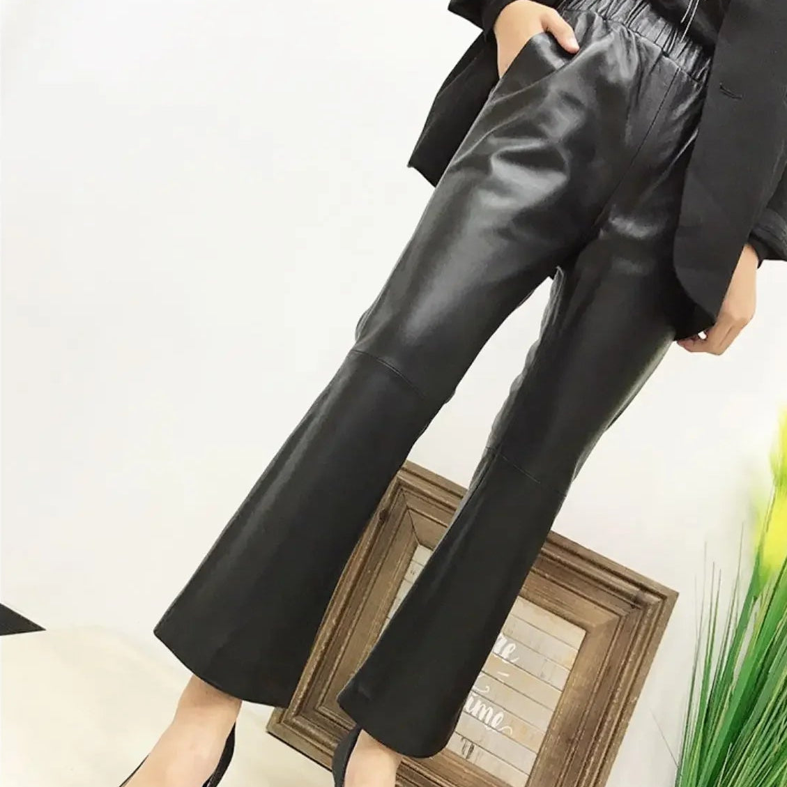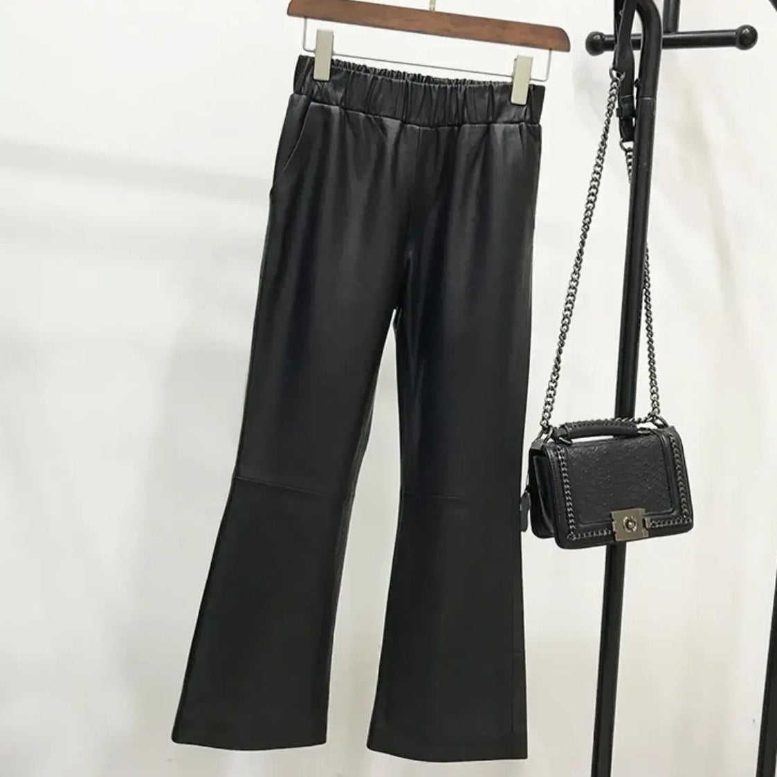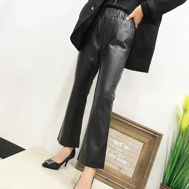 Women's Korean Style Micro Flare Elastic Waist Genuine Leather Pants
