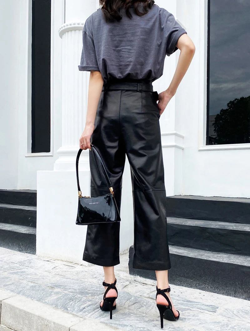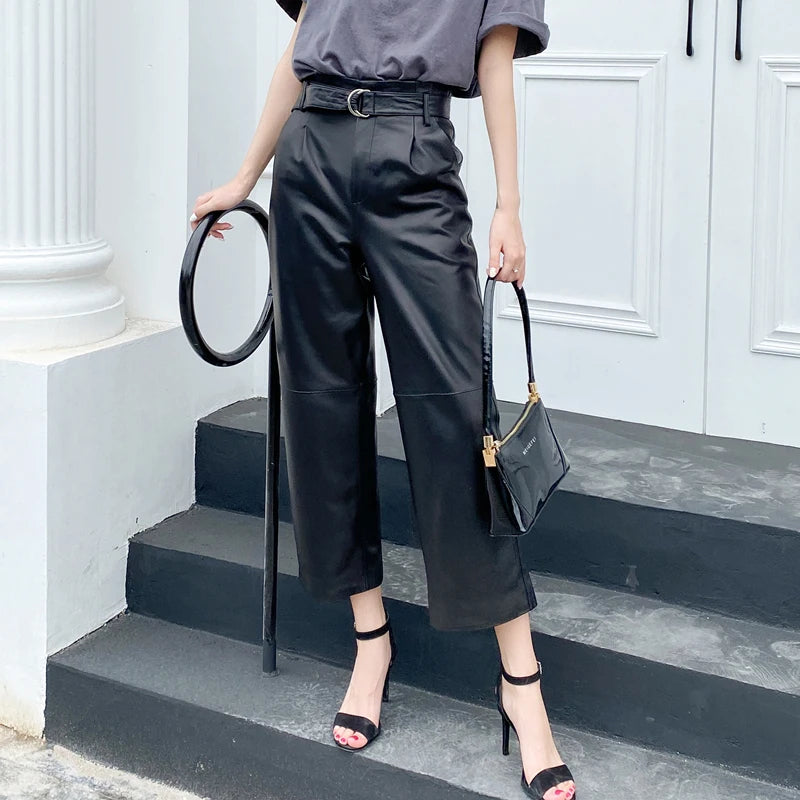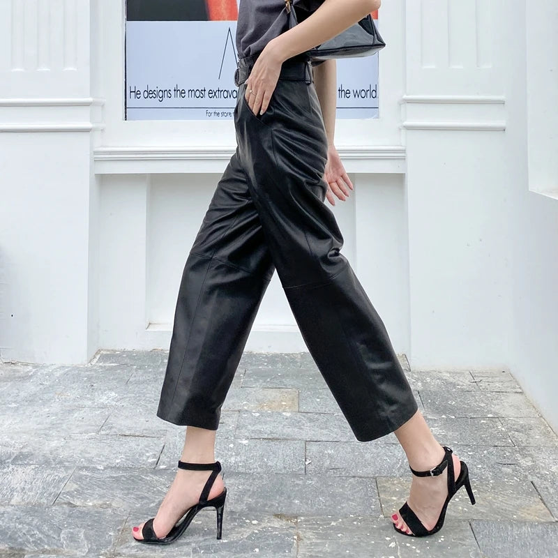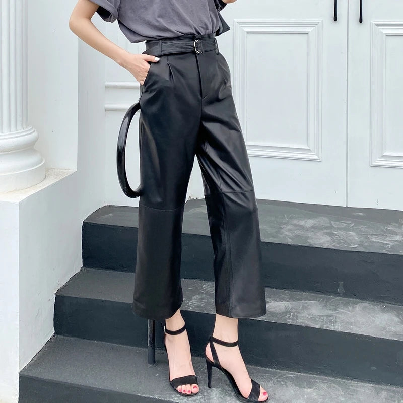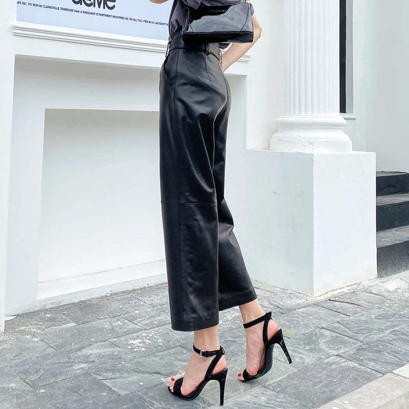 Women's Sheepskin Leather Wide Leg High Waist Cropped Straight Pants