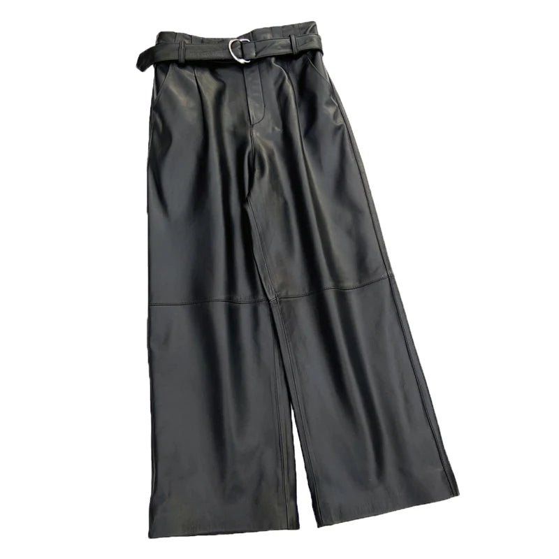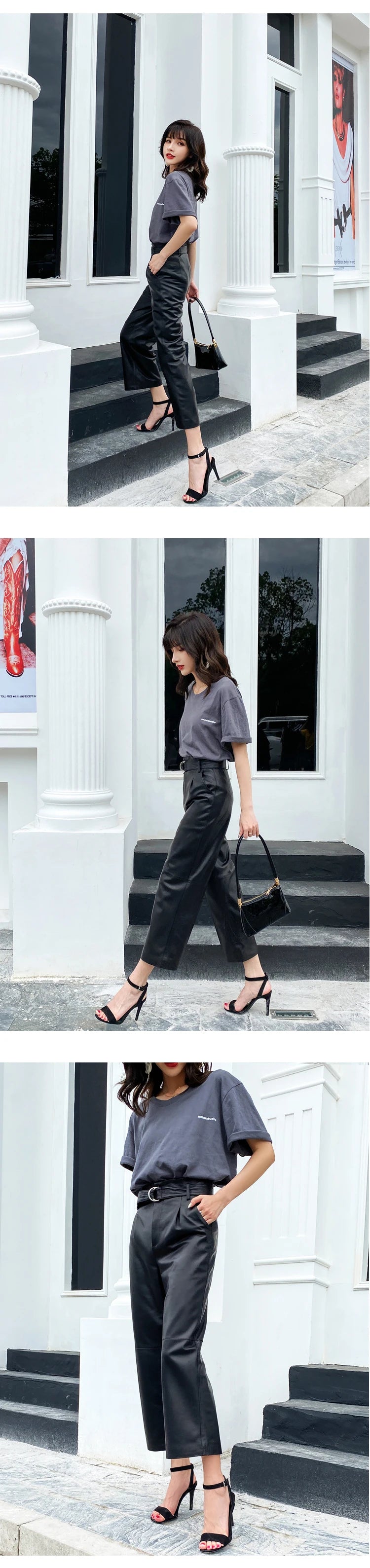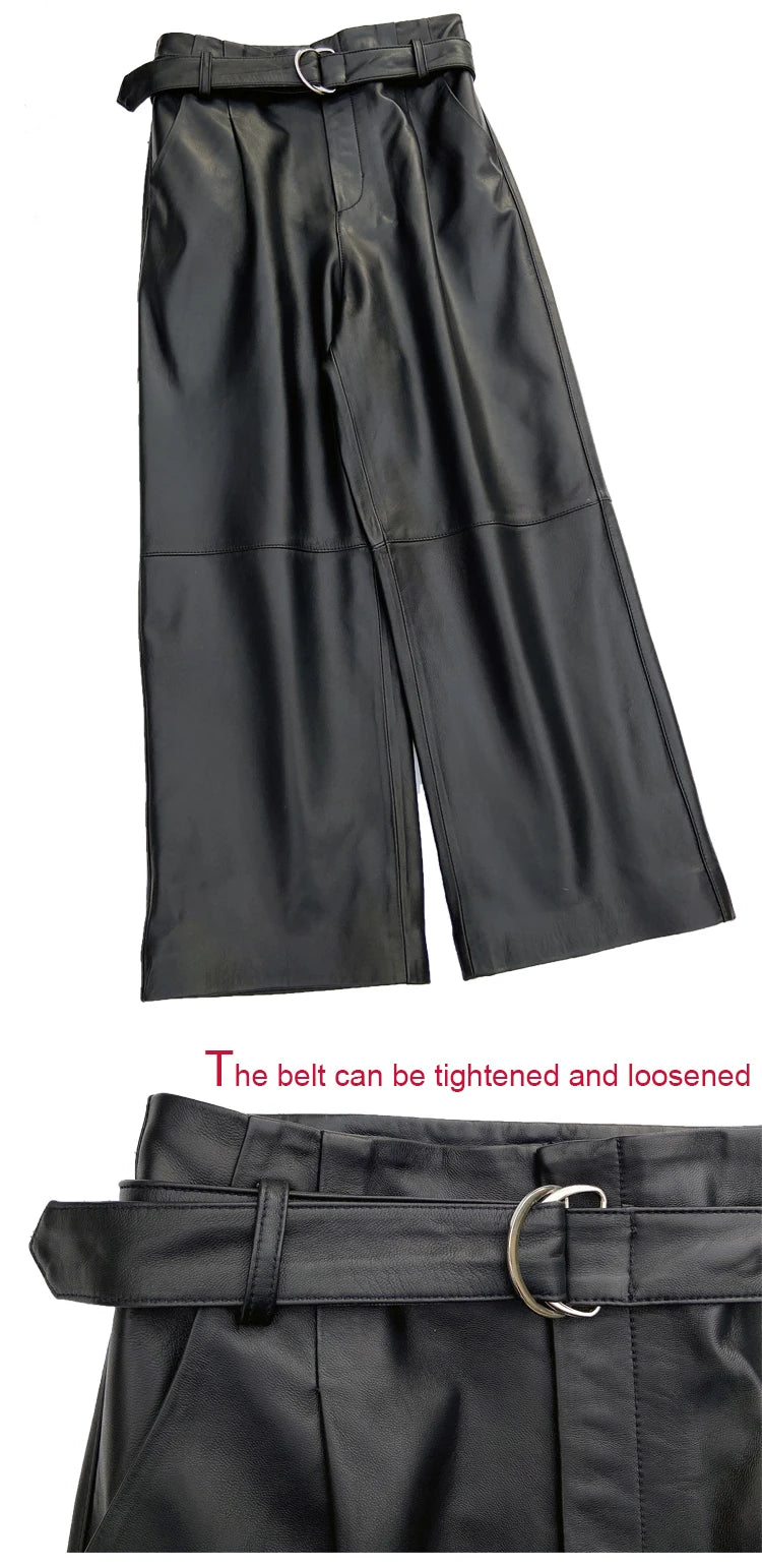 Women's Sheepskin Leather Wide Leg High Waist Cropped Straight Pants