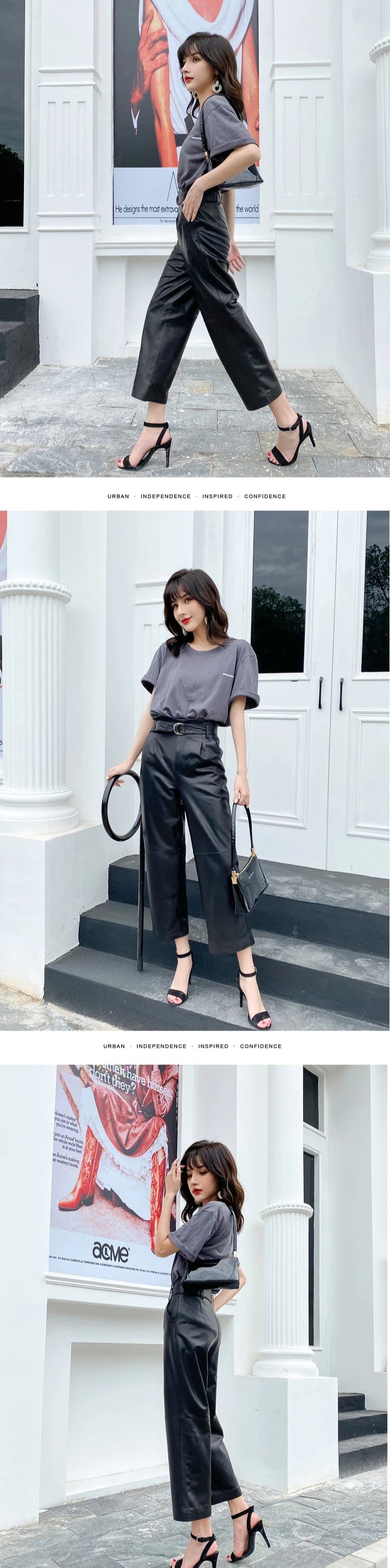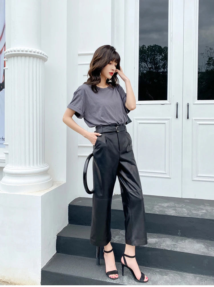 These stylish women's cropped pants feature wide straight legs and a high waistline for a polished look. The sheepskin leather keeps you cool and comfortable. Available in solid black color to match every color tops. Grab your's now!