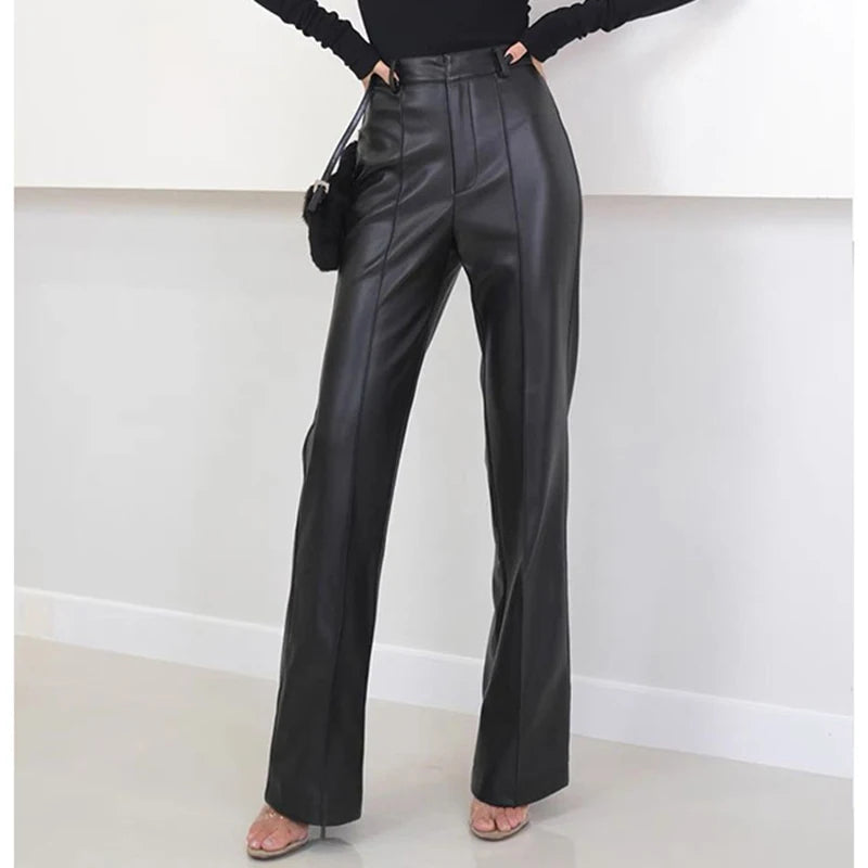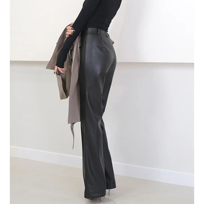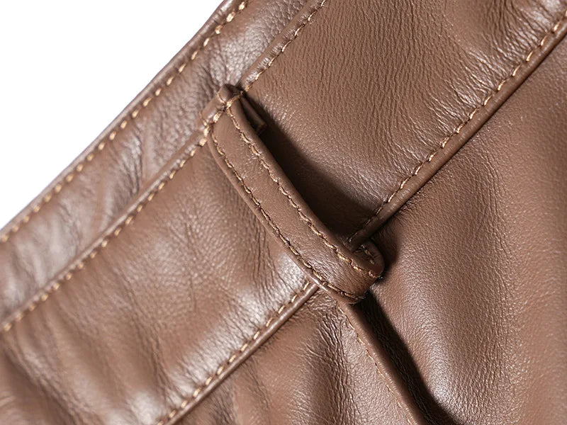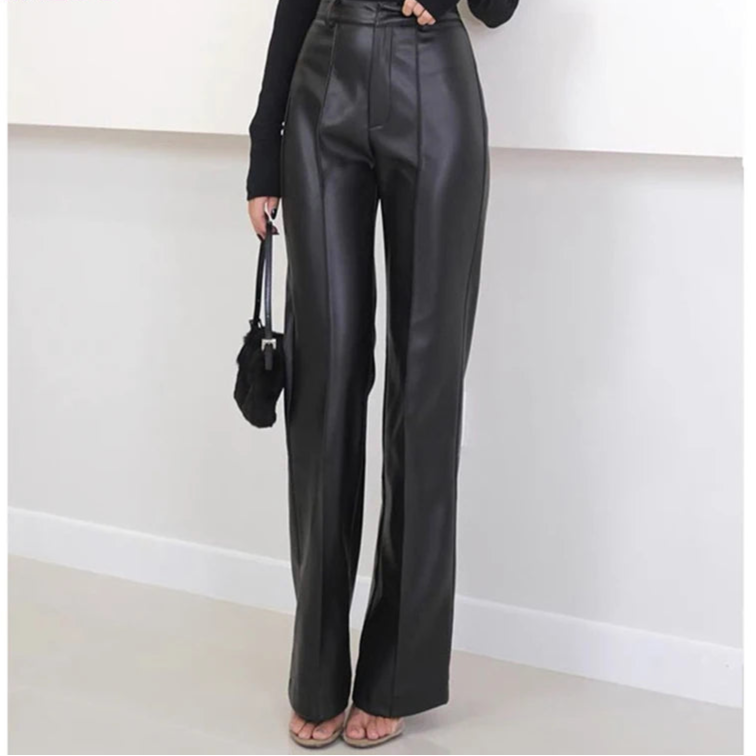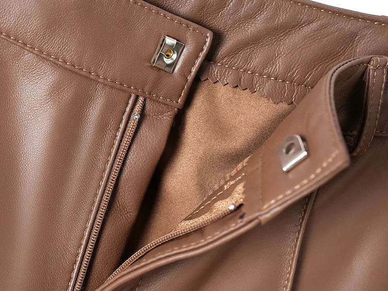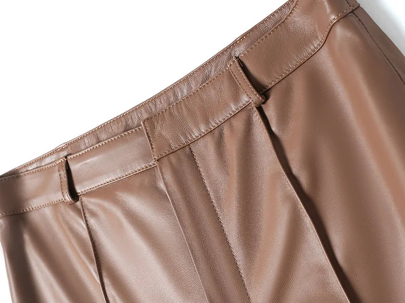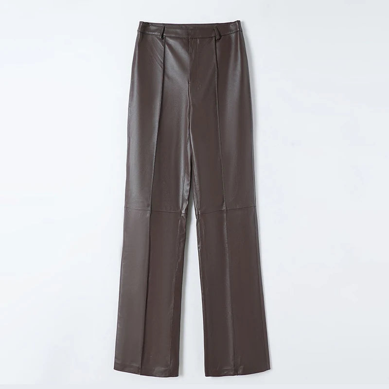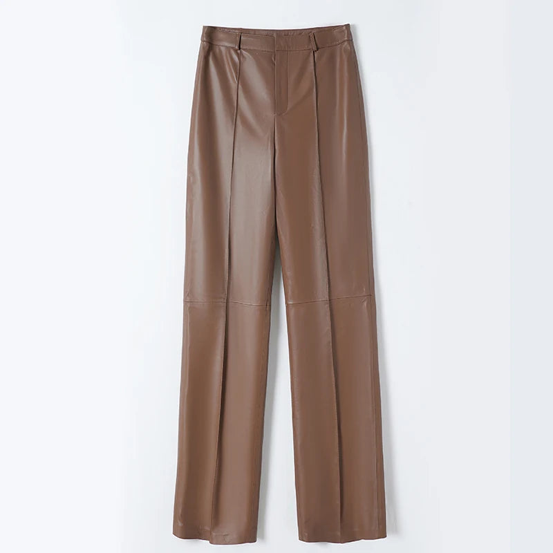 Women's Slim Long Legs Casual Sheepskin Leather Straight Trousers for Spring Autumn