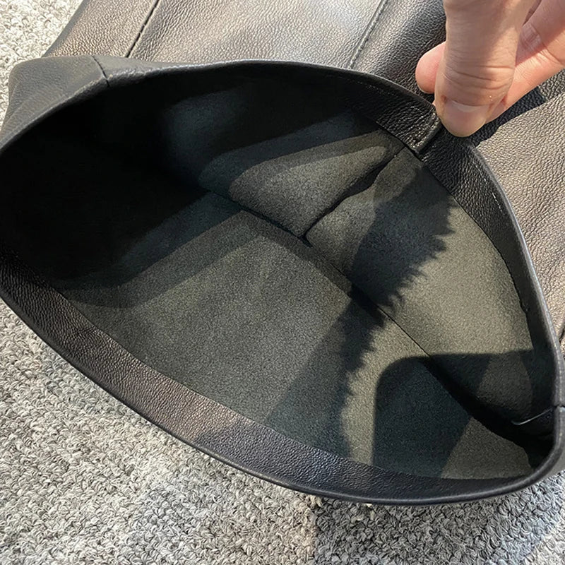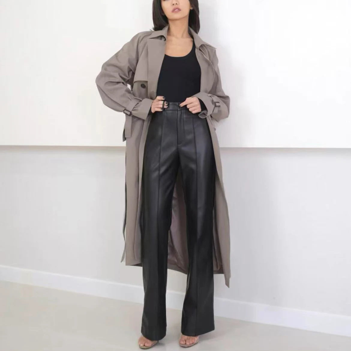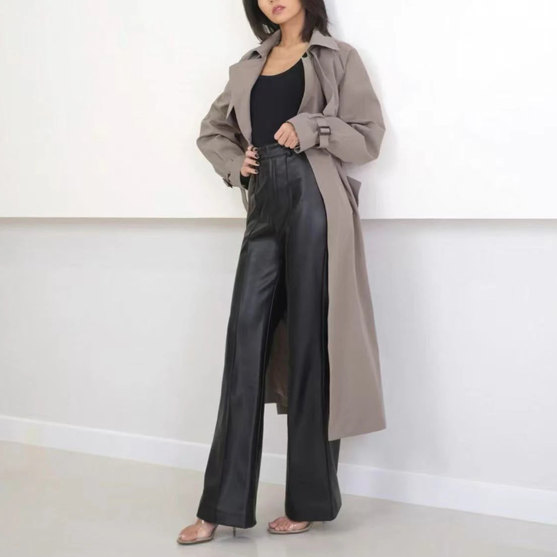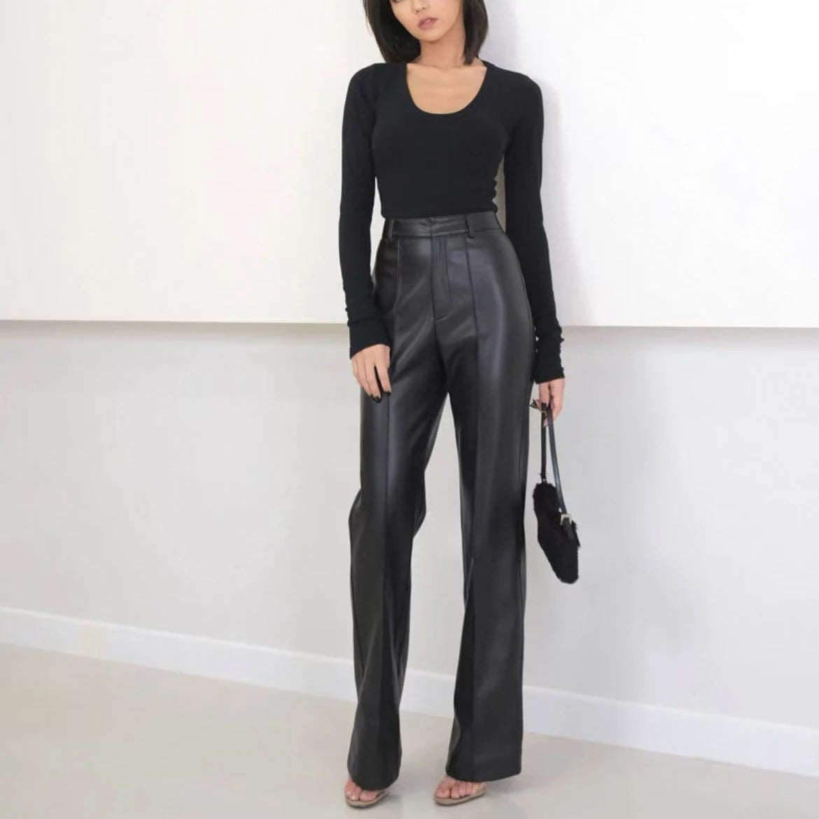 Women's Slim Long Legs Casual Sheepskin Leather Straight Trousers for Spring Autumn