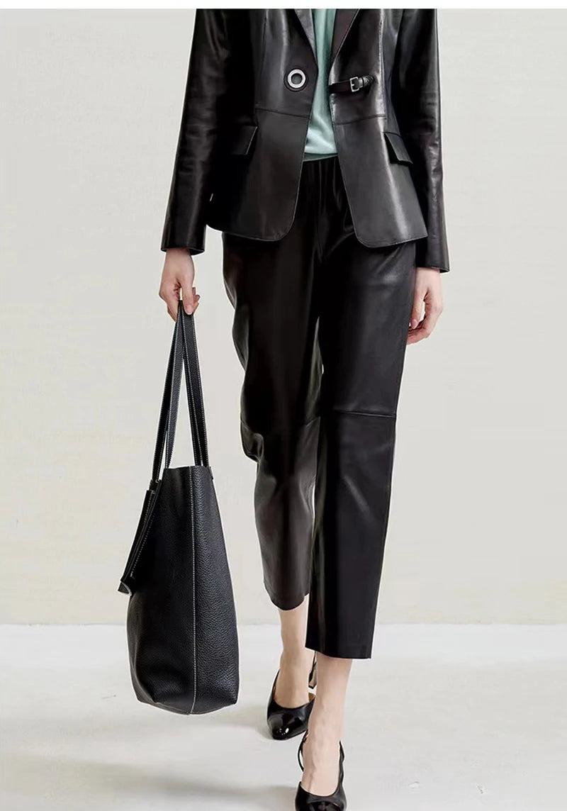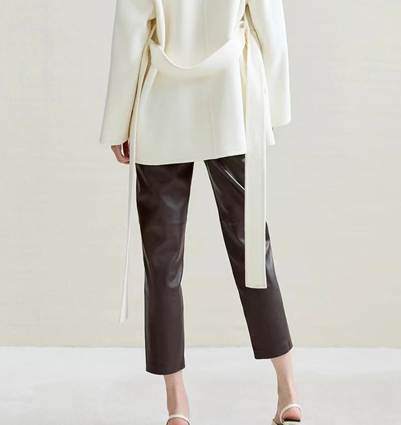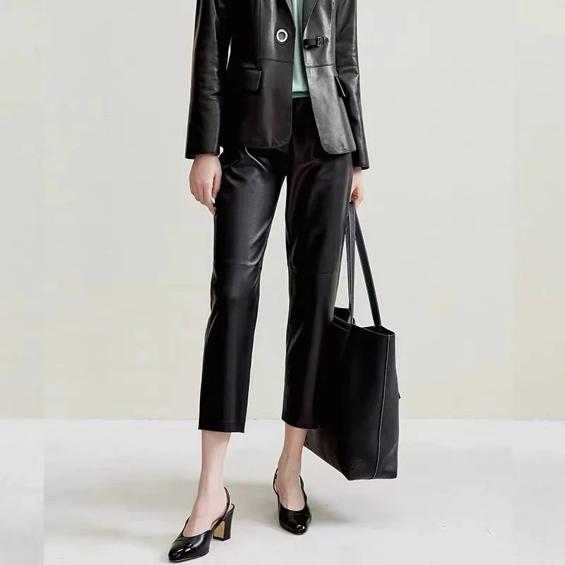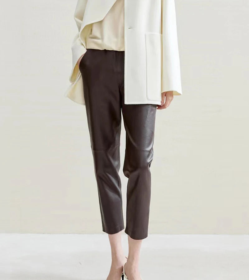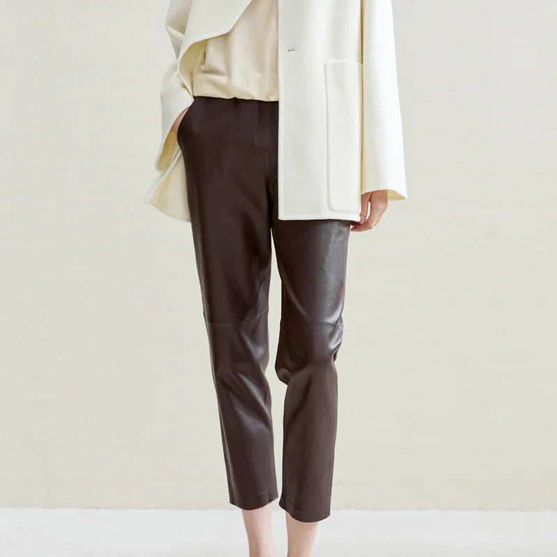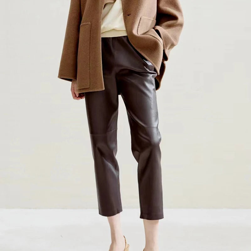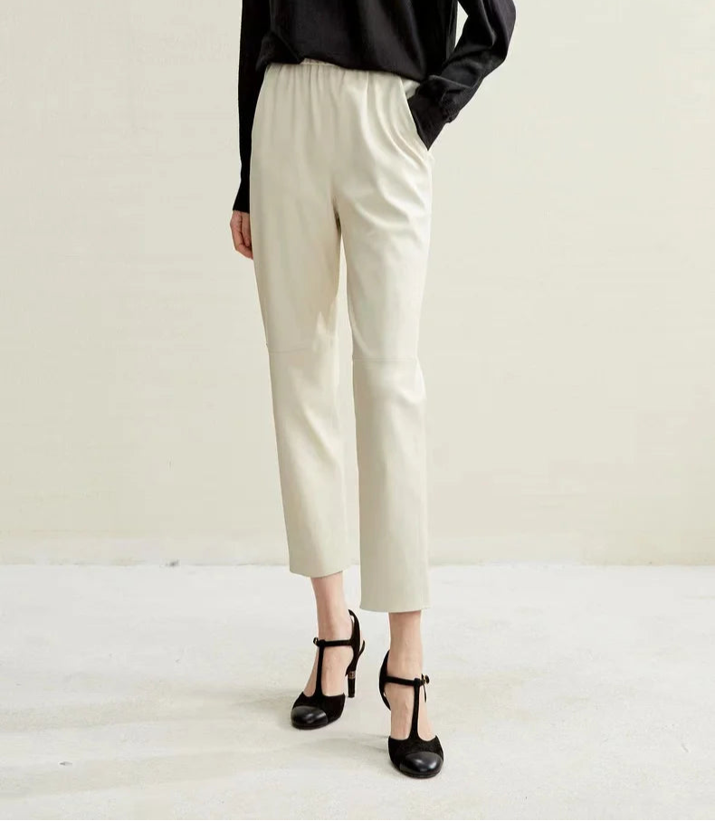Women's Streetwear Elastic Waist Thin Feet Stretchy Sheepskin Leather Pants