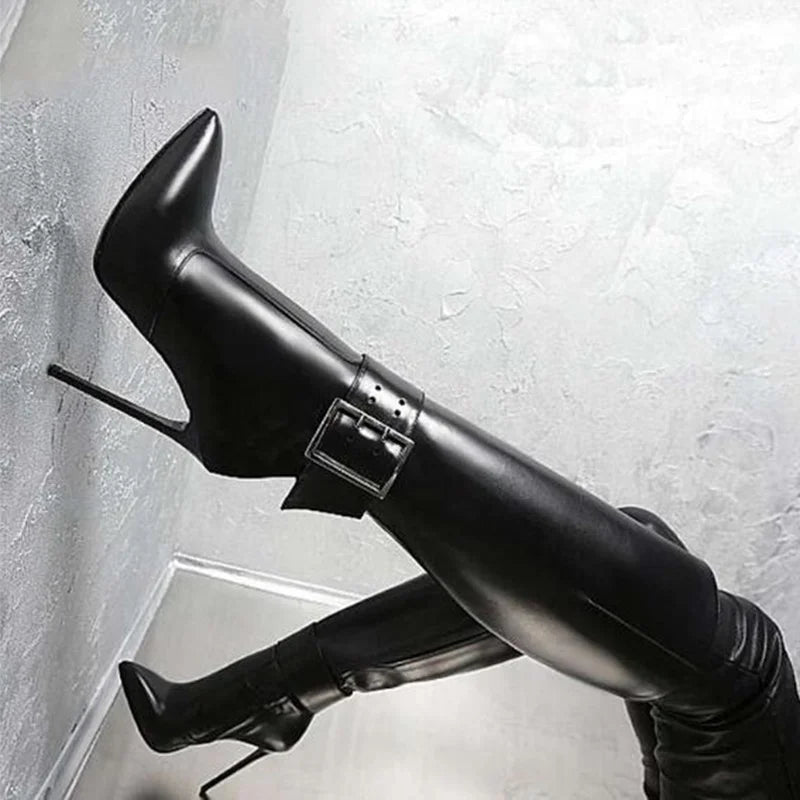 Sexy Pointy Toe Buckle Stiletto High Heels Knee-High Boots for Women
