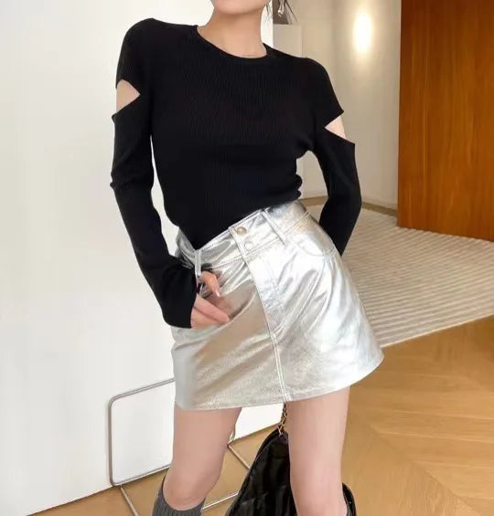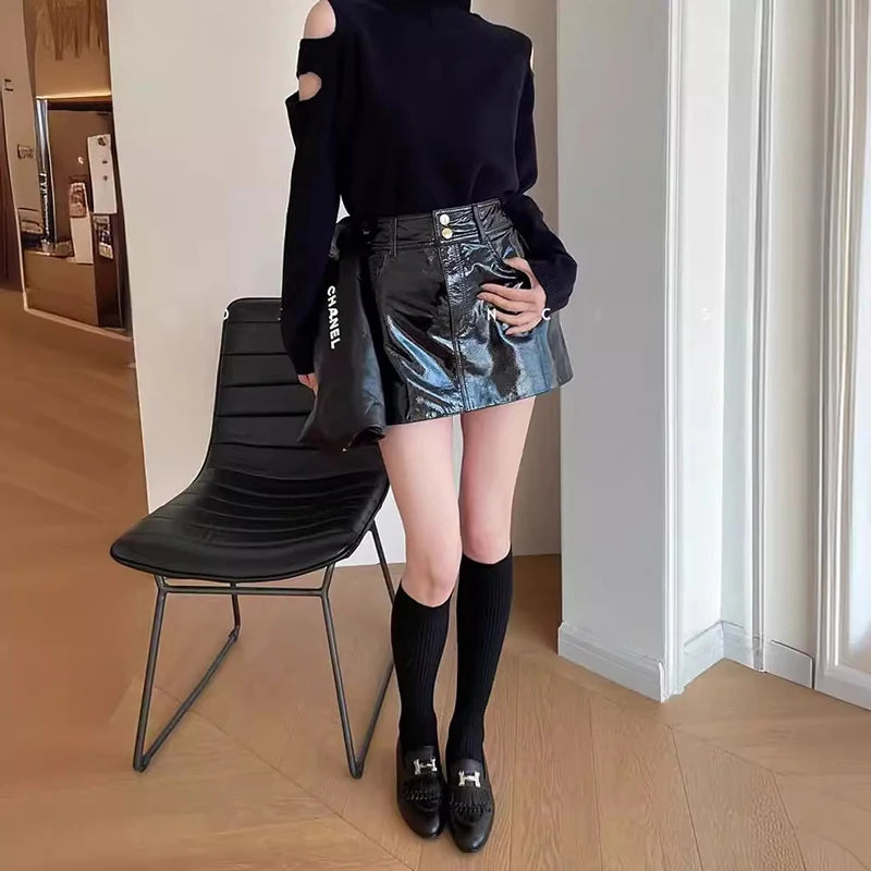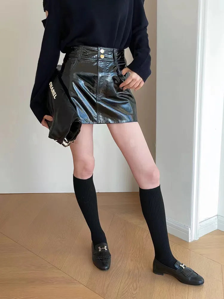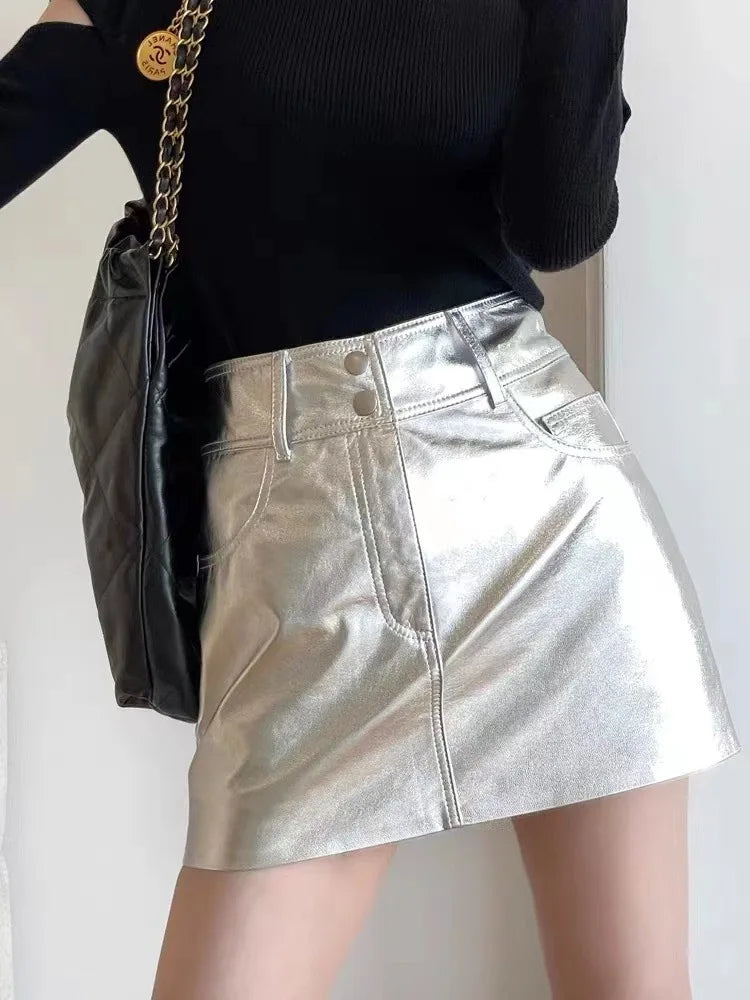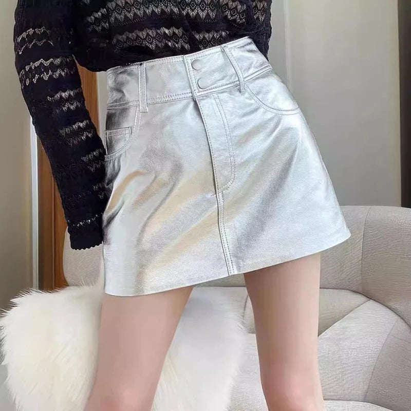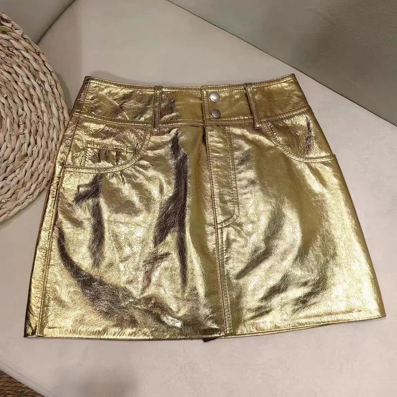 Designed for modern women, this elegant and stylish mini skirt is a great bottom wear for parties. Featuring a sheepskin leather design with a shiny finish, it offers both durability and style. The A-line silhouette and the high waistline create a fashionable and neat look. Order now!