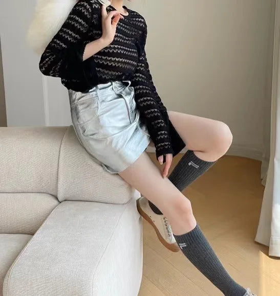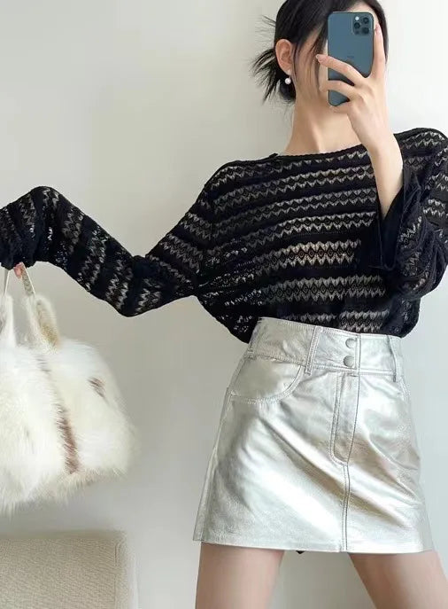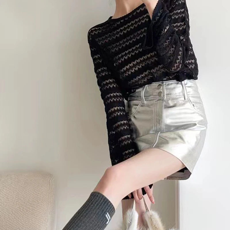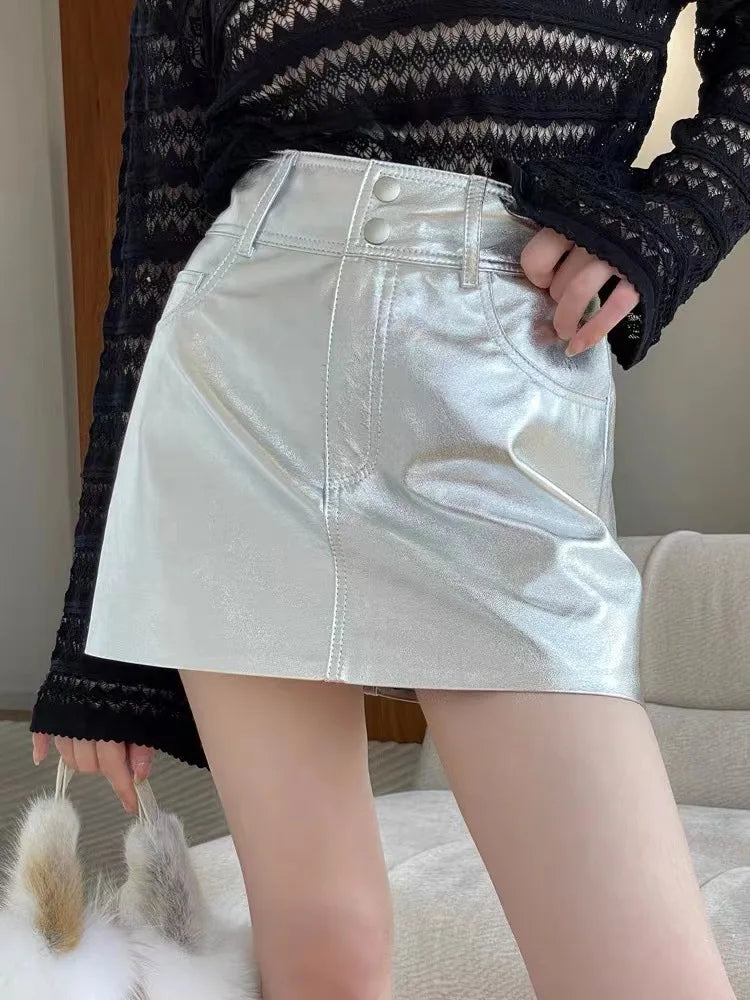Women’s Spring Summer Sheepskin A-Line Wrap Hip High Waist Short Jupe Skirt