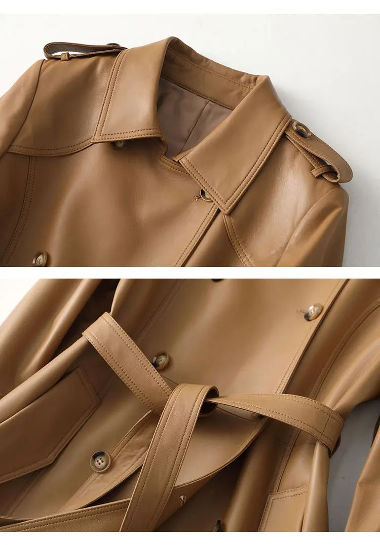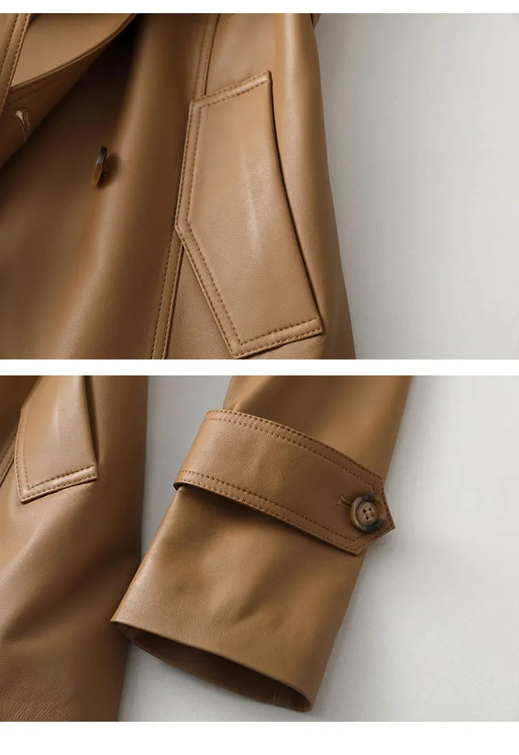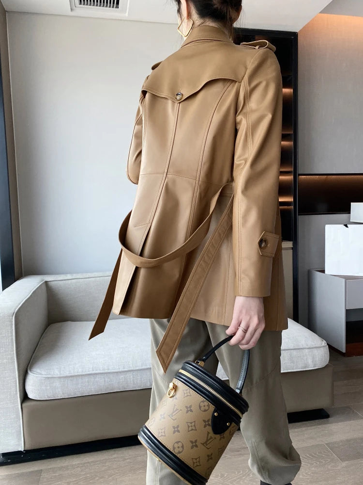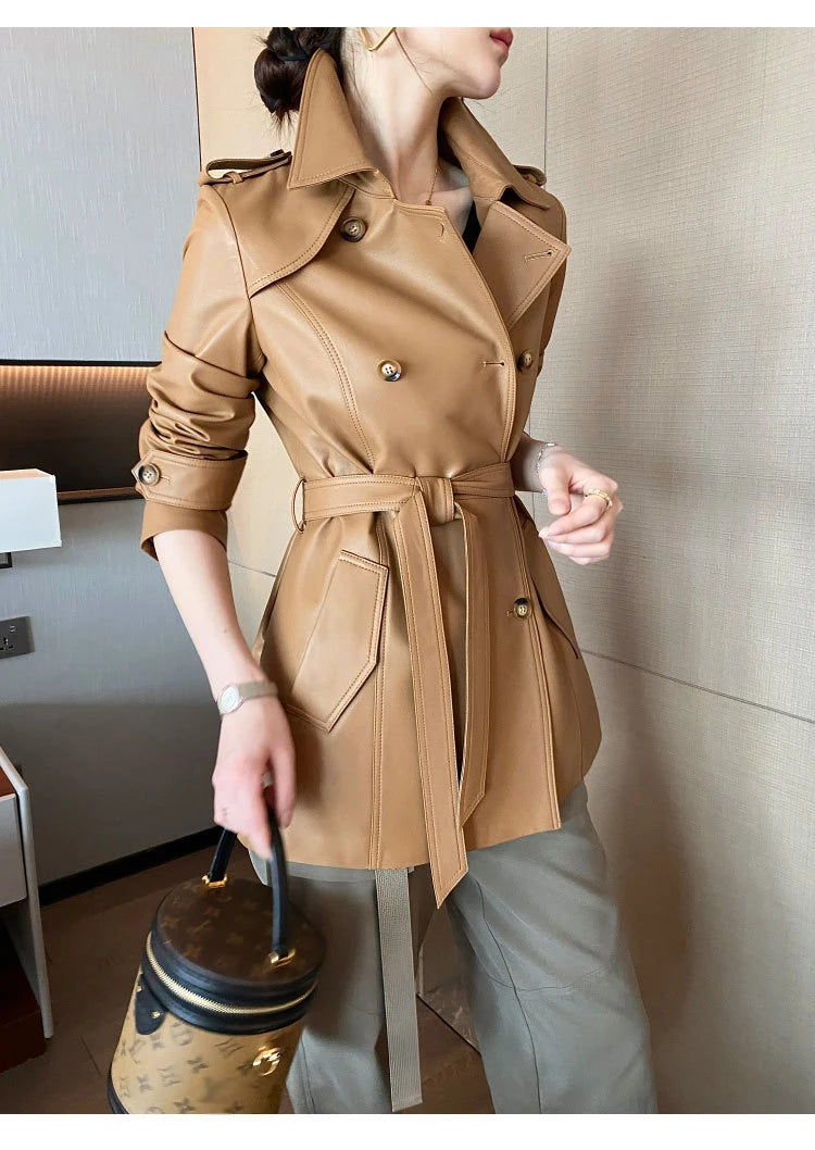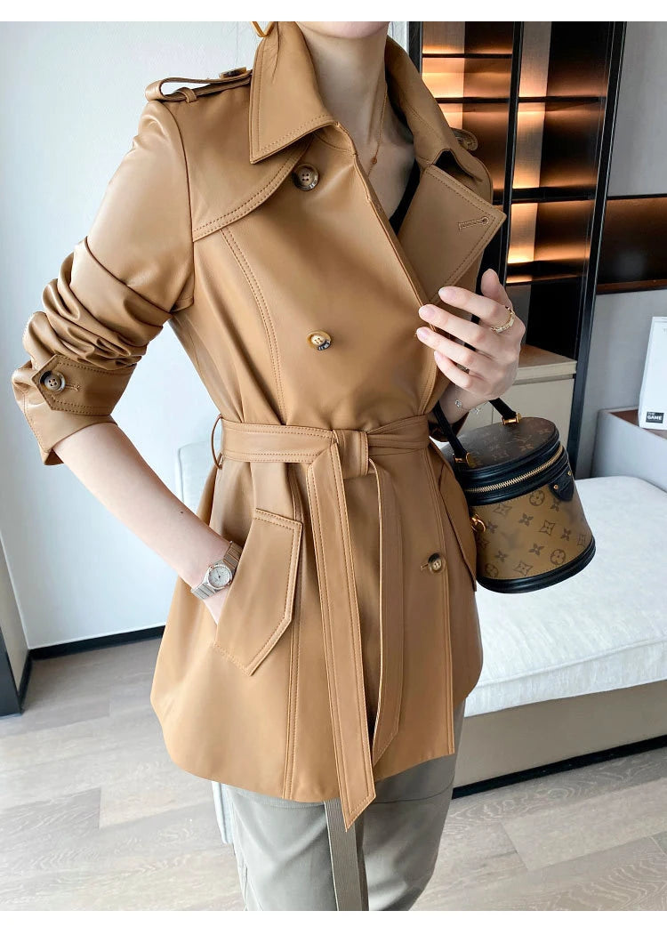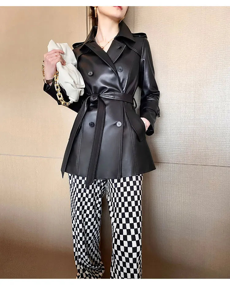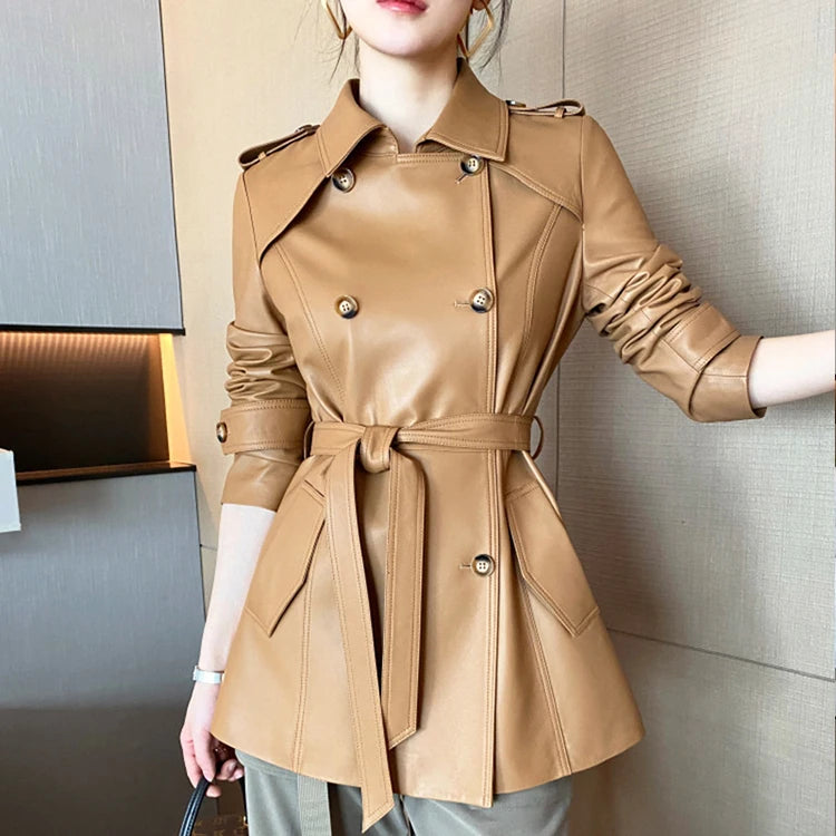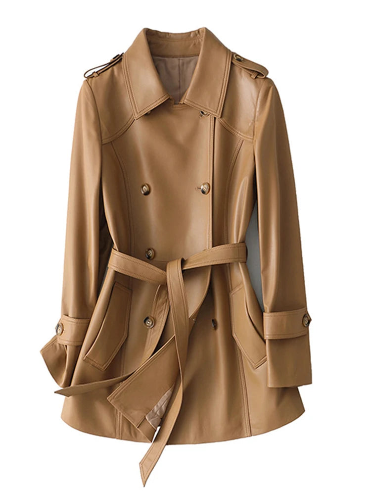 Lapel Double-Breasted Belt Waist-Closing Sheepskin Trench Coat for Women