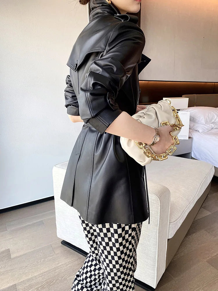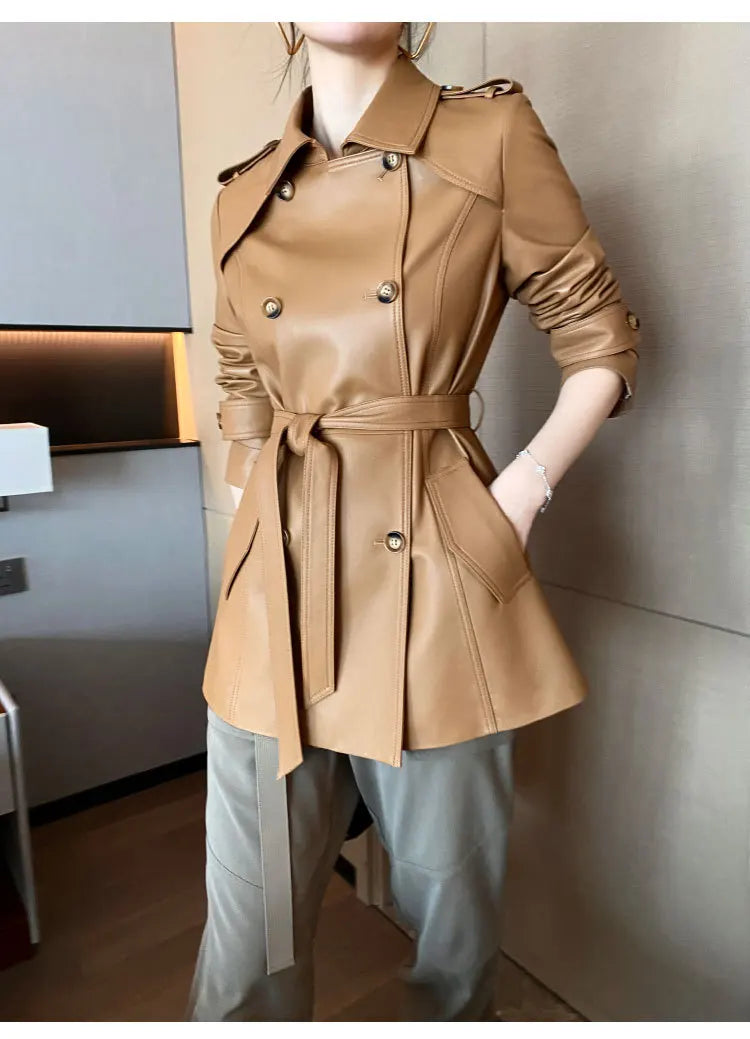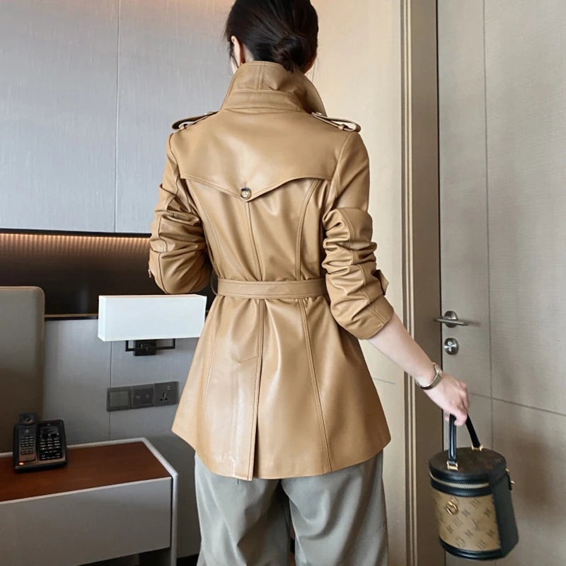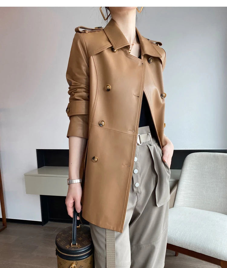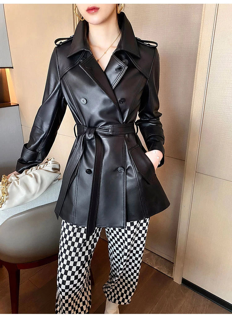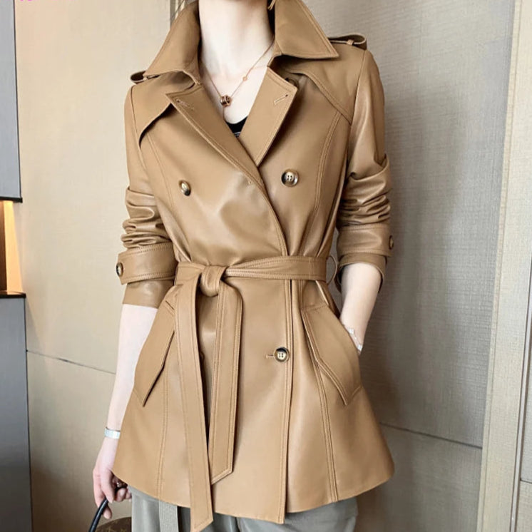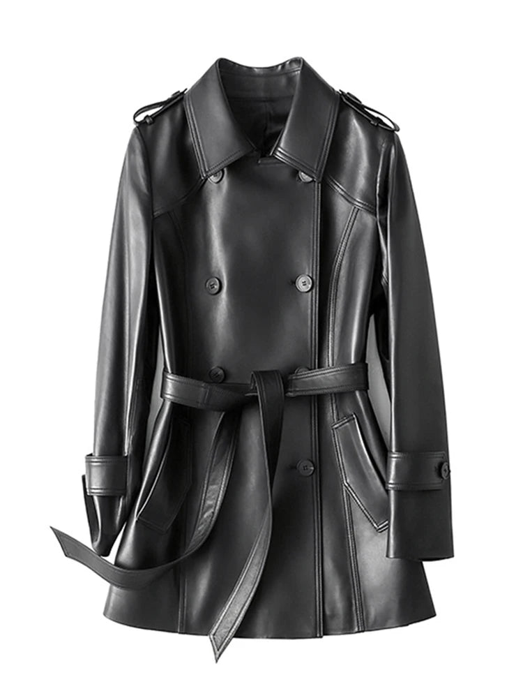 Lapel Double-Breasted Belt Waist-Closing Sheepskin Trench Coat for Women