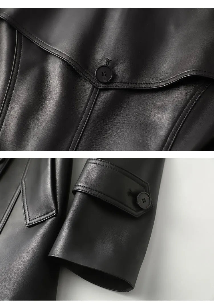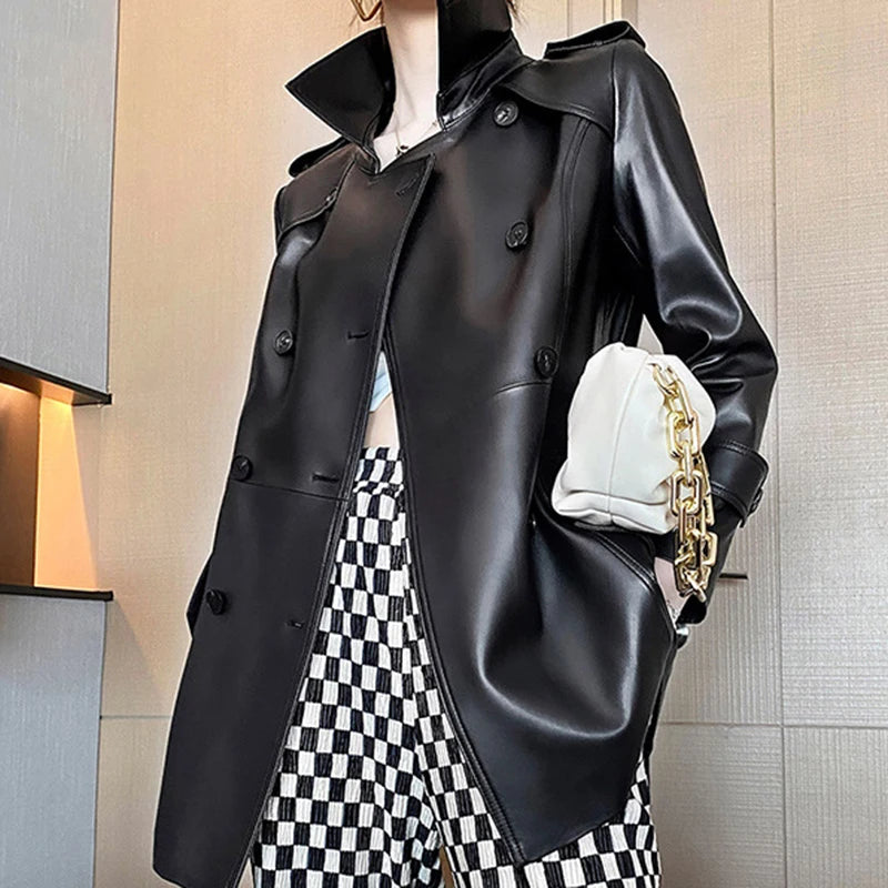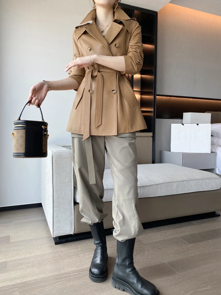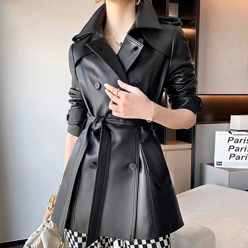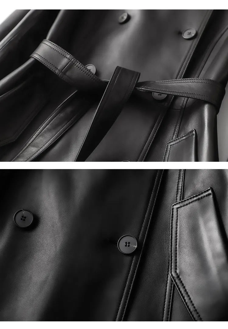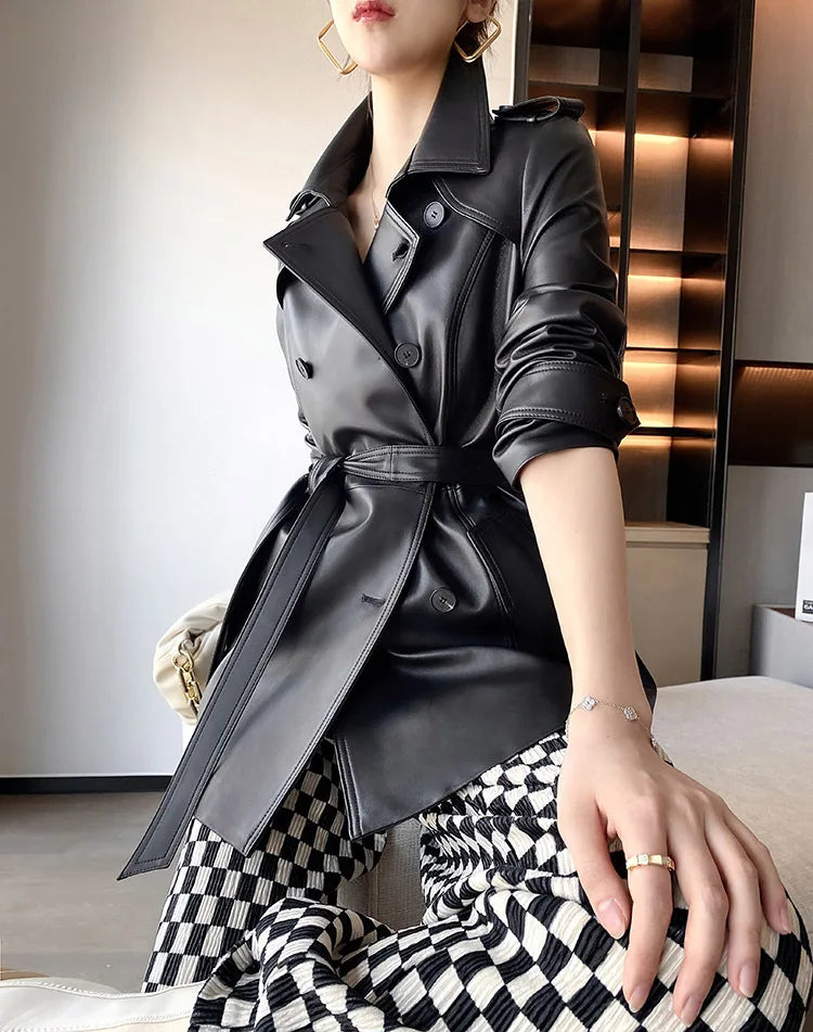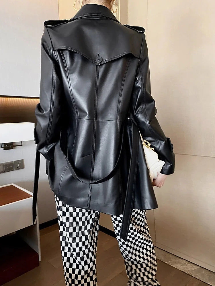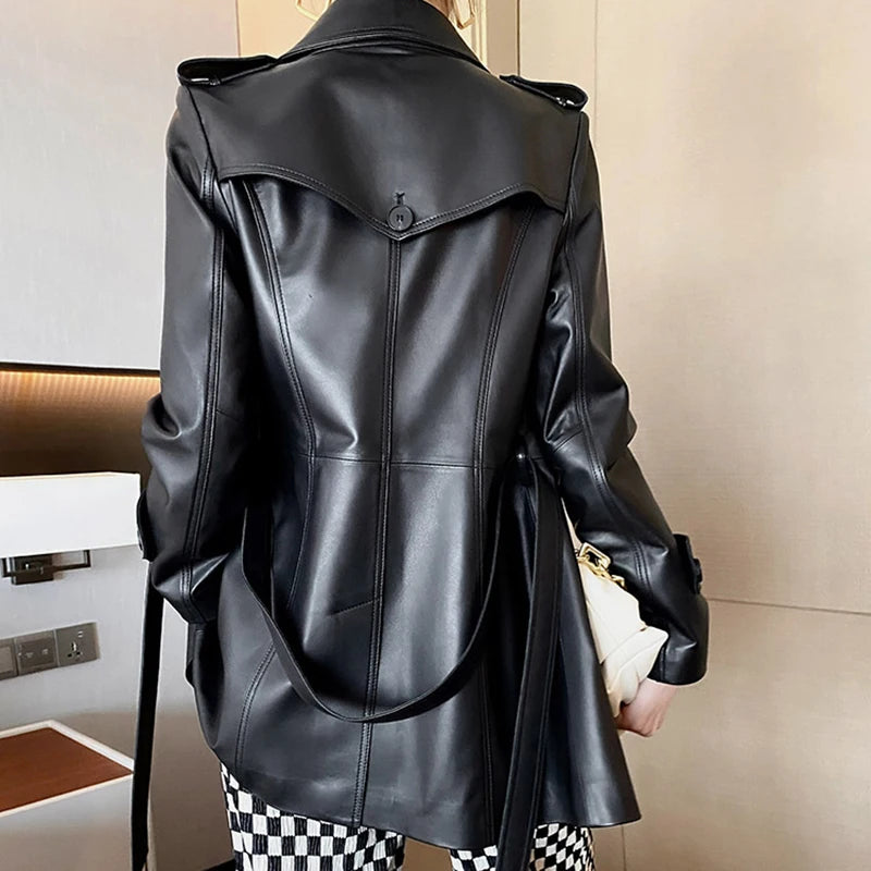 Lapel Double-Breasted Belt Waist-Closing Sheepskin Trench Coat for Women