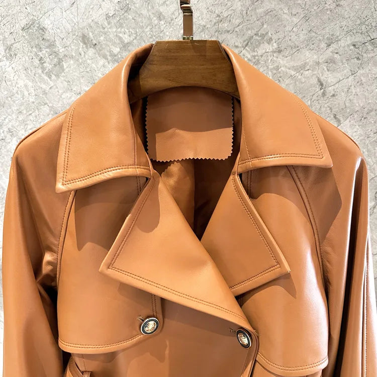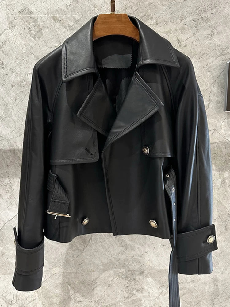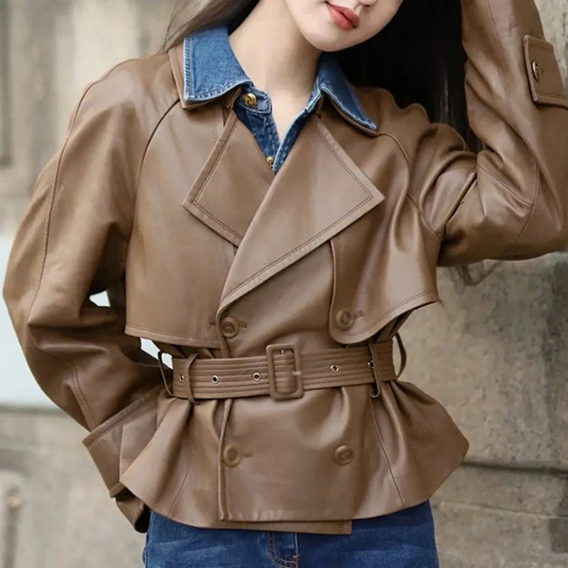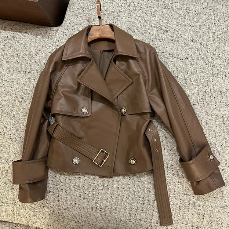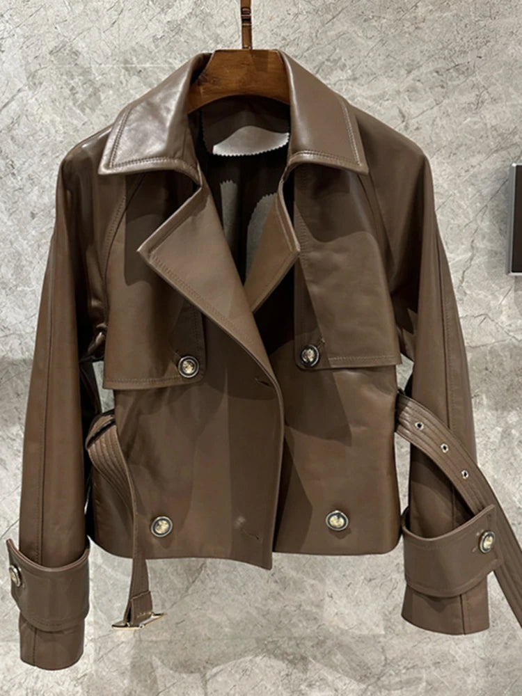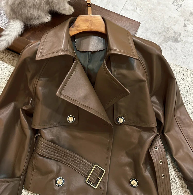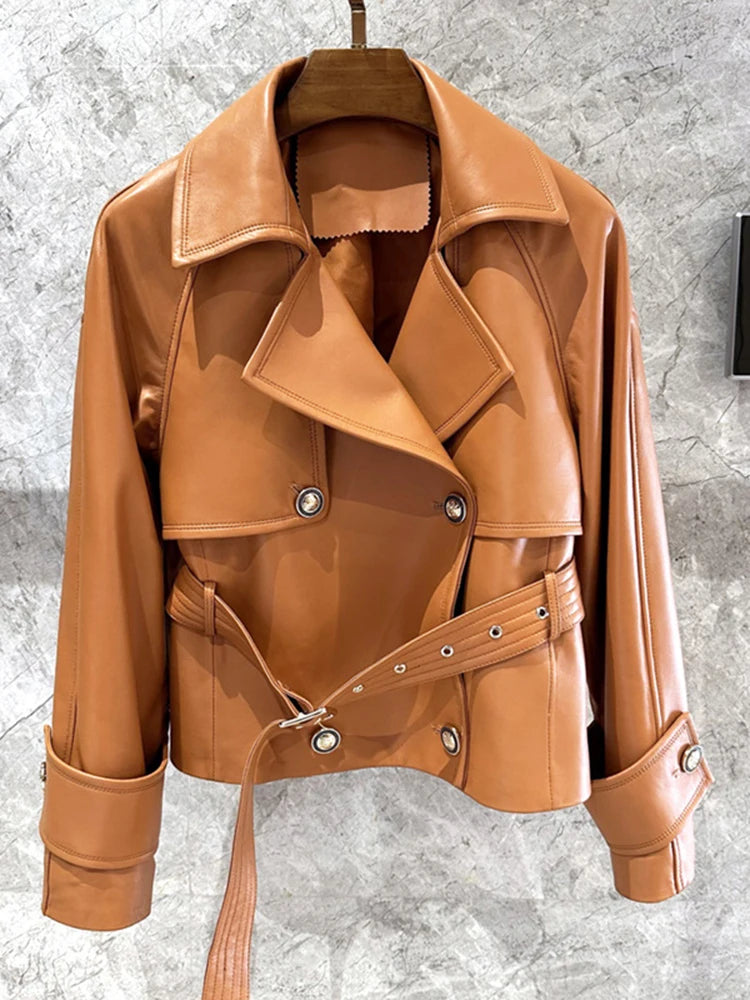 Women's Double-Breasted Belted Waist-Closing Sheepskin Loose Short Trench Coat