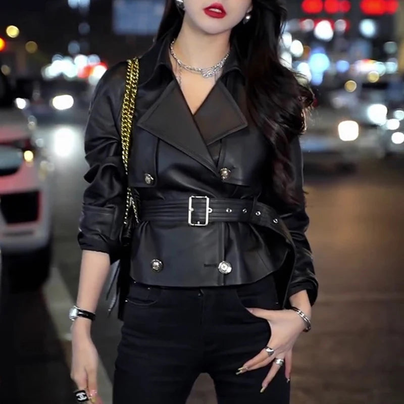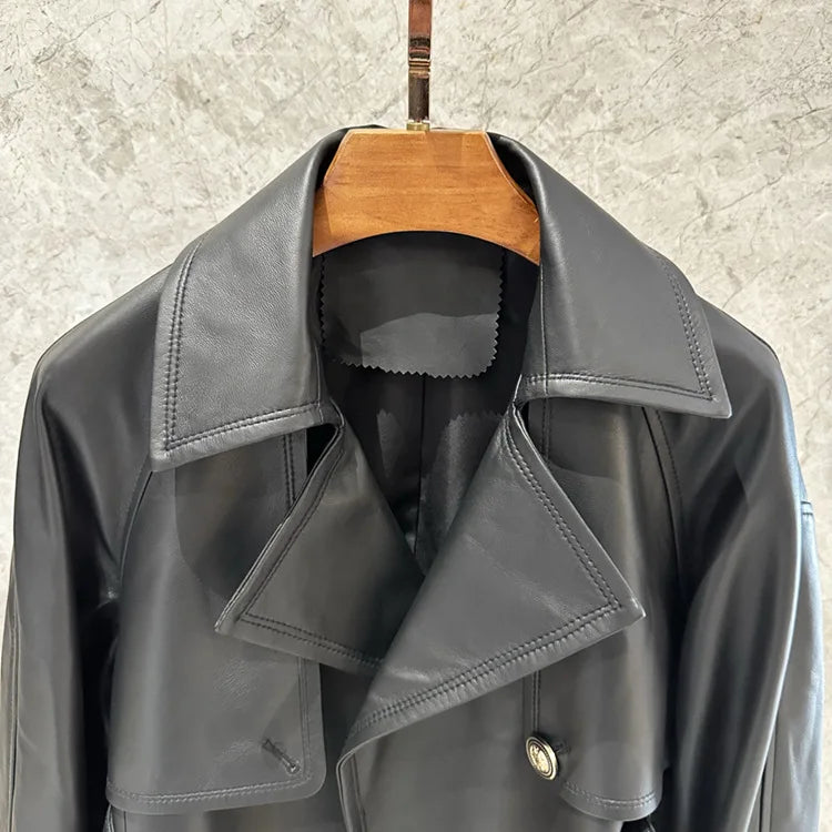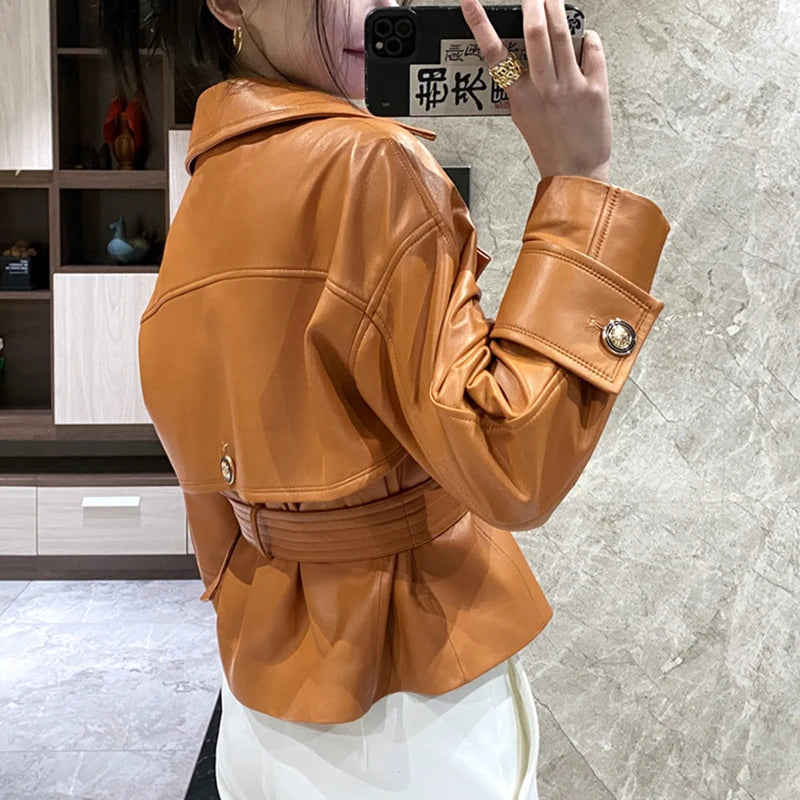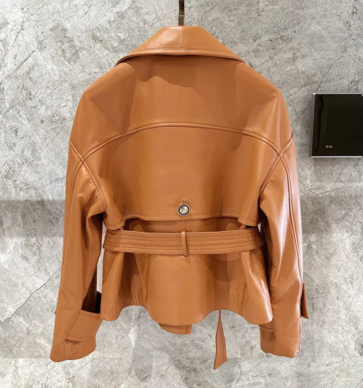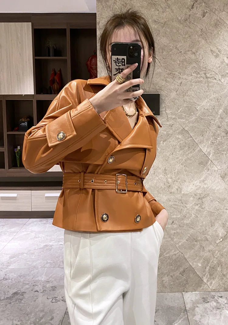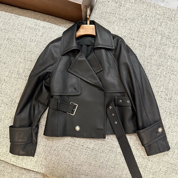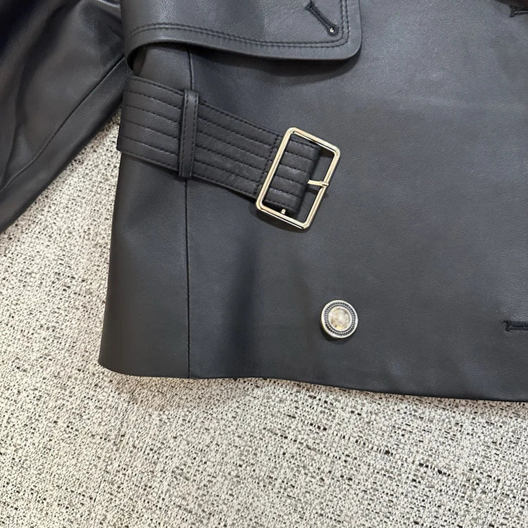 Women's Double-Breasted Belted Waist-Closing Sheepskin Loose Short Trench Coat