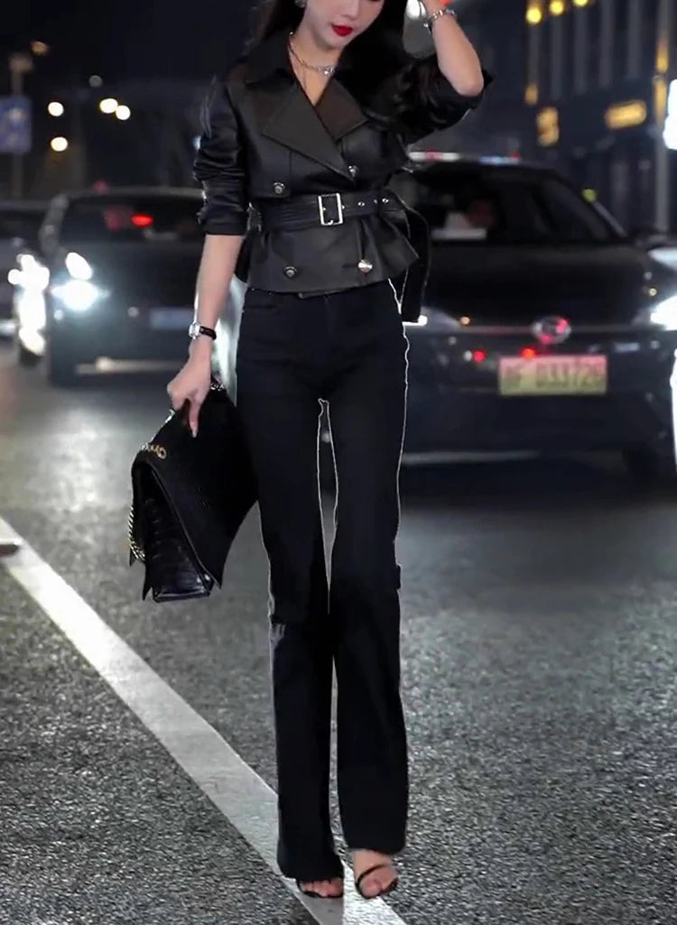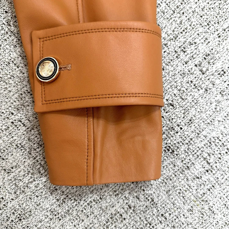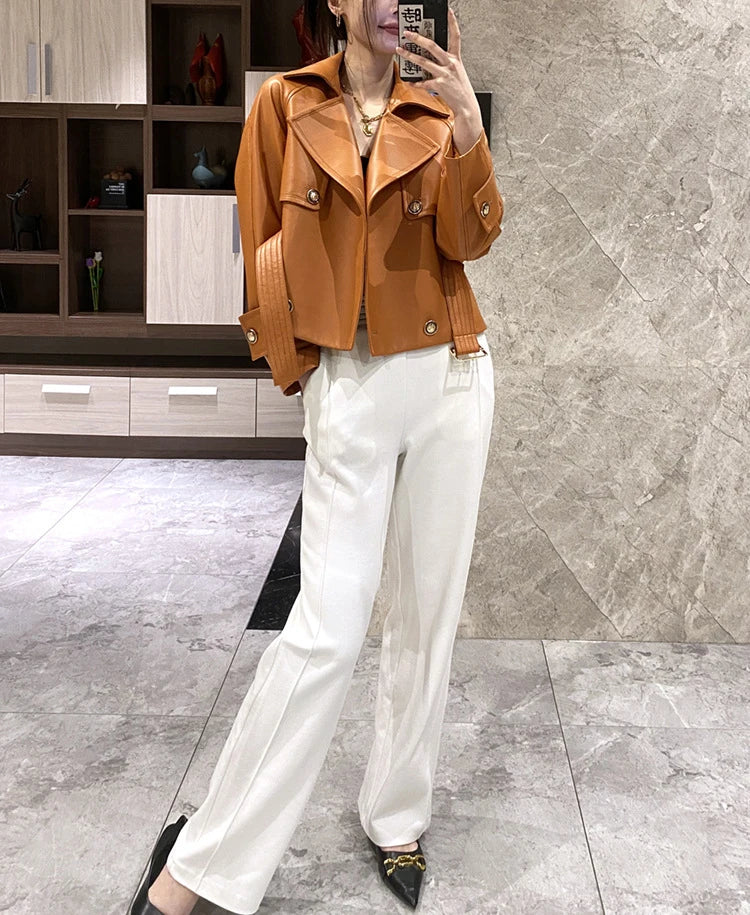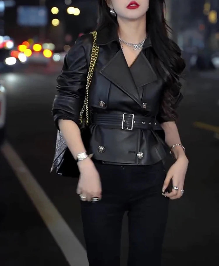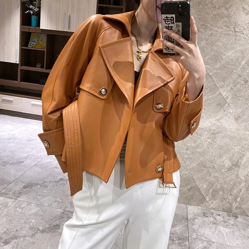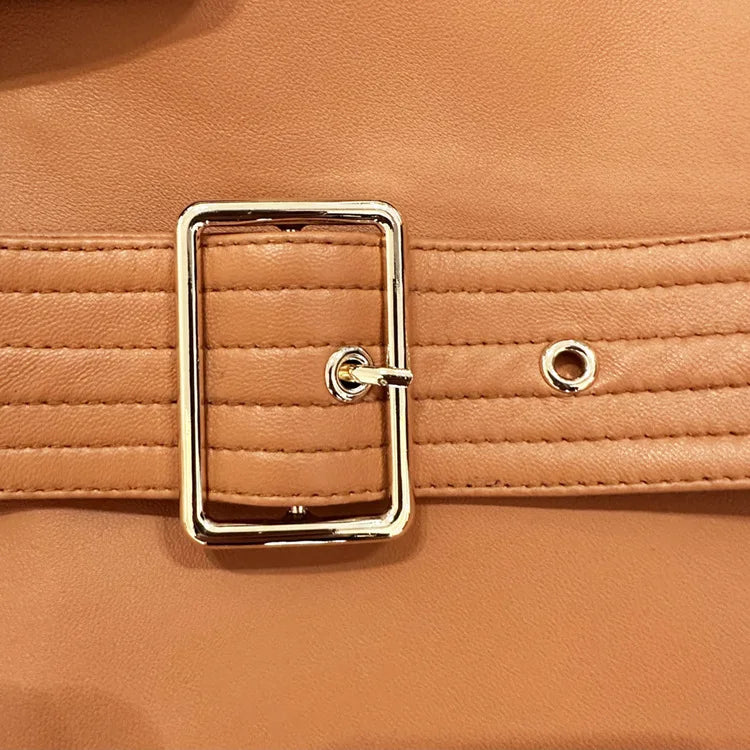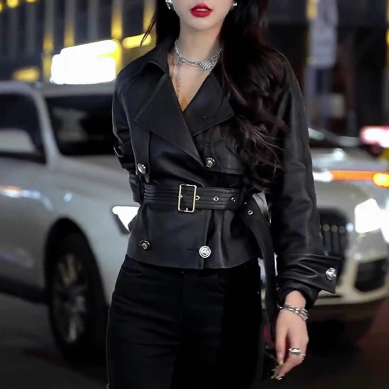 Women's Double-Breasted Belted Waist-Closing Sheepskin Loose Short Trench Coat