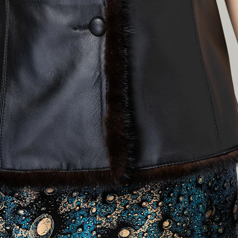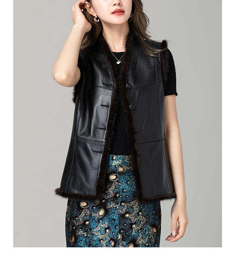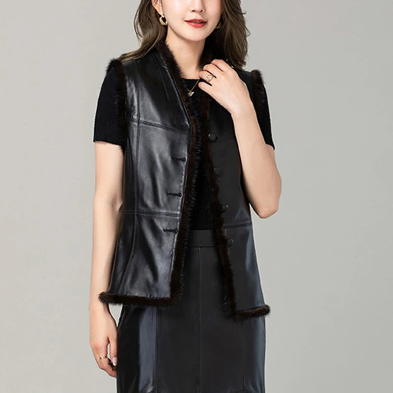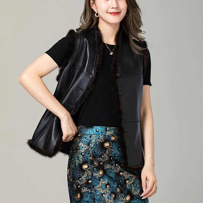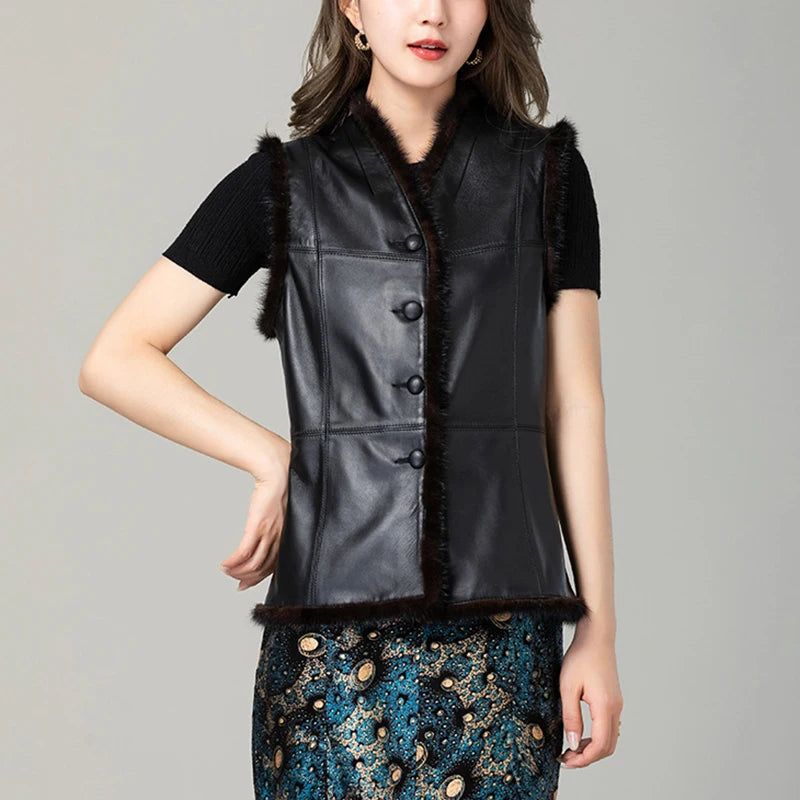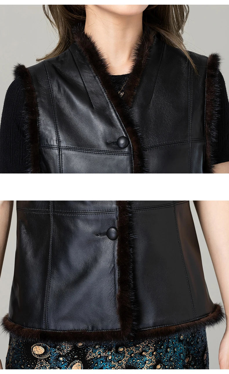 Women's European Fashion Black Genuine Leather Thin Waistcoat Vest