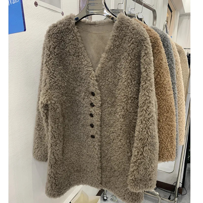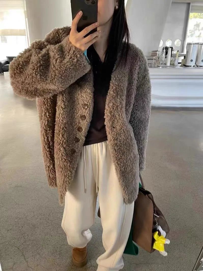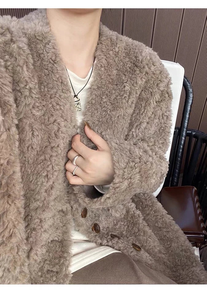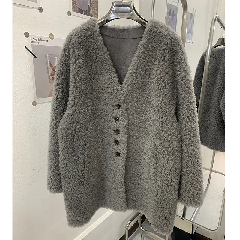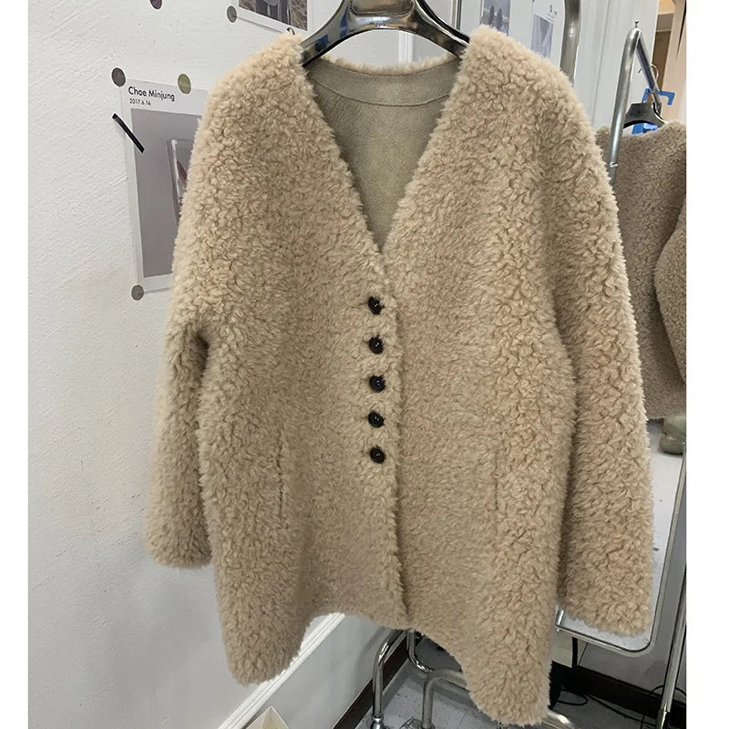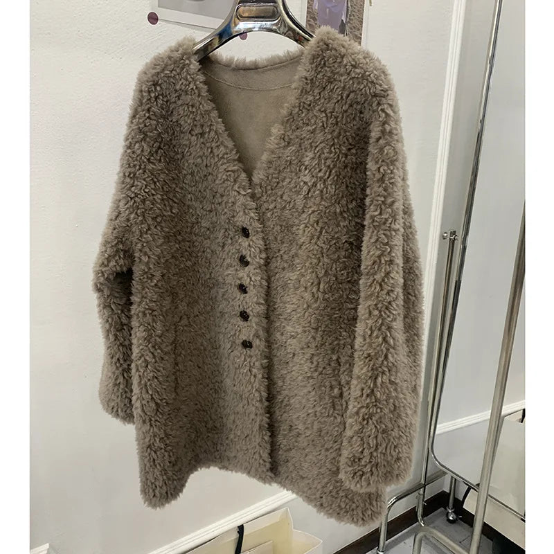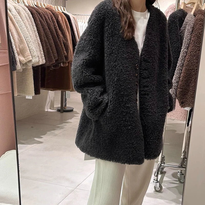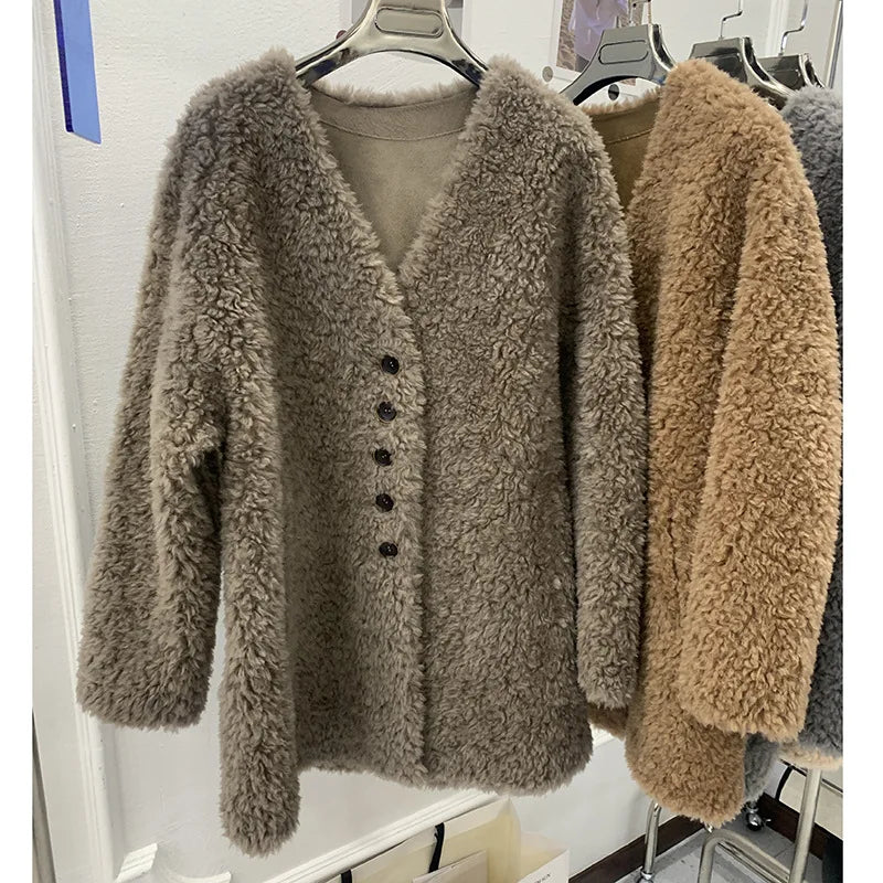 Women's Lamb Fur Autumn Winter V-Neck Single Breasted Loose Shearing Jacket