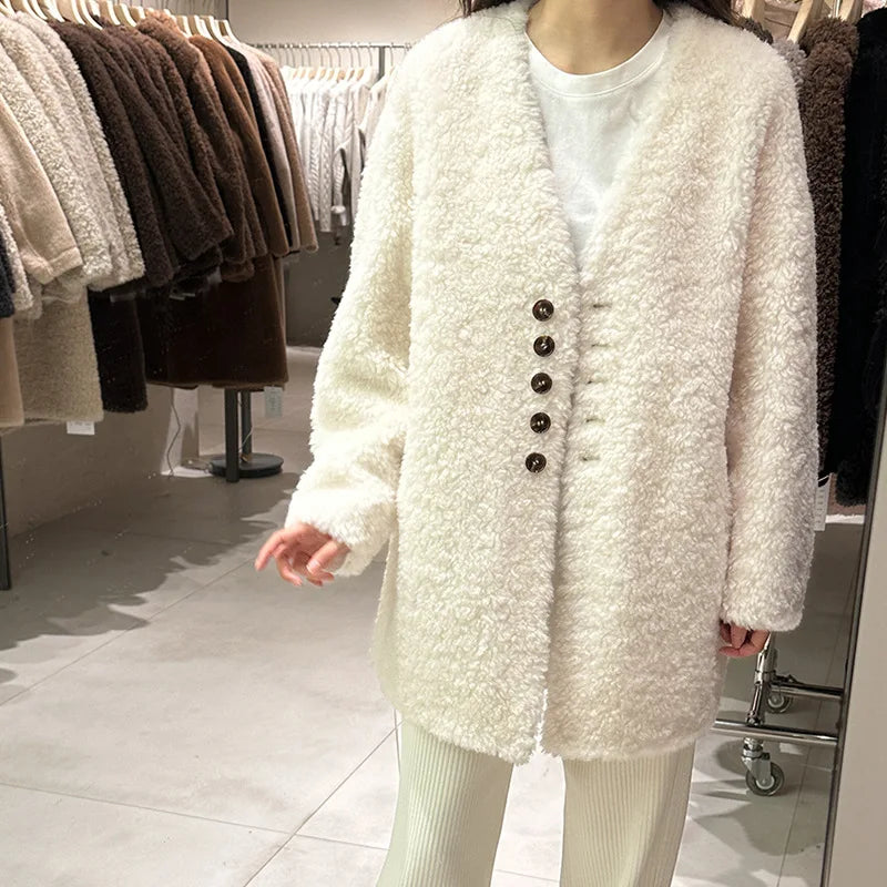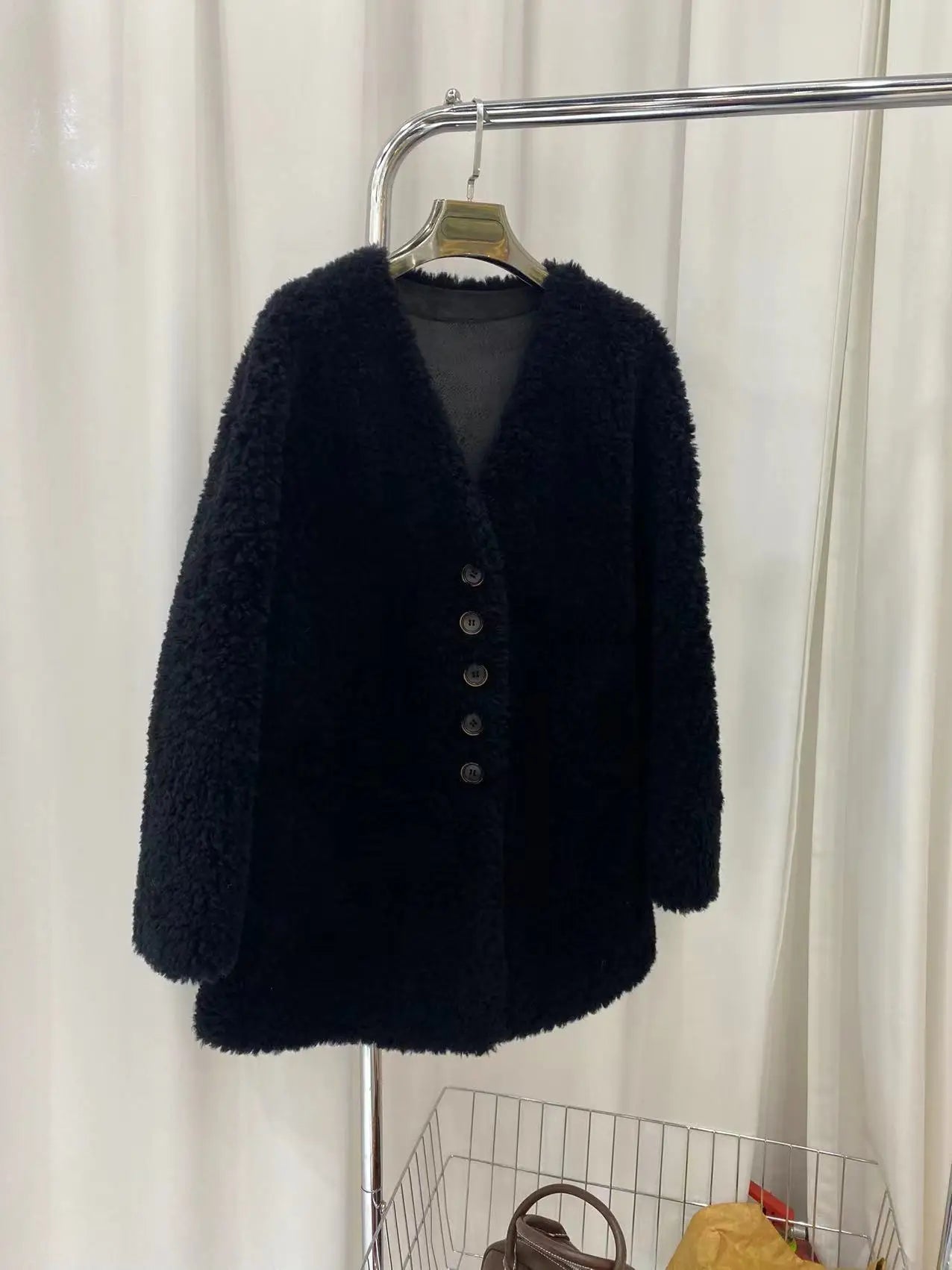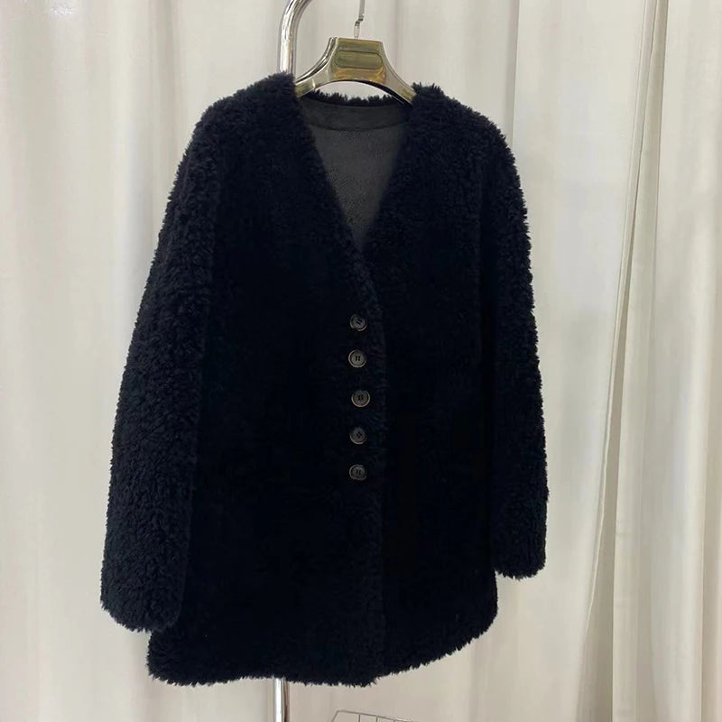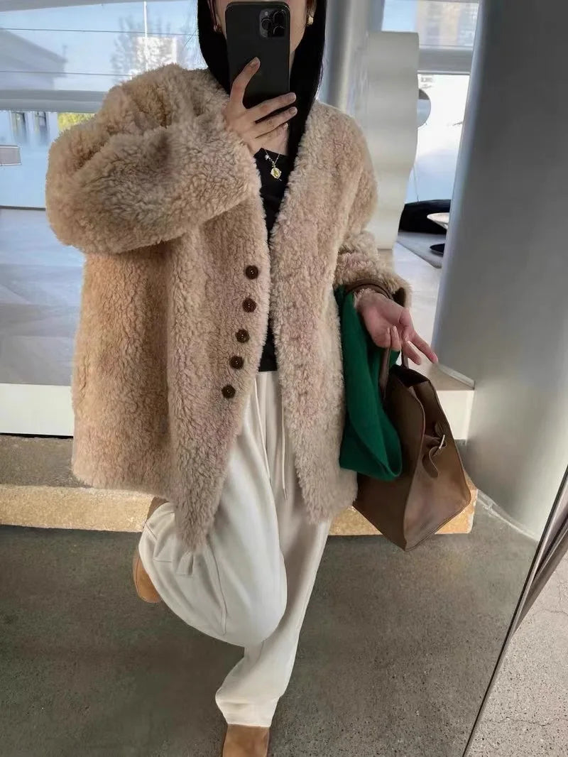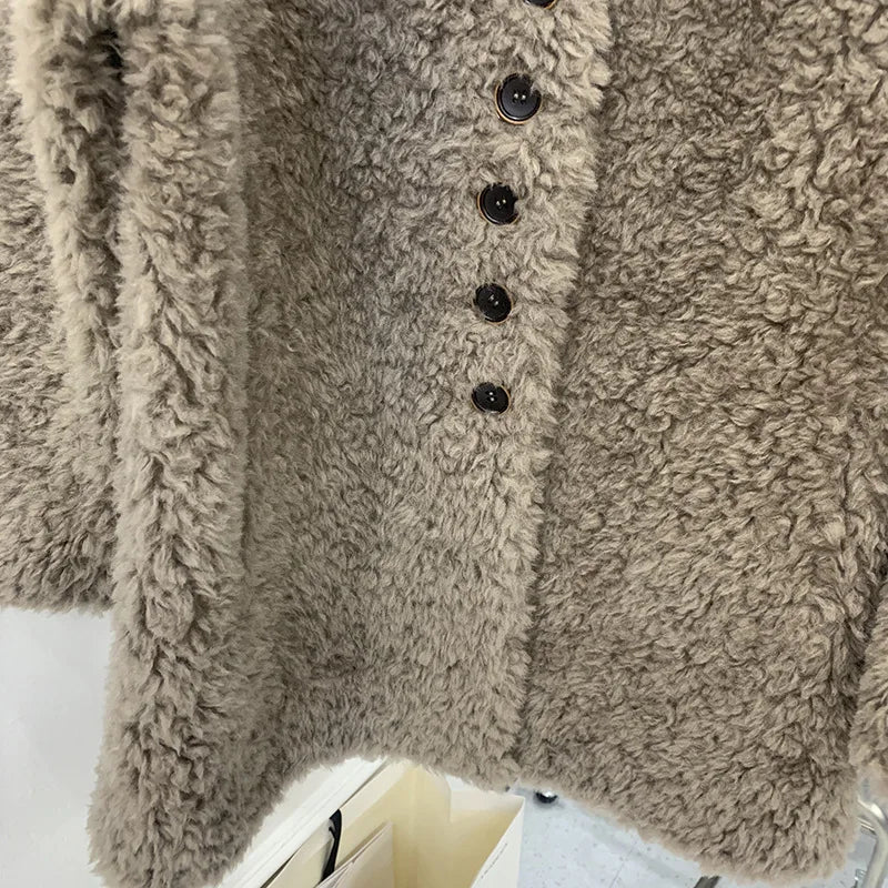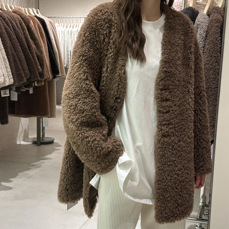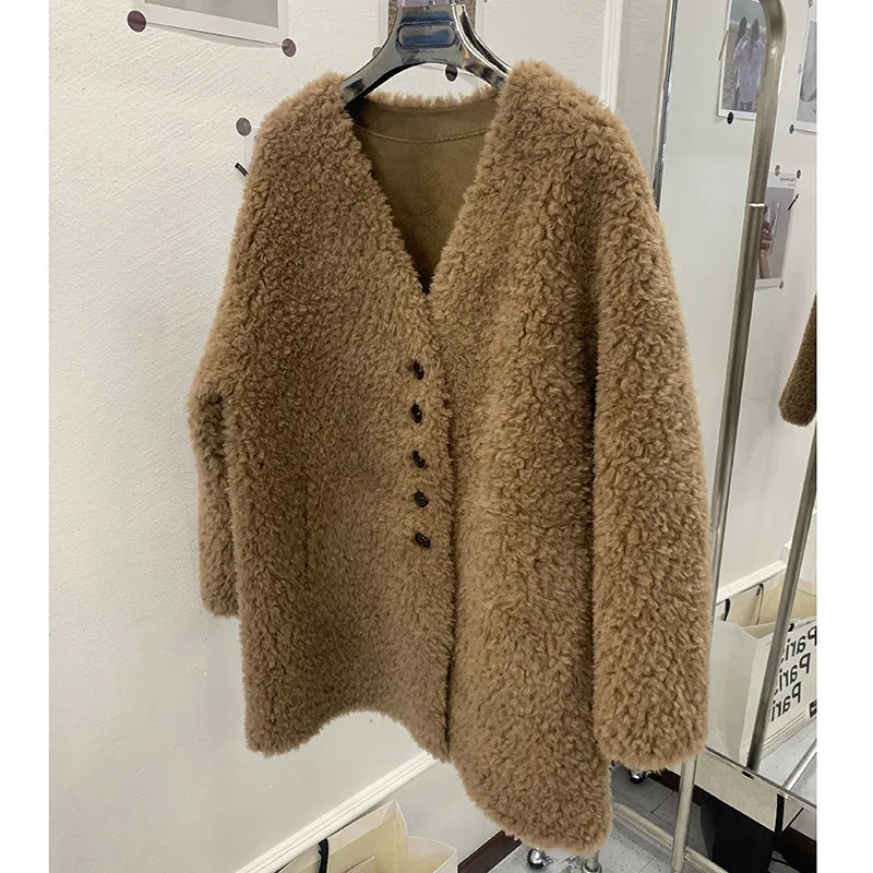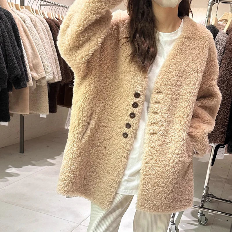 Women's Lamb Fur Autumn Winter V-Neck Single Breasted Loose Shearing Jacket