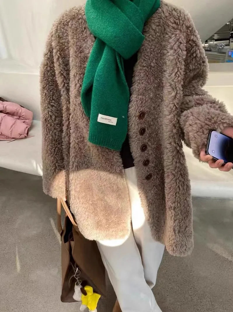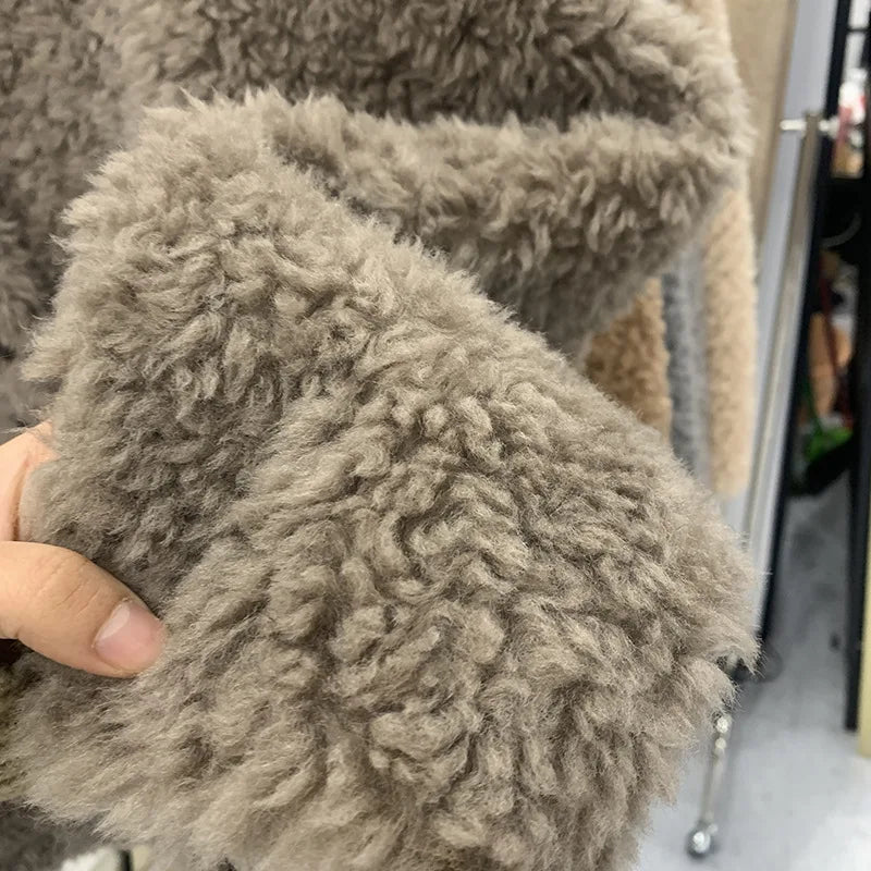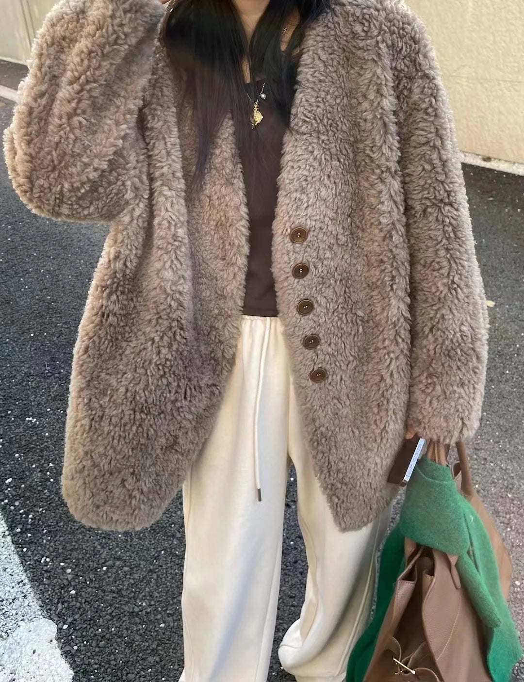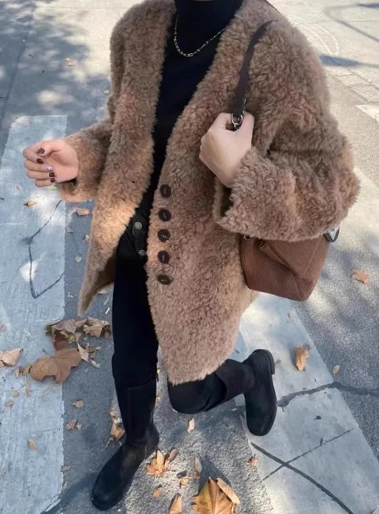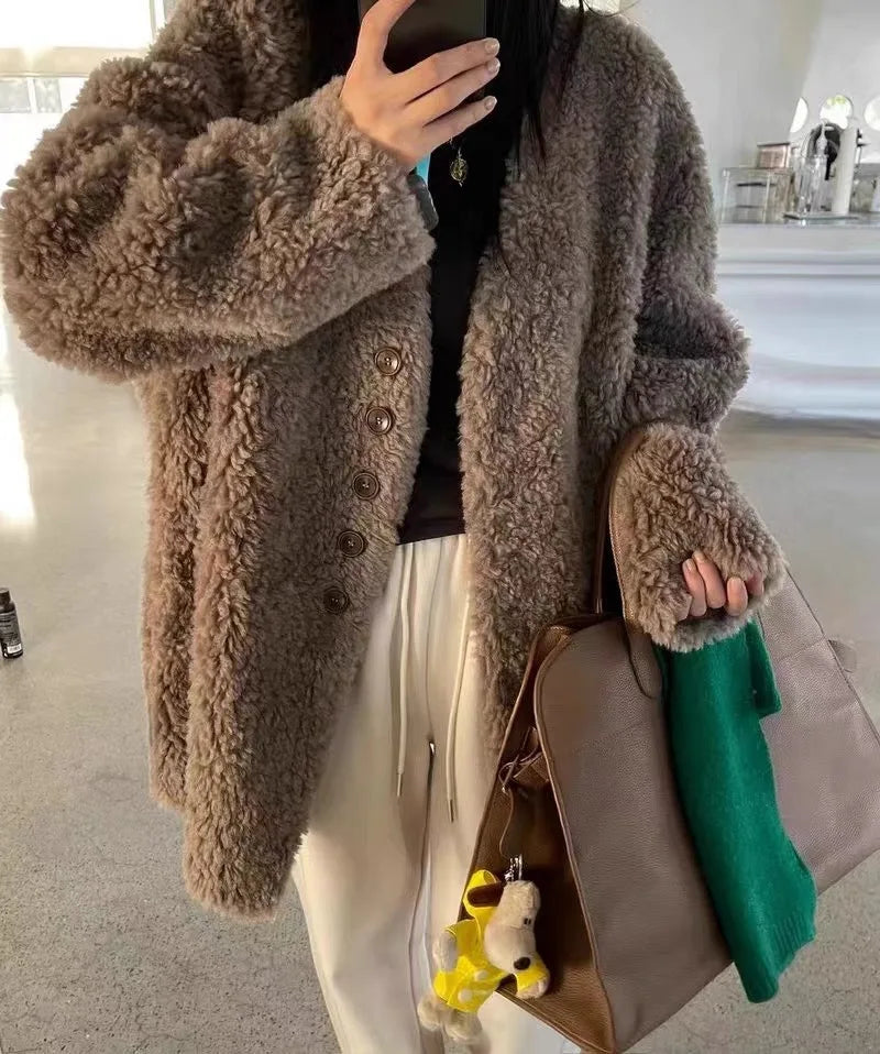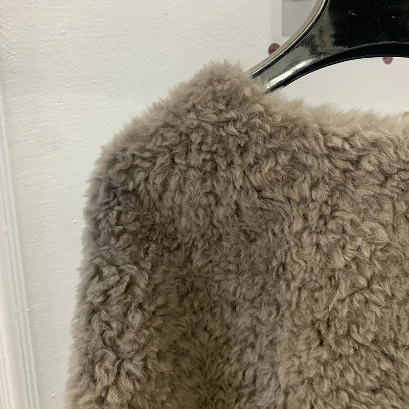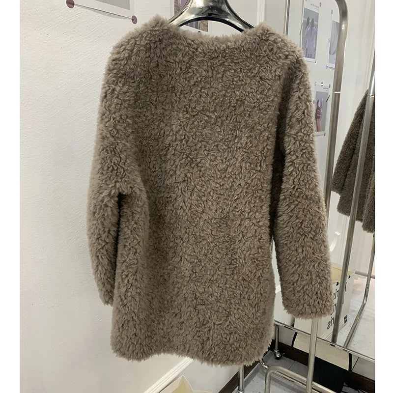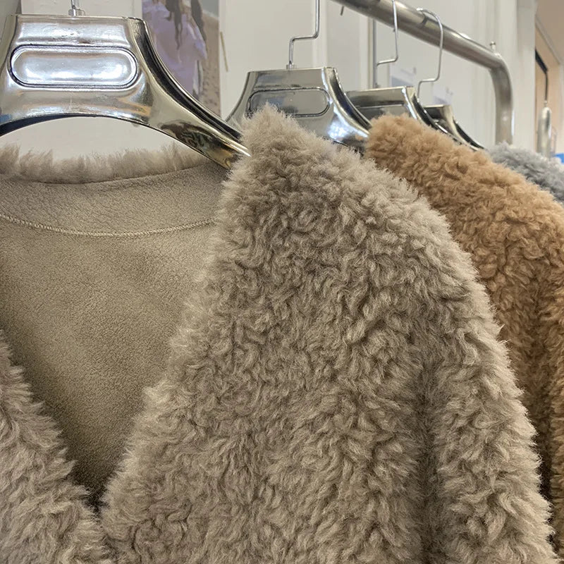 Women's Lamb Fur Autumn Winter V-Neck Single Breasted Loose Shearing Jacket