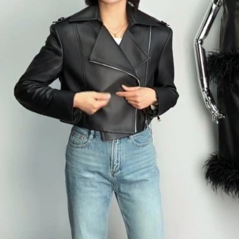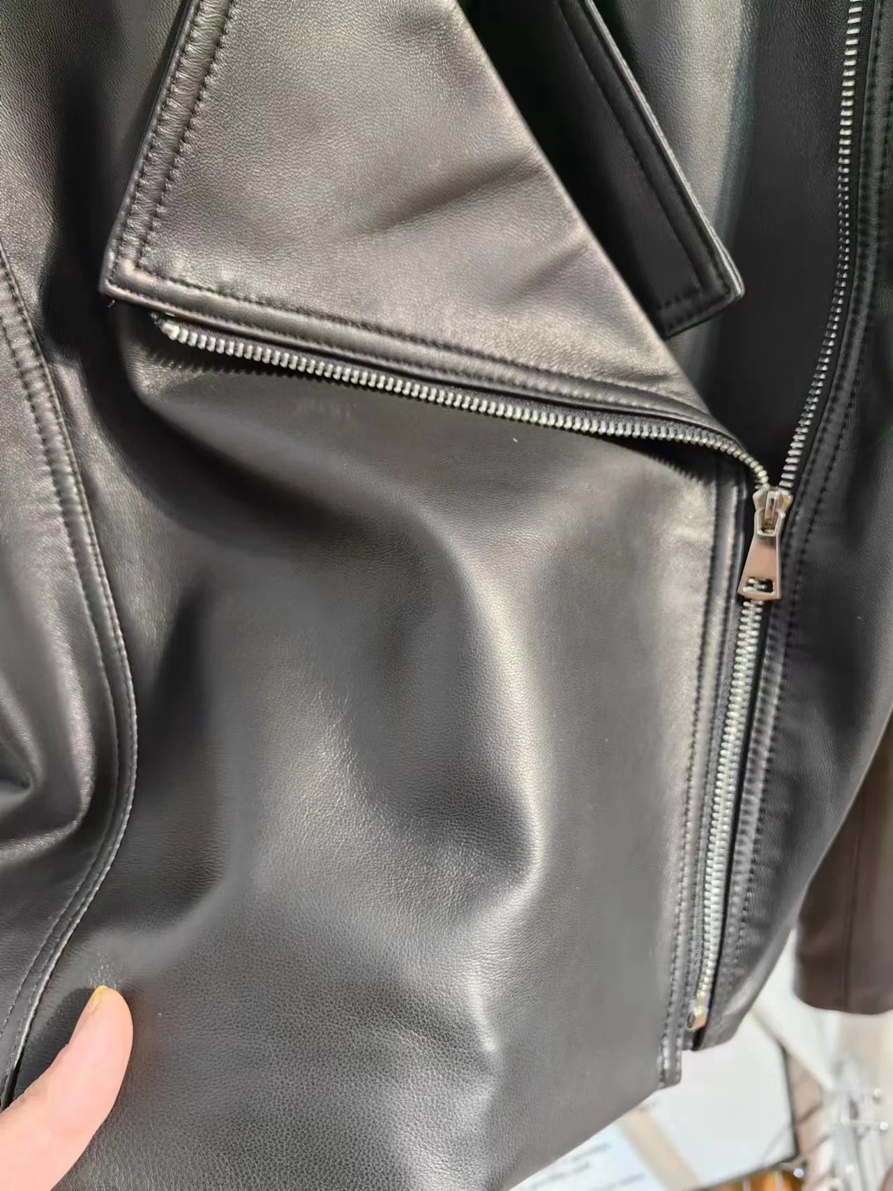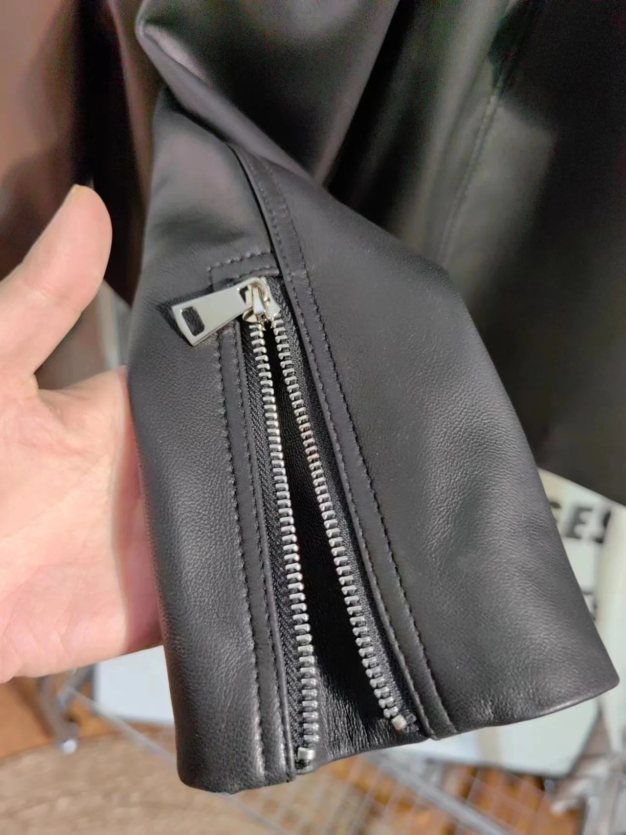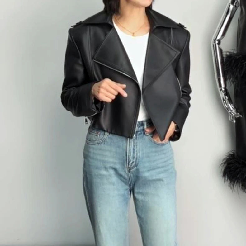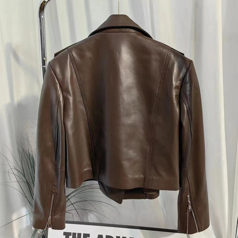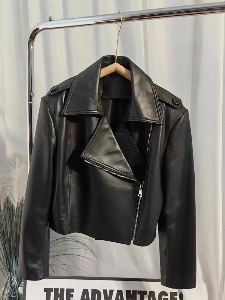 Elevate your wardrobe with this elegant jacket featuring a loose silhouette and a wide lapel collar. This short jacket is crafted from sheepskin leather to provide ultimate comfort while looking stylish. With a zipper closure and zippers in the sleeves, you can style it in multiple ways. Get your's now!