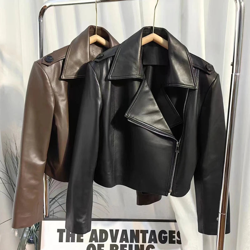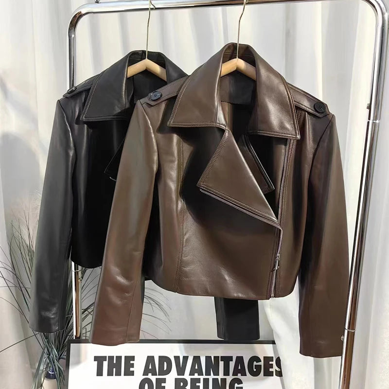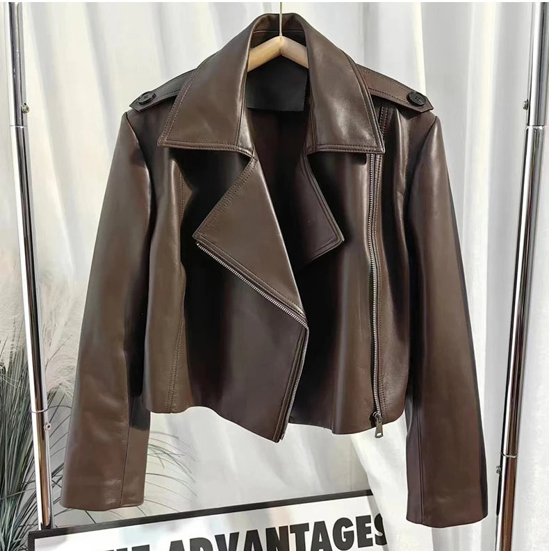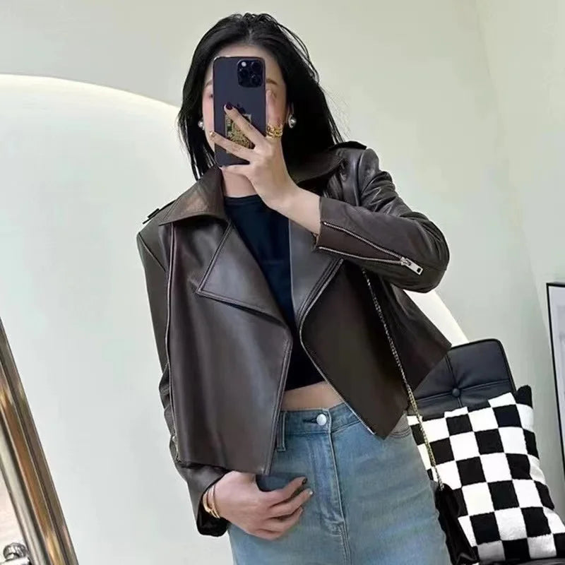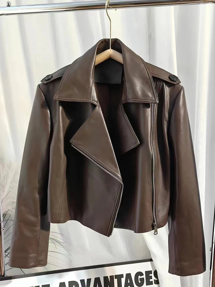 Women's Natural Leather Loose Zipper Wide Lapel Short Jacket