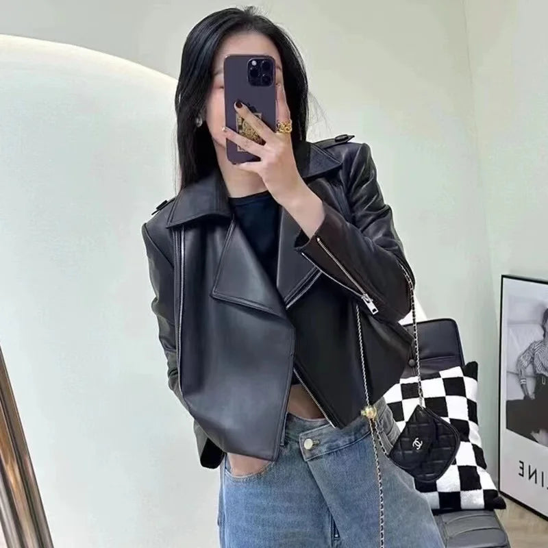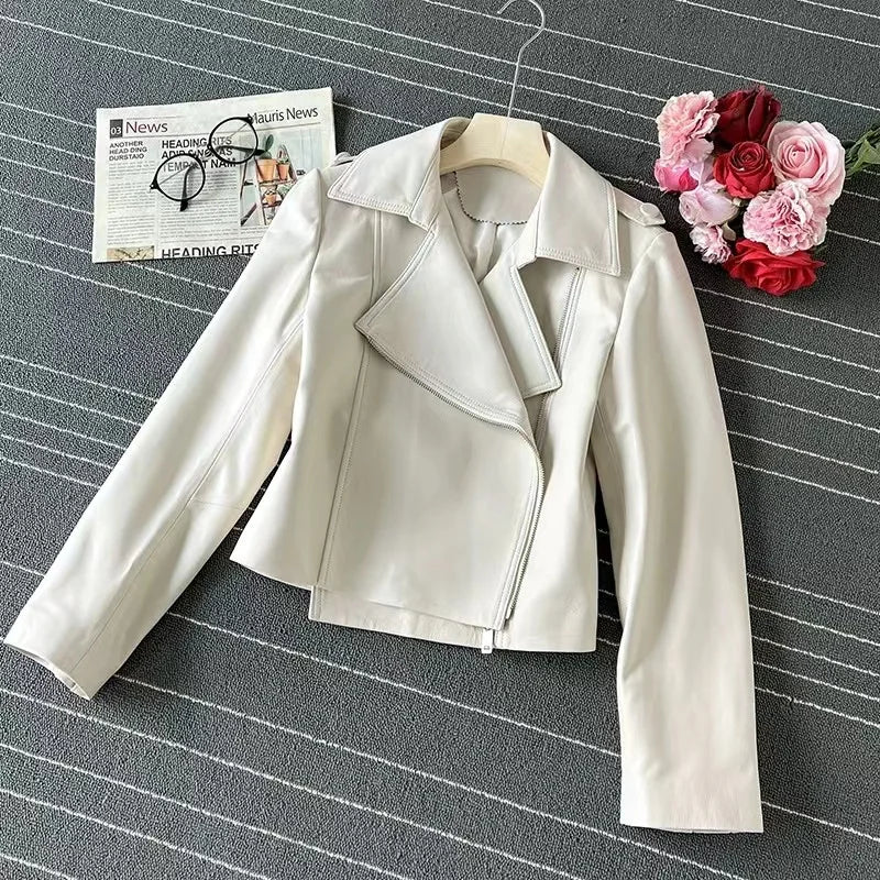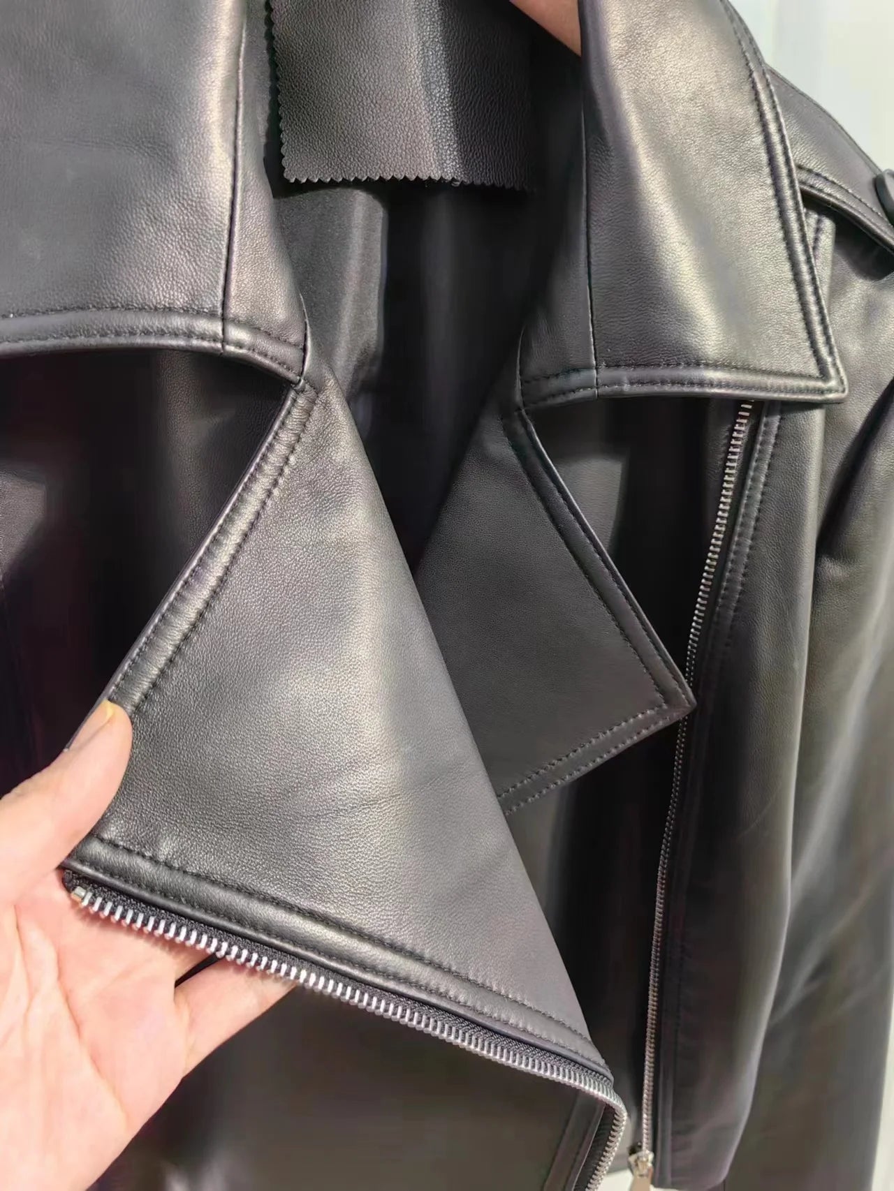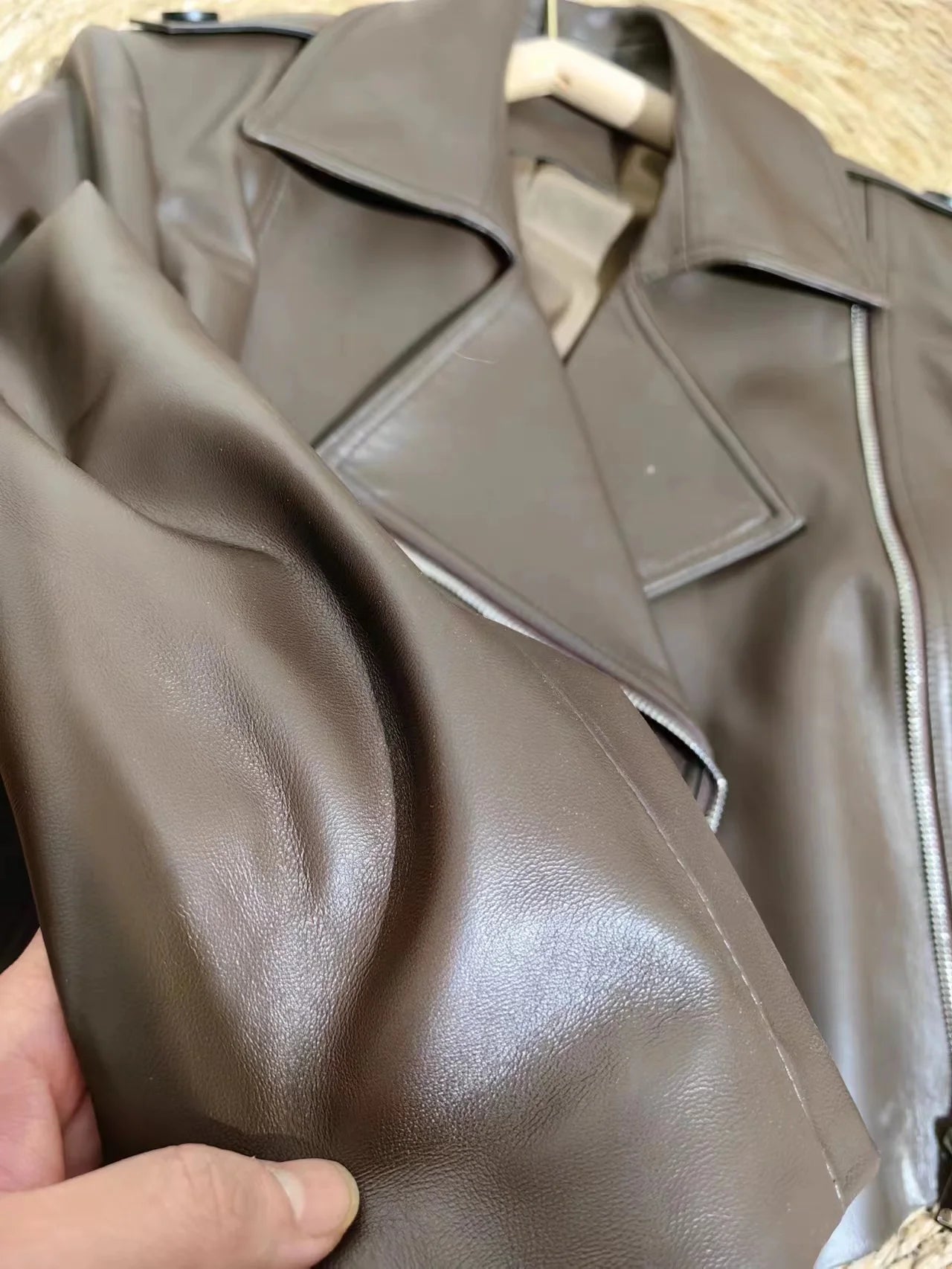 Women's Natural Leather Loose Zipper Wide Lapel Short Jacket