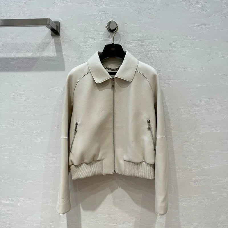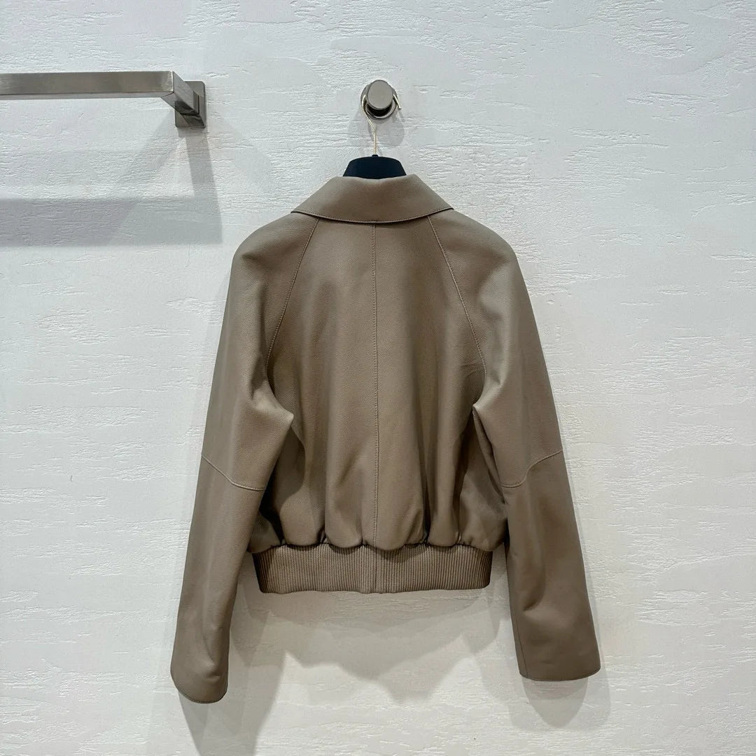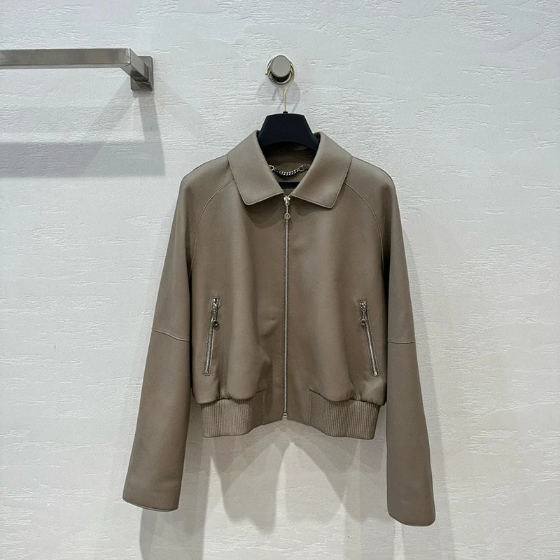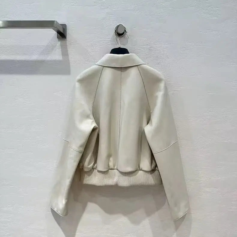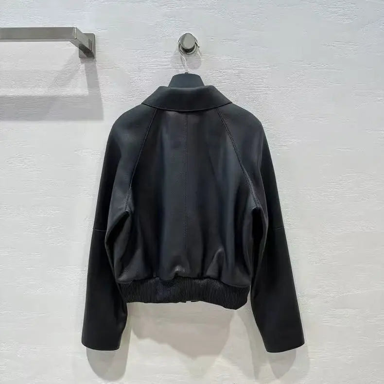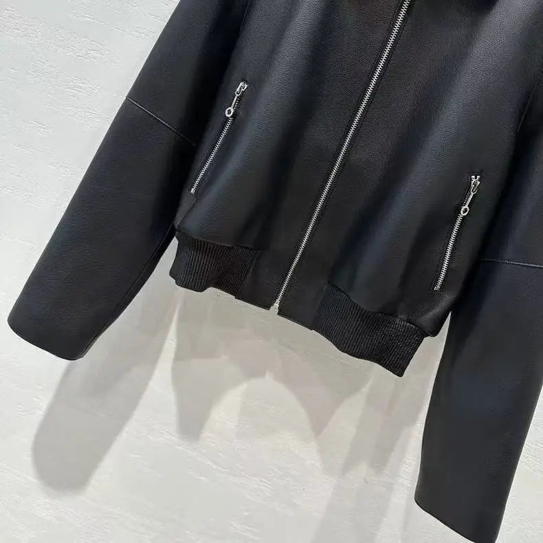 Women's Natural Leather Small Lapel Zipper Short Loose Casual Jacket for Spring Autumn