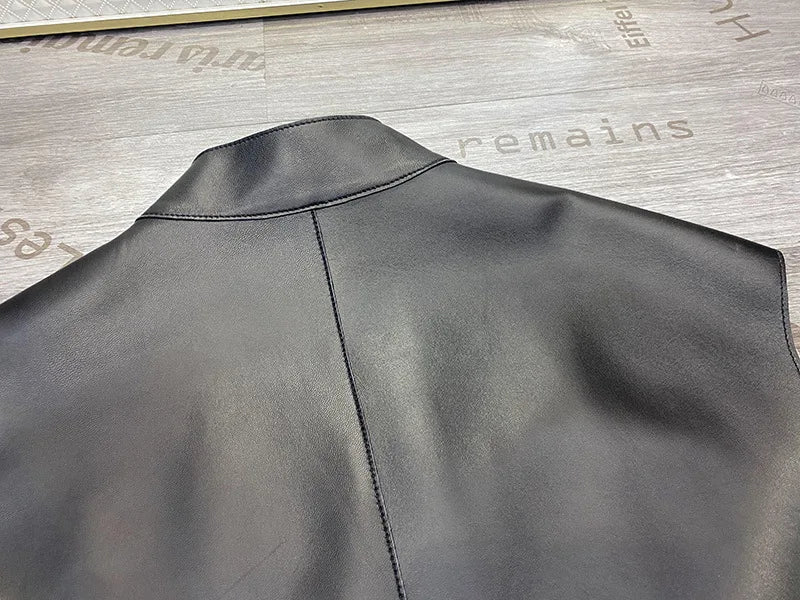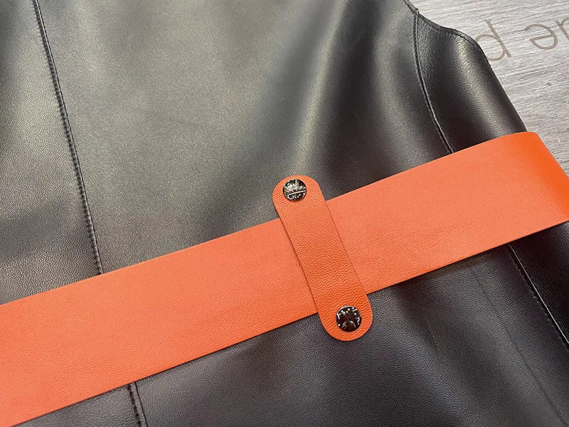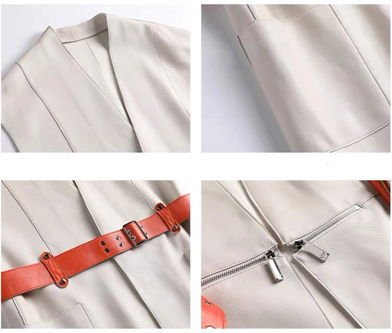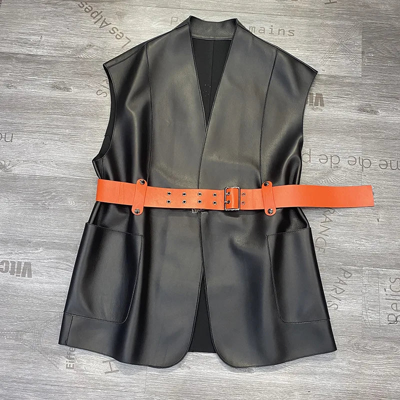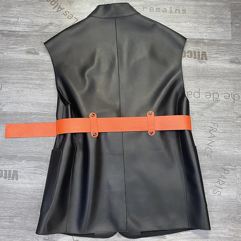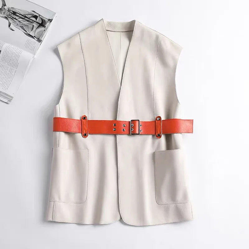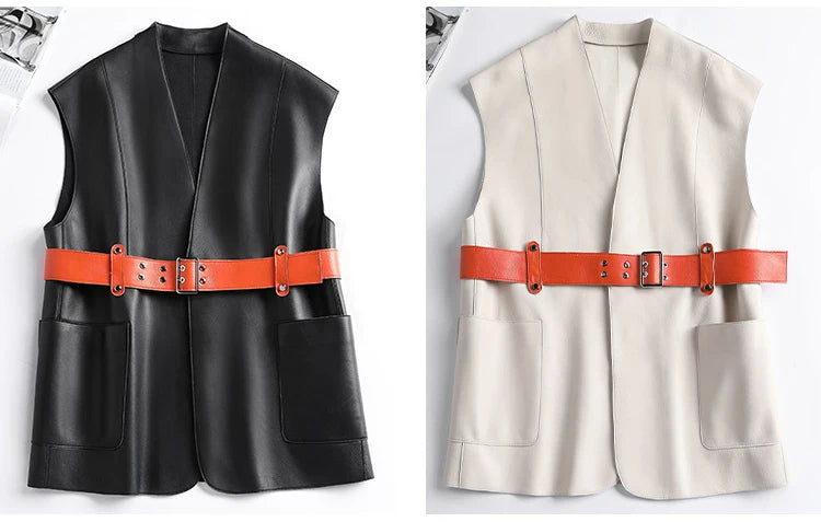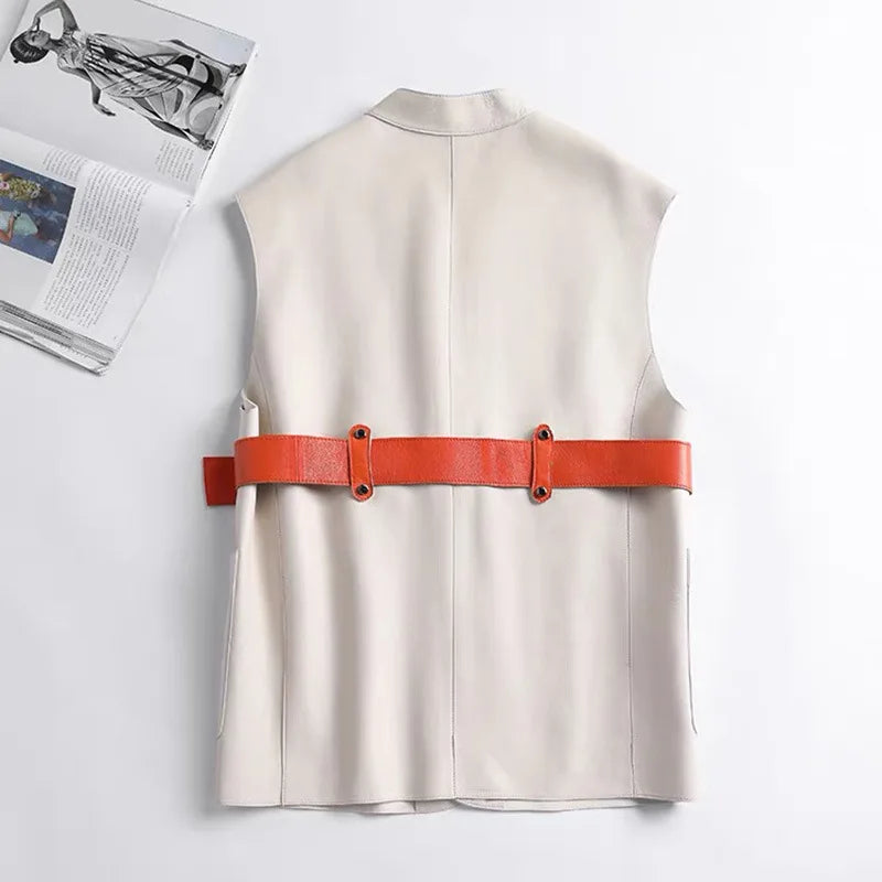 Wear this aesthetic and classy women's vest to flaunt a stylish look. The sleek design with sheepskin leather makes it comfortable and perfect for everyday wear. Being sleeveless, it is convenient and the contrast color belt adds color and elegance to your look. Perfect for fashion-conscious women who love to stand out in style.