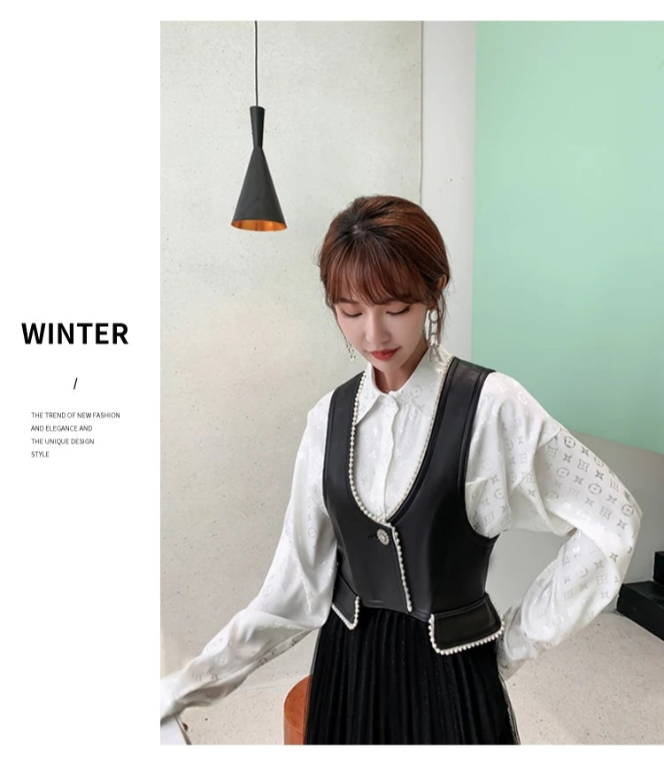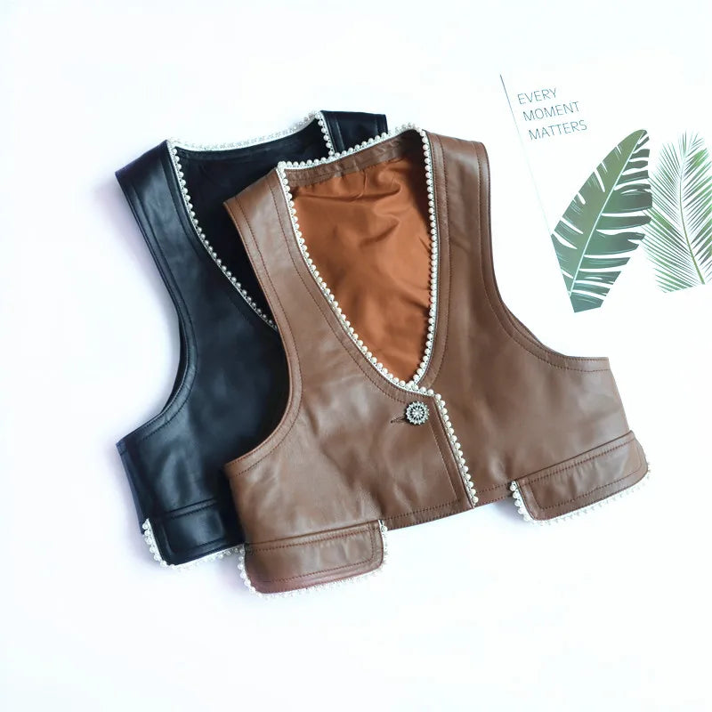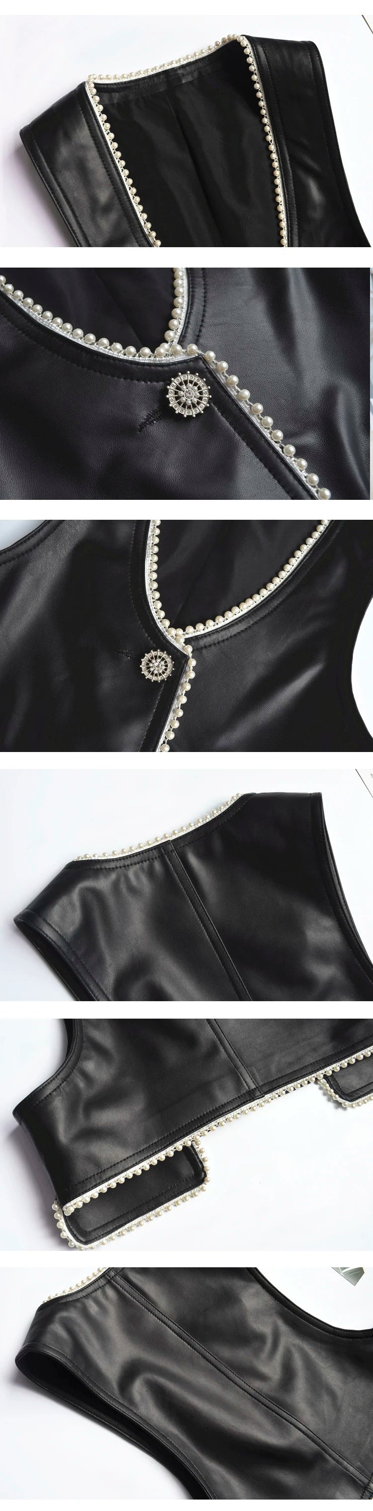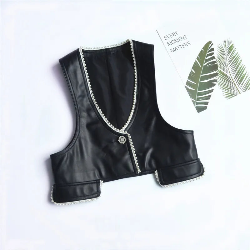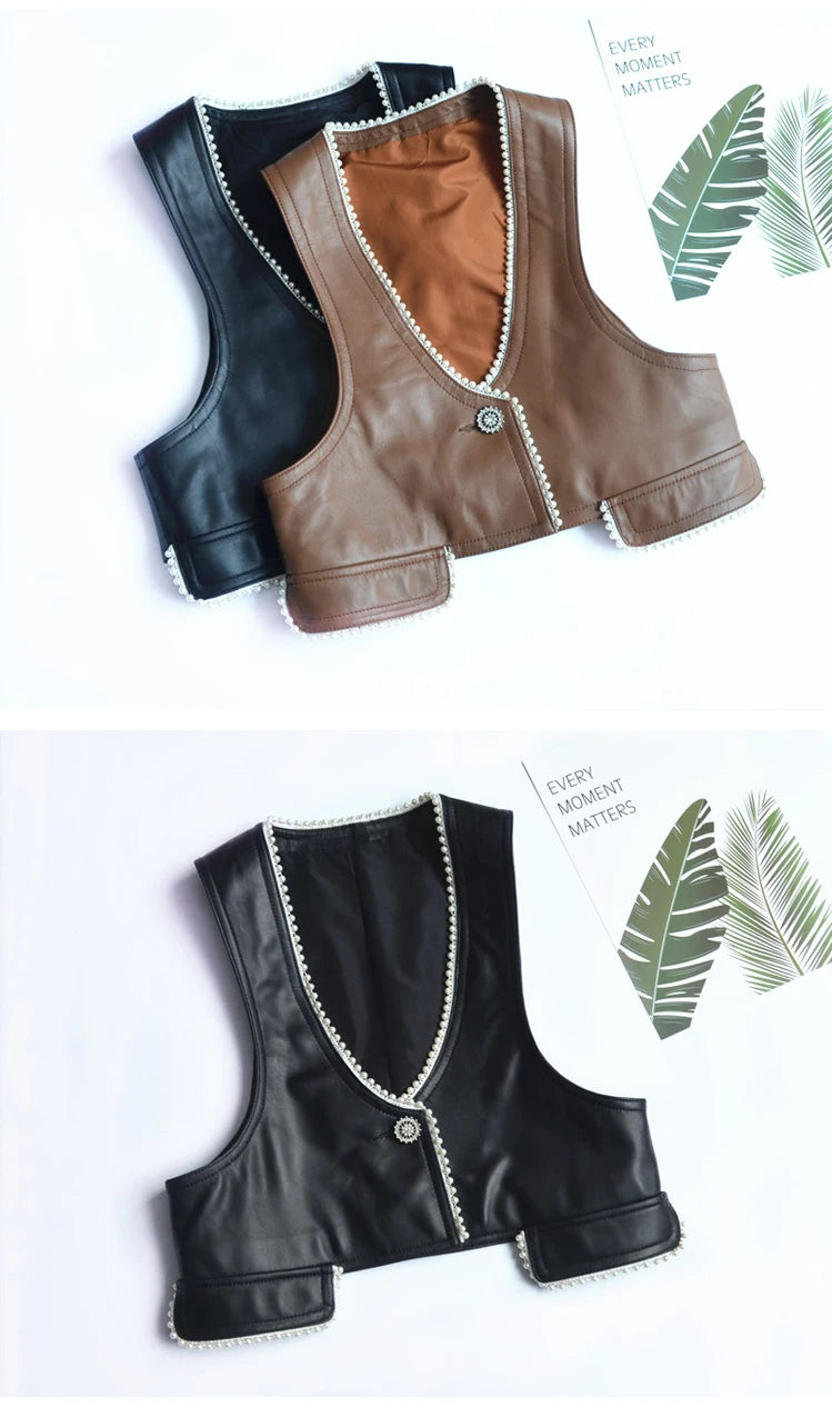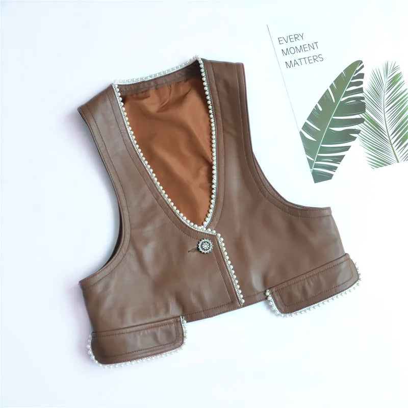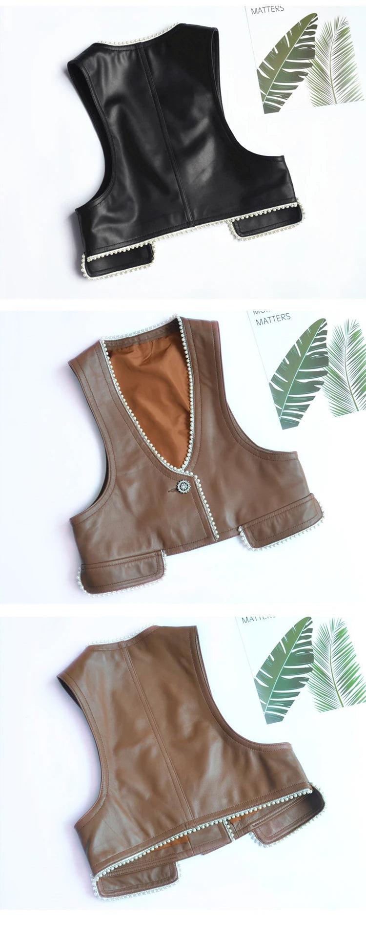 Women's Slim Short Sleeveless Pearl Decoration Leather Vest Jacket for Spring Autumn