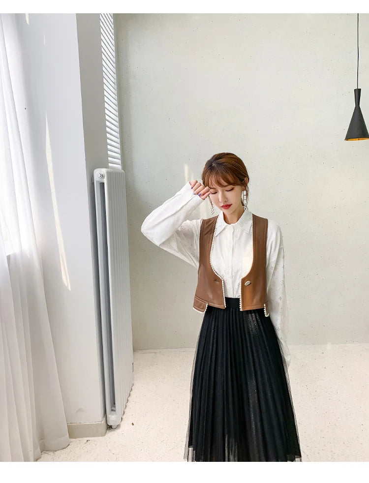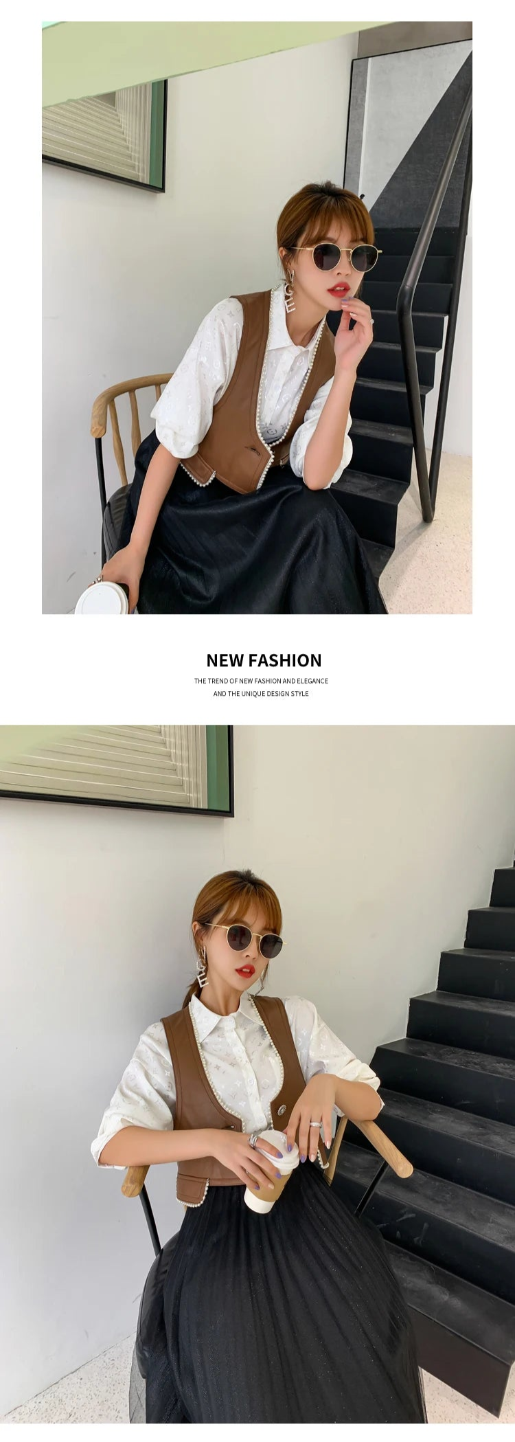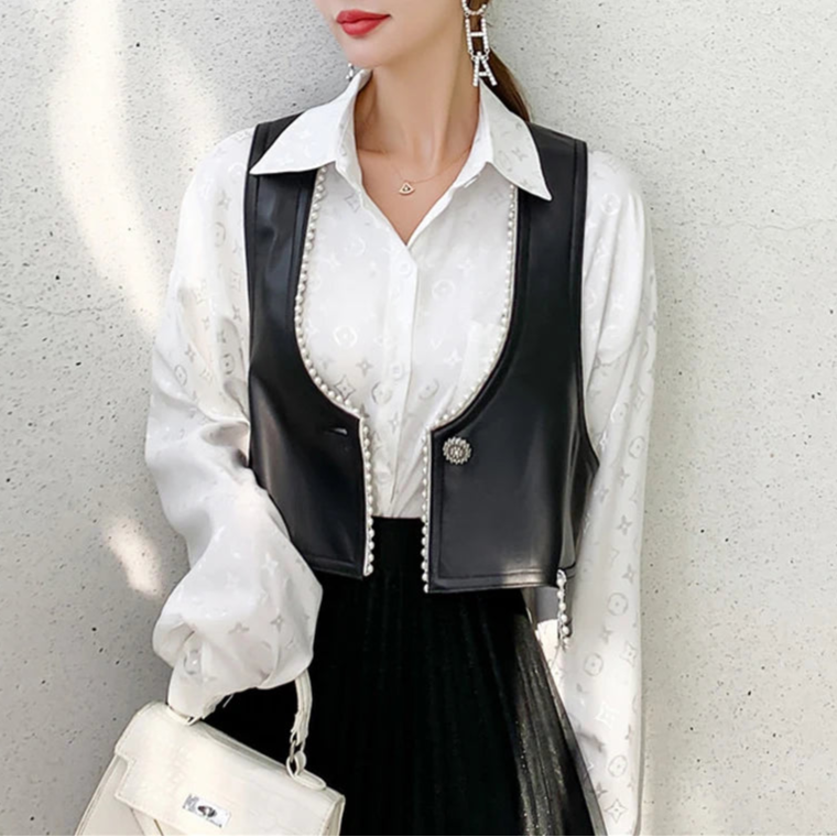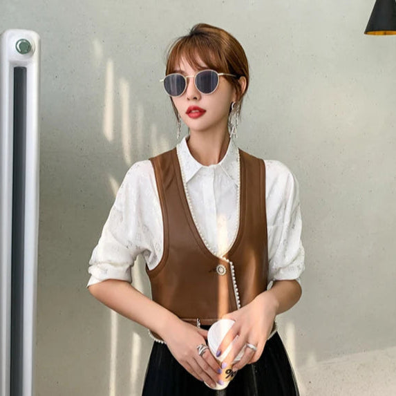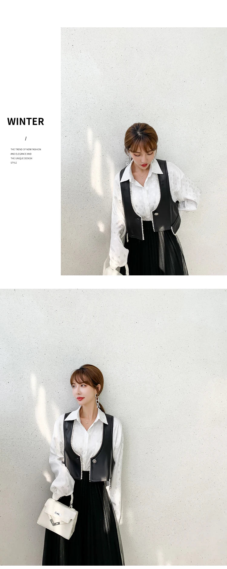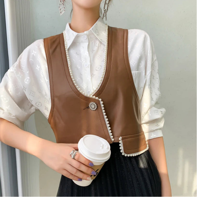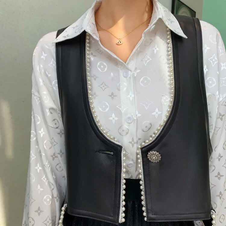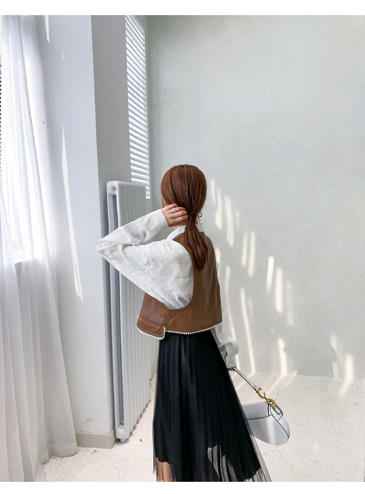 Women's Slim Short Sleeveless Pearl Decoration Leather Vest Jacket for Spring Autumn