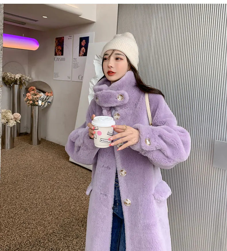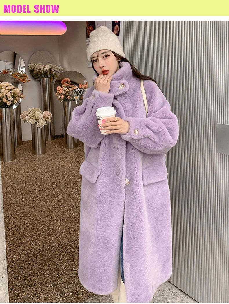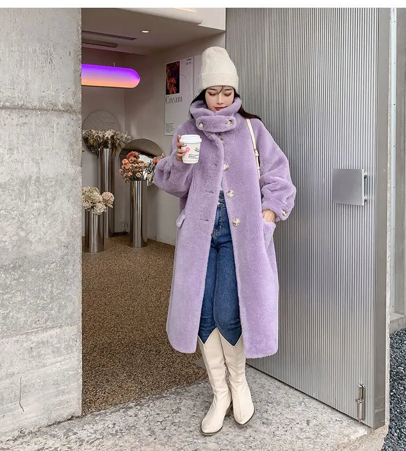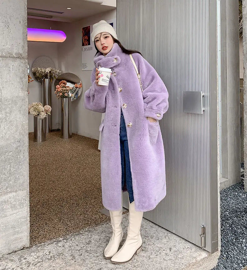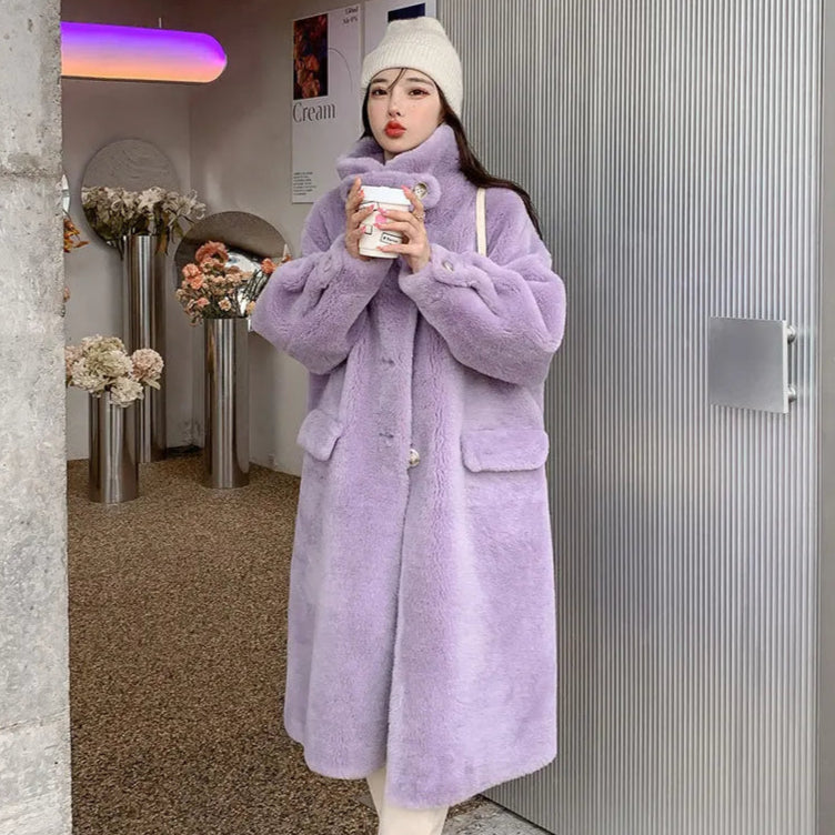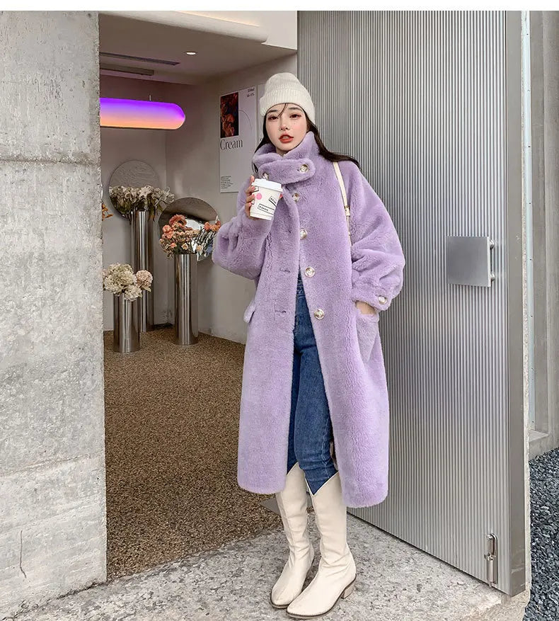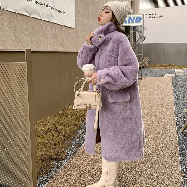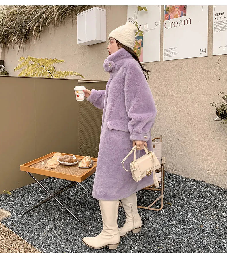Women's Warm Single-breasted Stand Collar Suede Lamb Fur Long Winter Coat