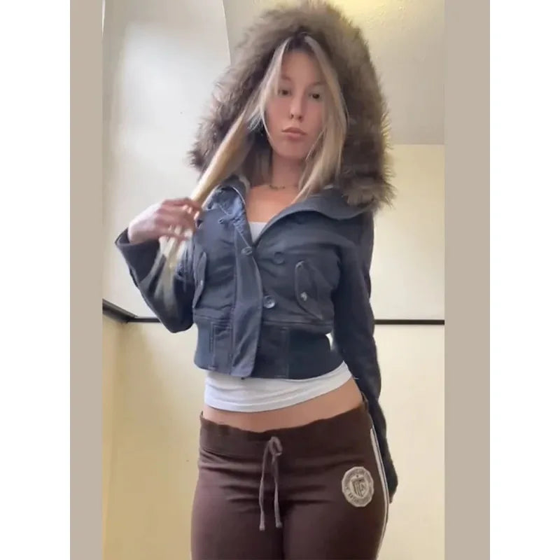 Women's Winter Harajuku Solid Color Multi-pocket Slim Zip Up Hood Jacket