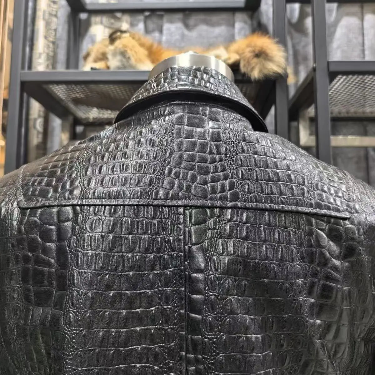Genuine Leather Crocodile Skin Pocket Black Zipper Jacket for Men
