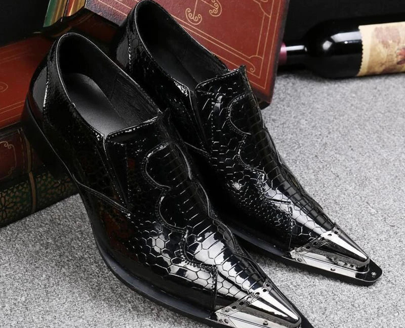 Men's Black Crocodile Pattern Business Casual Metal Pointed Toe Rivet Loafers