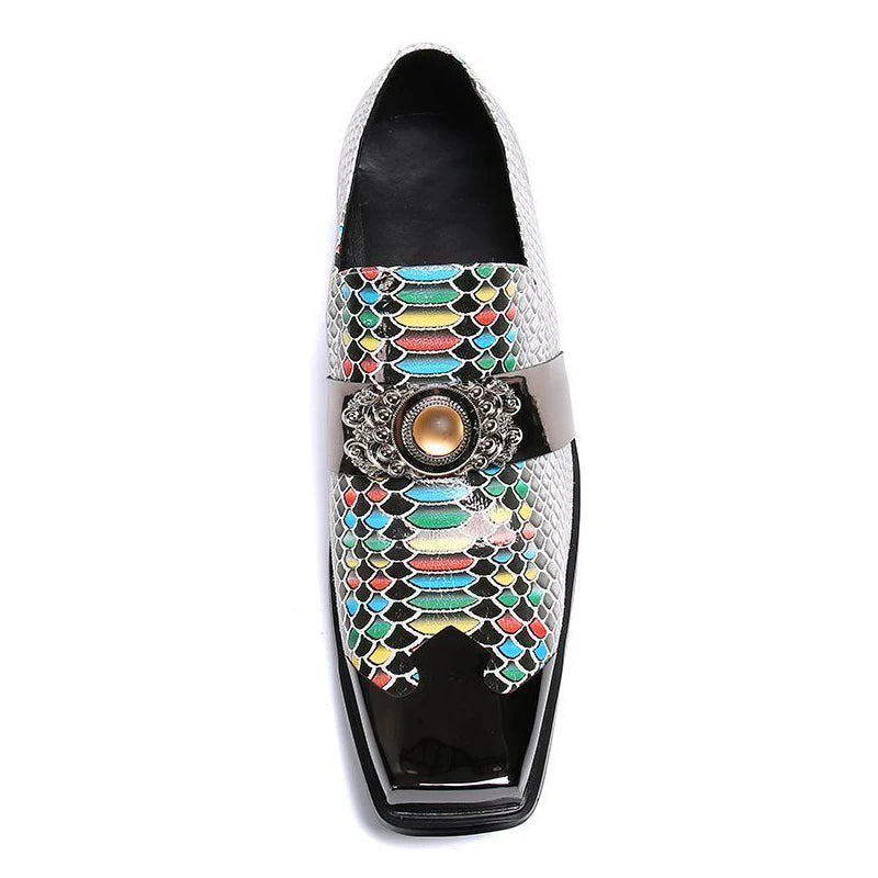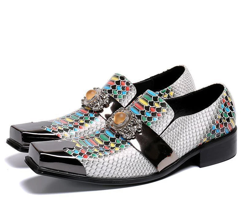 Men's Silver Snake Pattern Square Toe Slip On Genuine Leather Dress Shoes