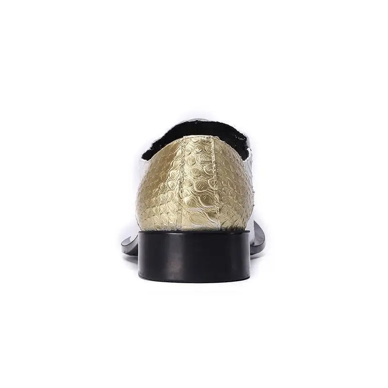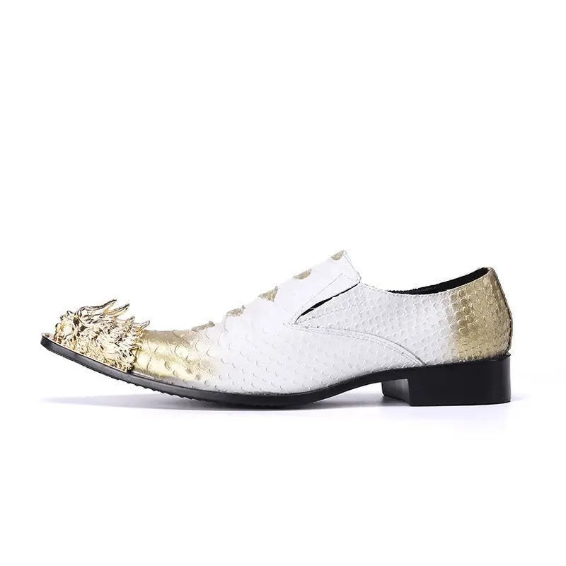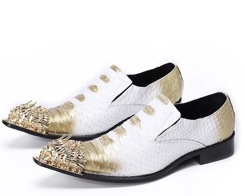 These spectacular men's loafers feature a genuine leather upper and rubber outsole, offering both durability and style. Designed in a white and gold color combo, these loafers have a snakeskin pattern that adds extra style points to them. Being a slip-on, it is easy to wear and take off. A lovely, stunning loafers for men!