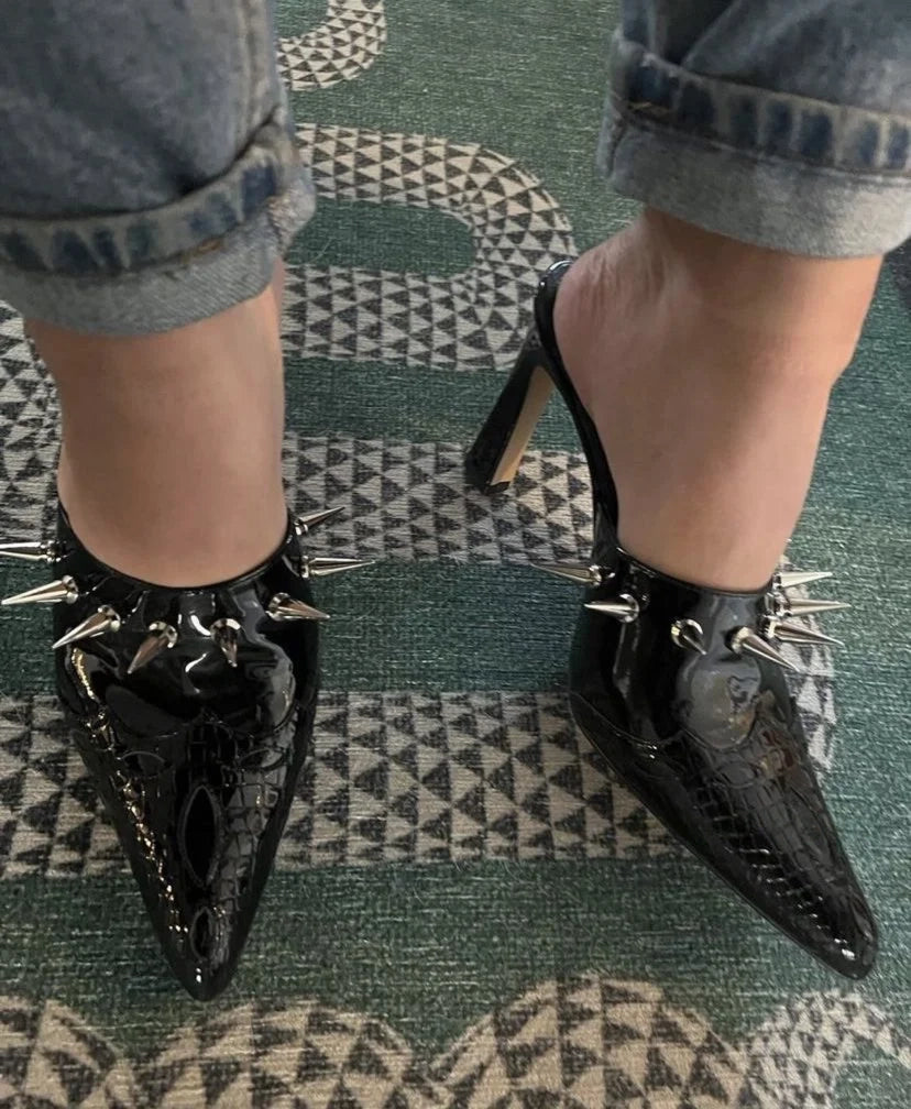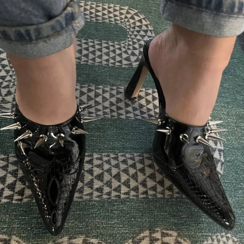 Ladies Punk Style Black Pointed Toe Spike Rivet High Heels Pumps