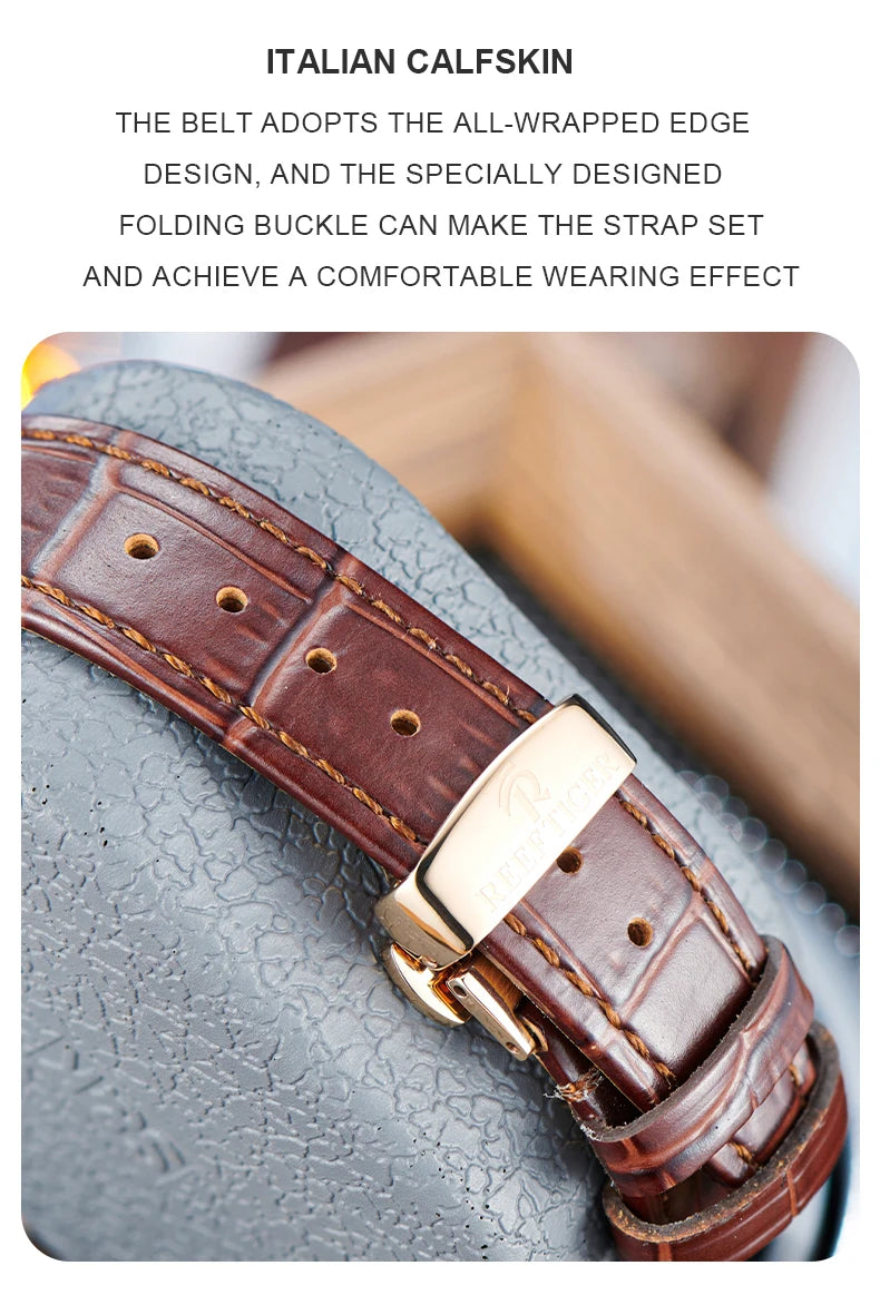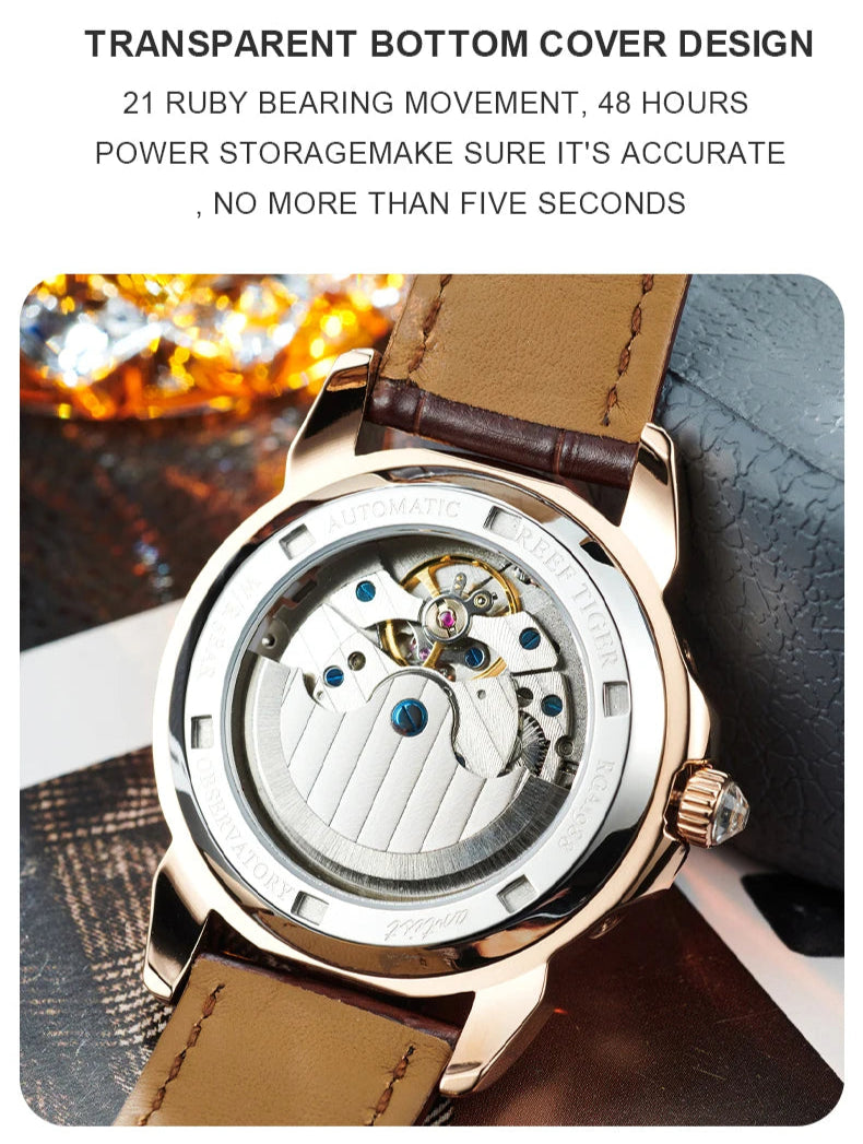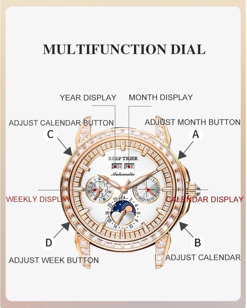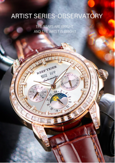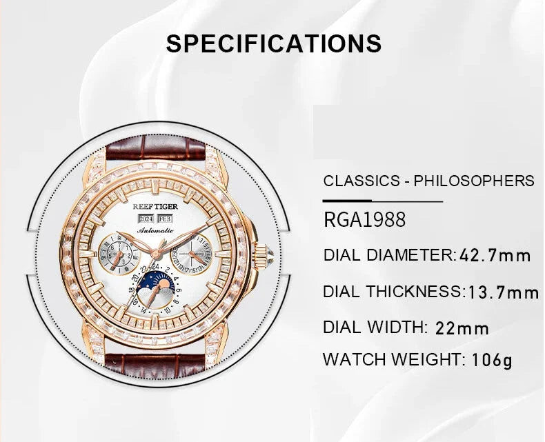 Men's Moon Phase Automatic Diamonds Bezel Waterproof Leather Strap Multifunction Watch