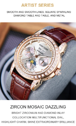 This excellent men's watch isn’t just about telling time, it’s a way to make a style statement. Featuring a leather strap and stainless steel round casing, it offers both durability and style. The waterproof and moon phase features are intuitive. The watch features diamond decor in the bezel that makes it look luxurious. Wear it with your favorite outfit to make a statement.