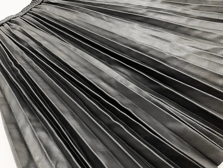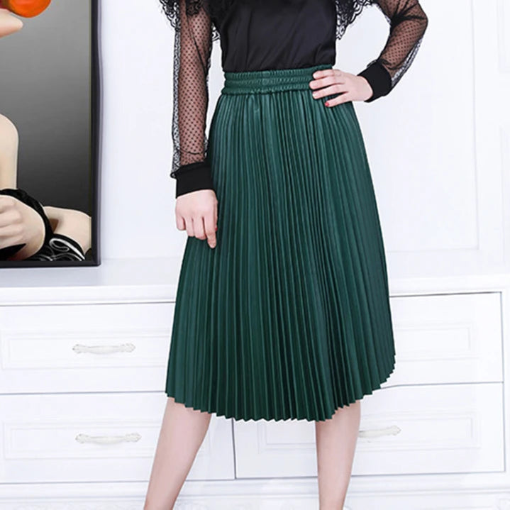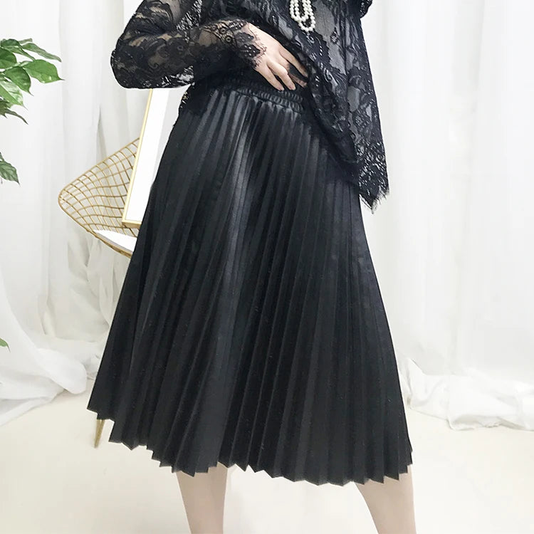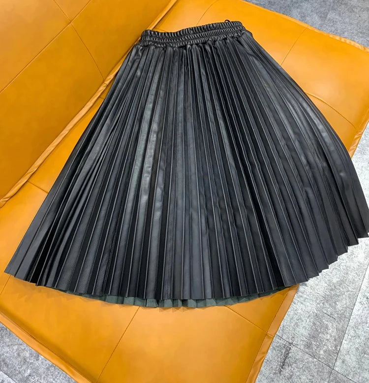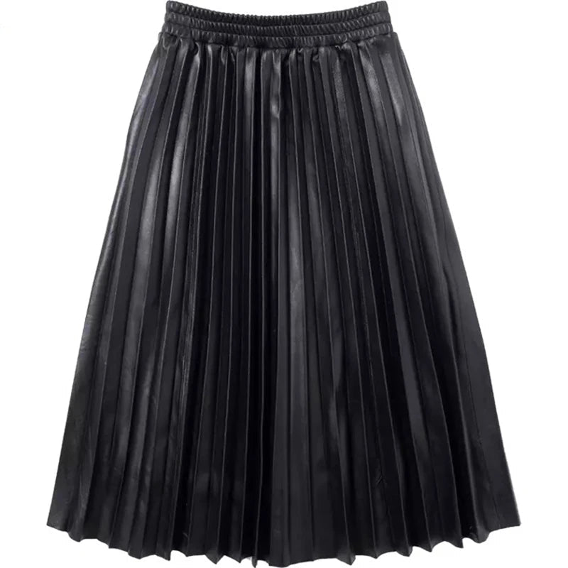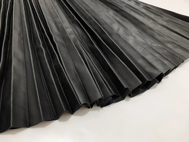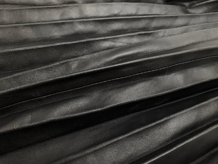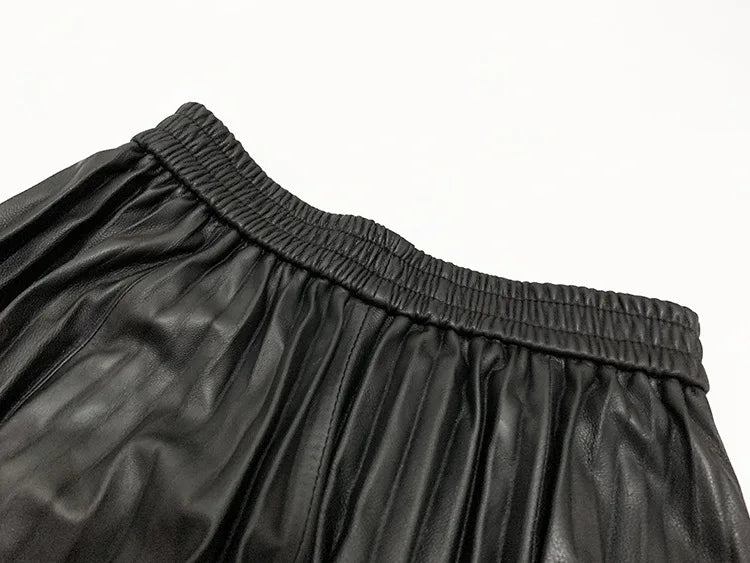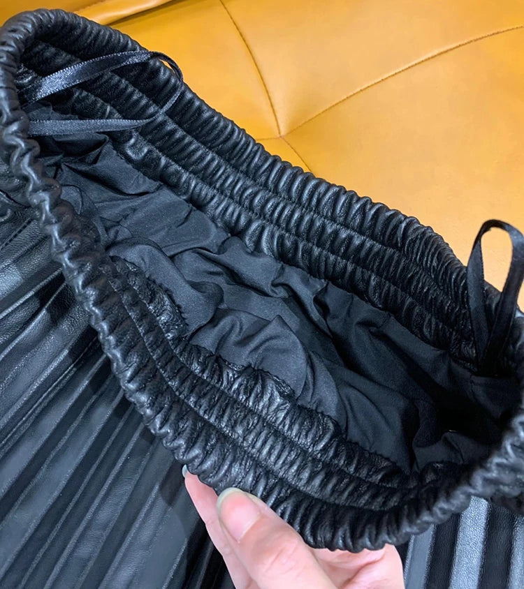 Retro Luxury Lambskin Leather Elastic Waist Over Knee Slim Long Jupe Skirt