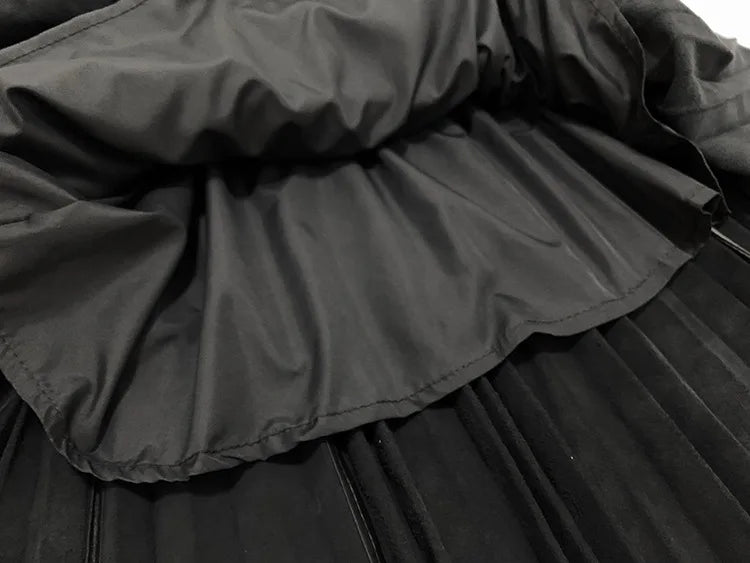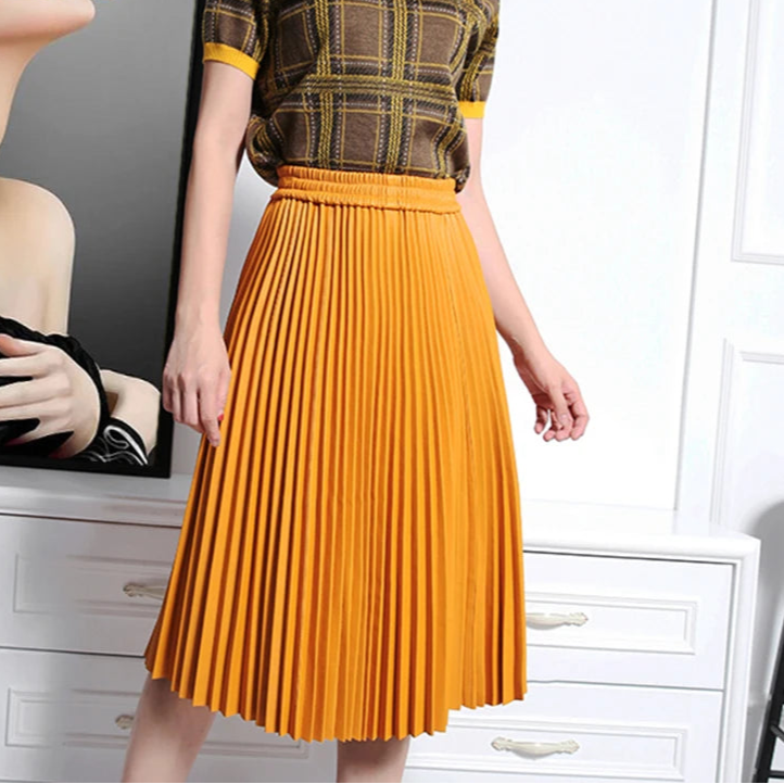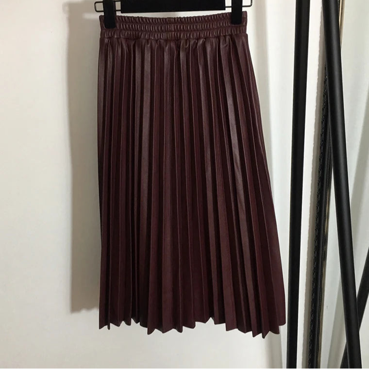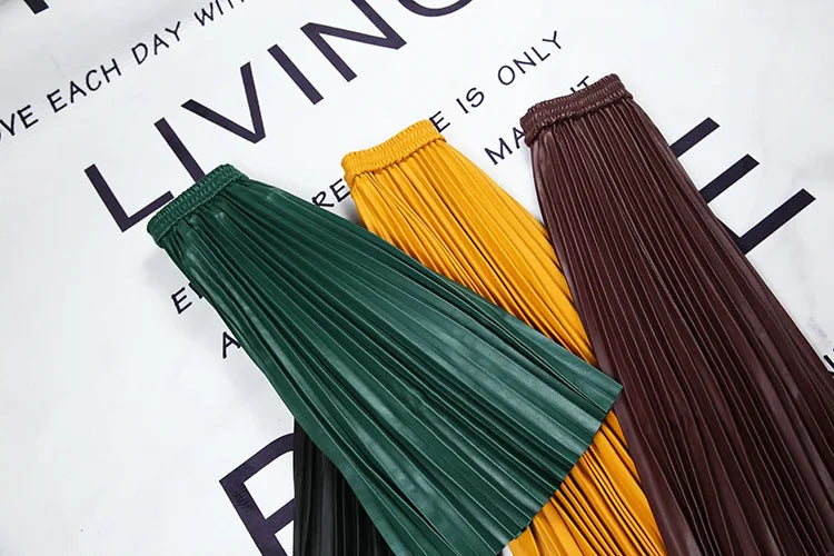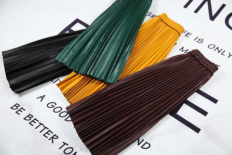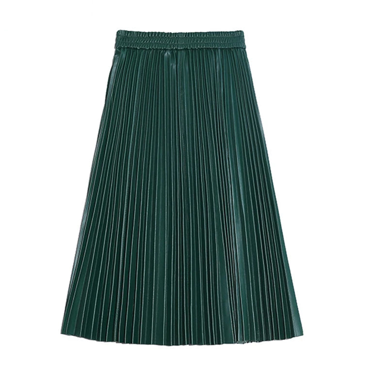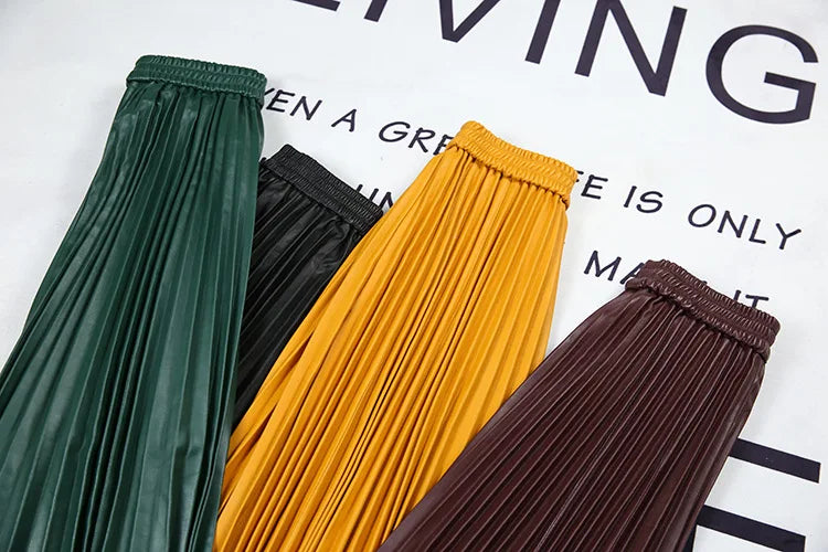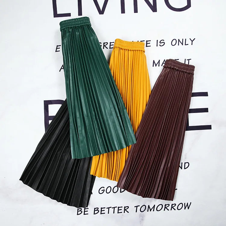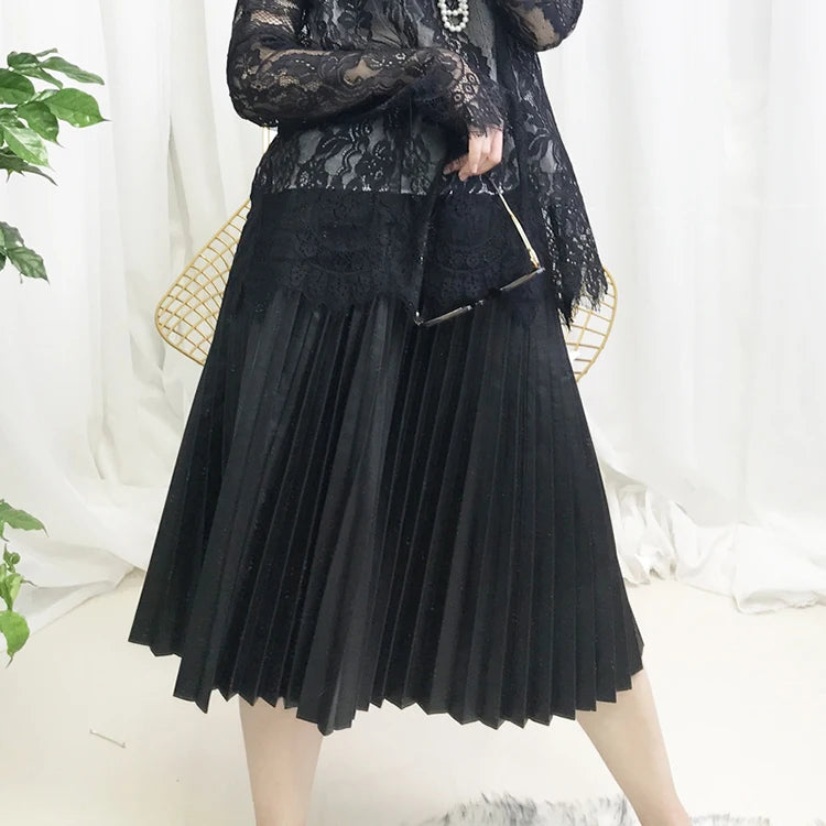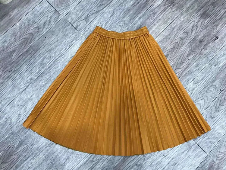 Retro Luxury Lambskin Leather Elastic Waist Over Knee Slim Long Jupe Skirt