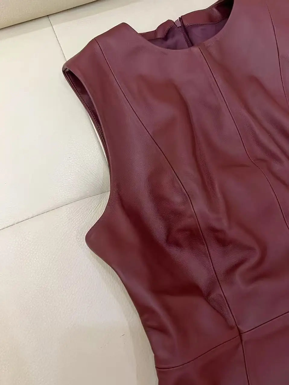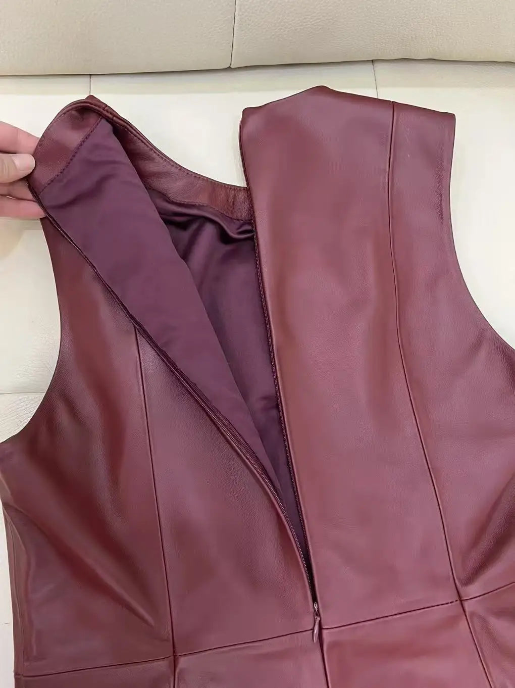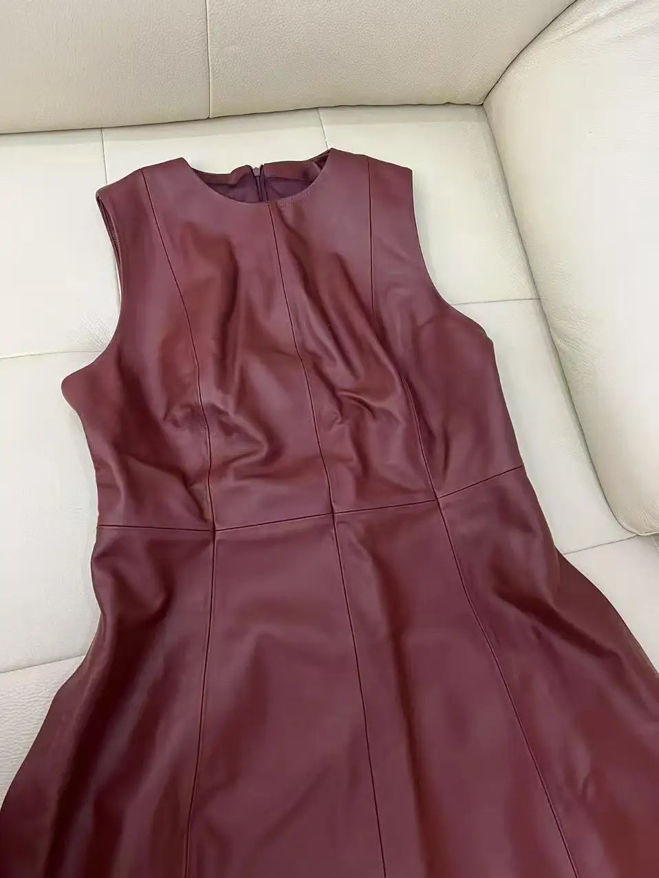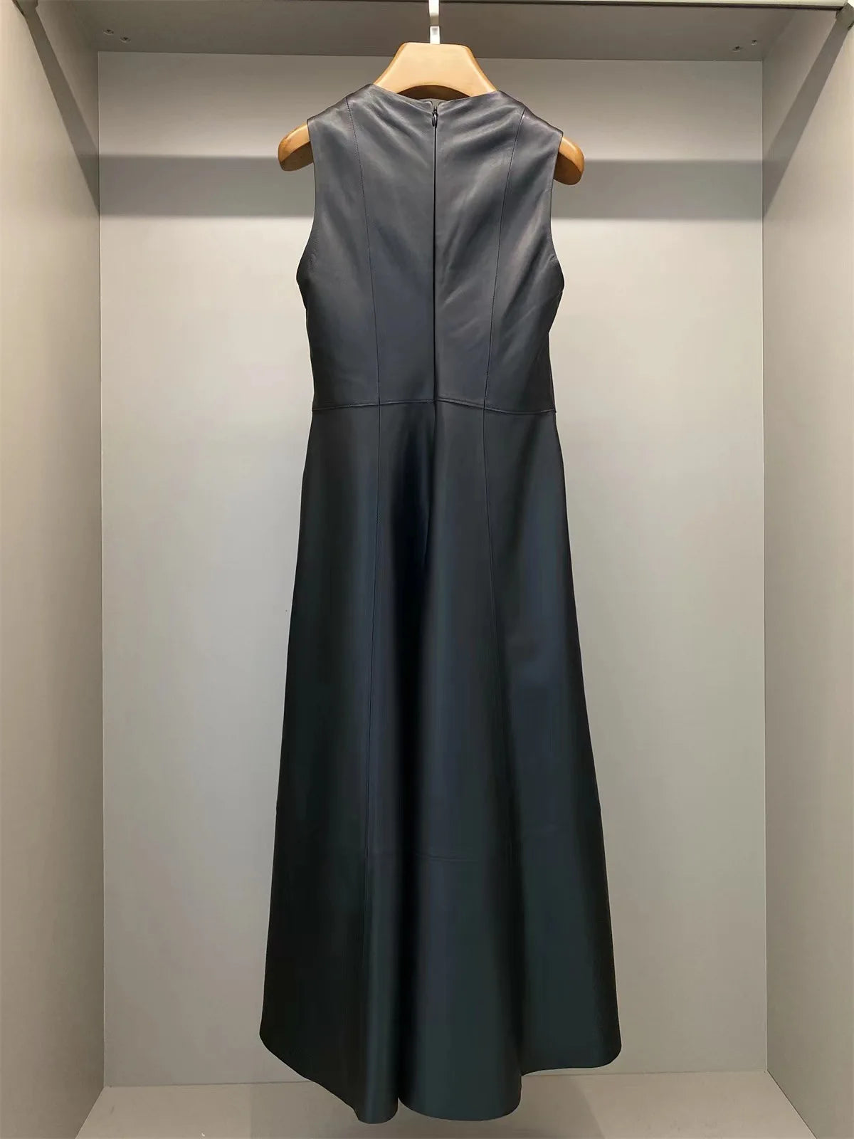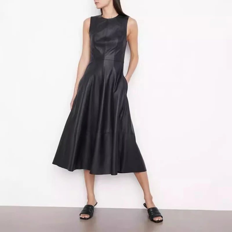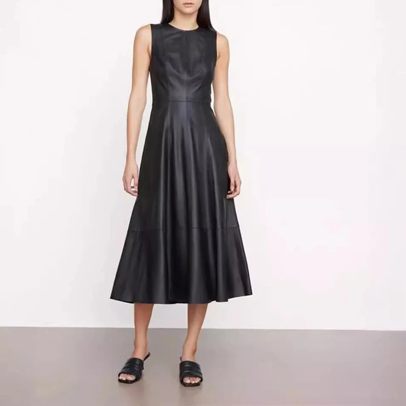 This women's dress is your go-to choice for comfort and style in the summer. Made of sheepskin leather that ensures durability and a stylish look, the dress features a high waistline and an O neckline. The flare in the umbrella skirt elevates your style and adds elegance to your look. Don't miss it!