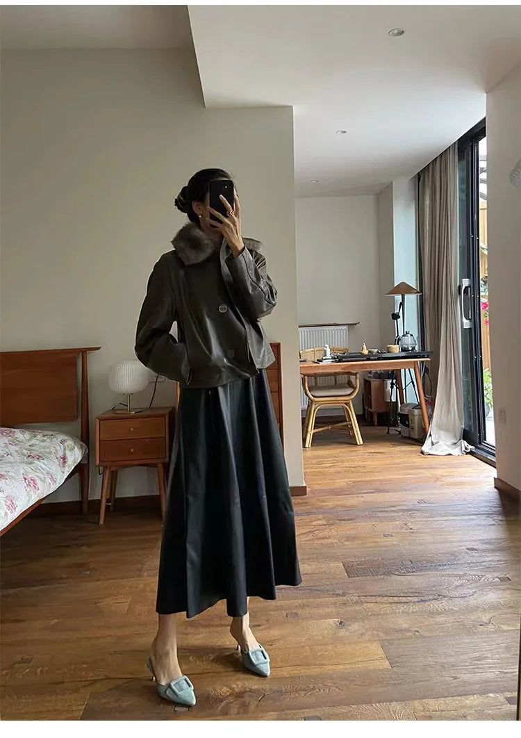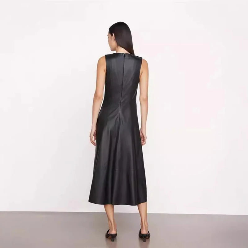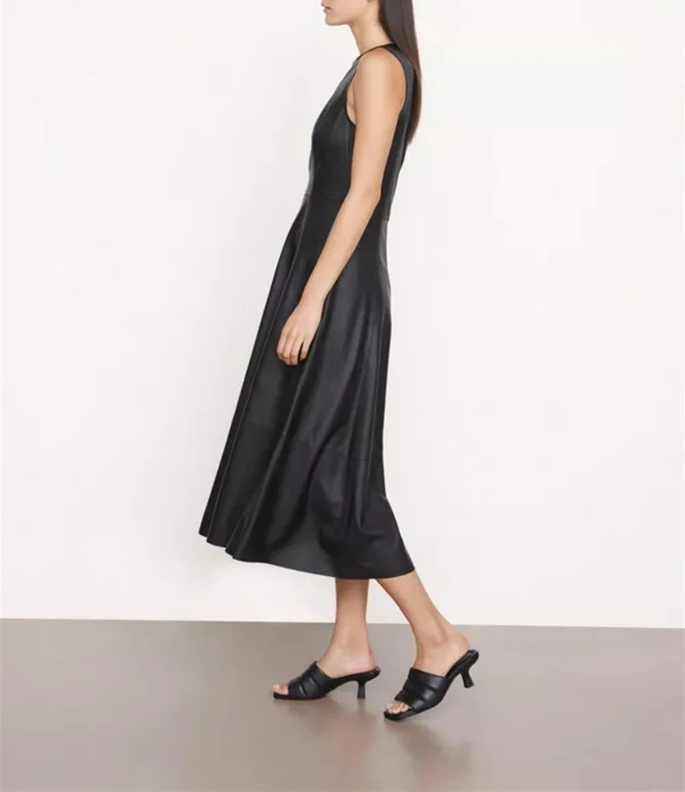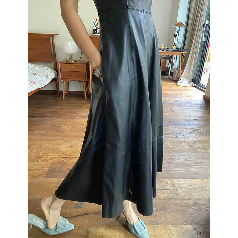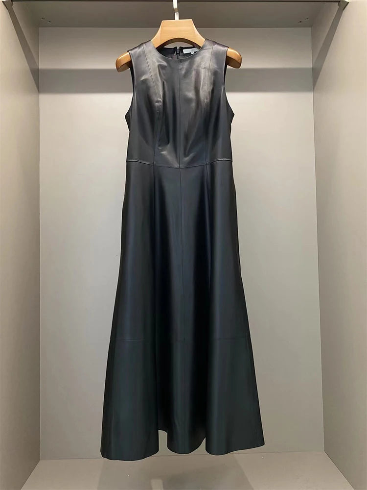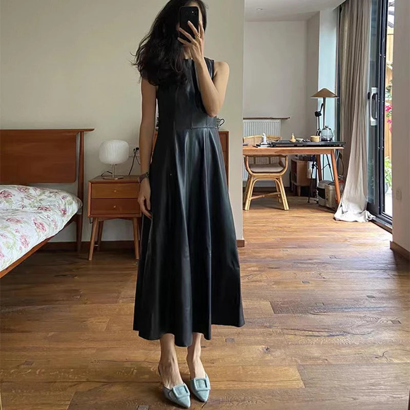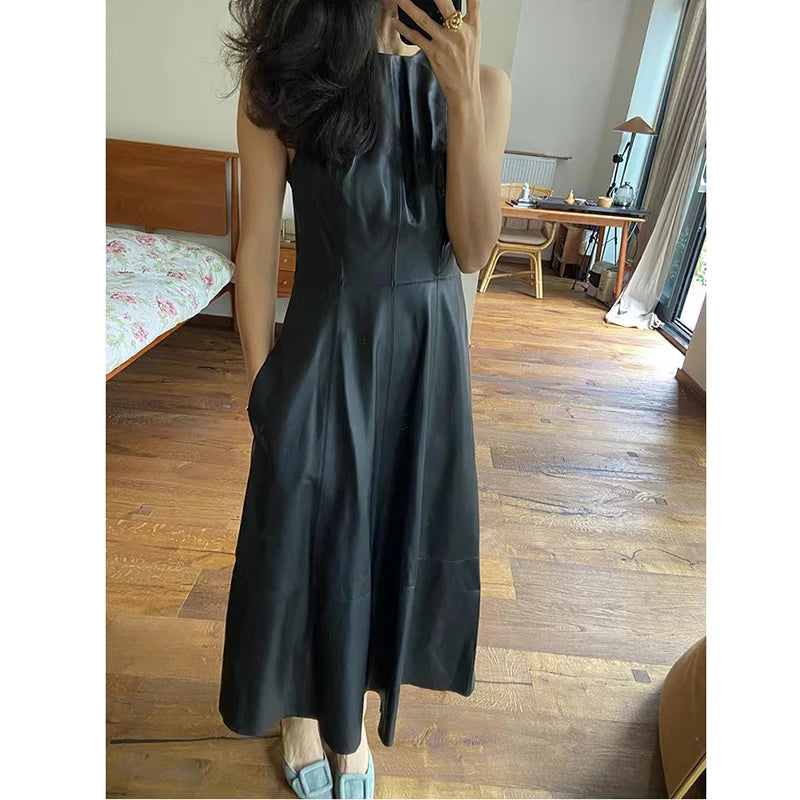 Sheepskin Sleeveless High Waist O-Neck Umbrella Skirt Long Dress for Women