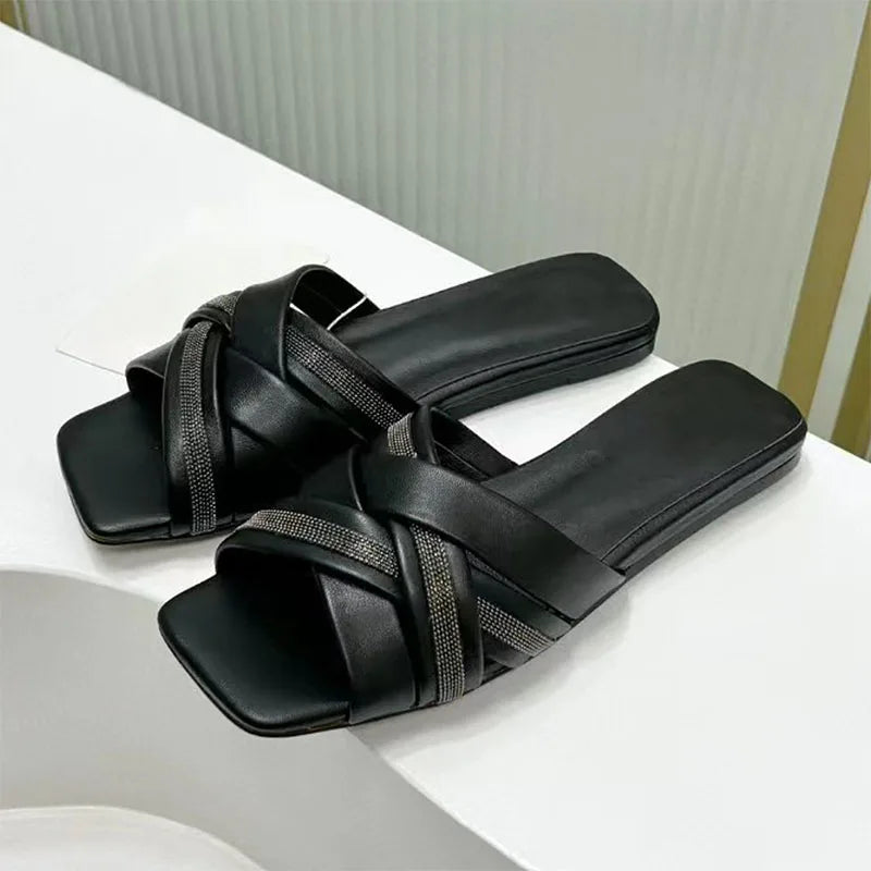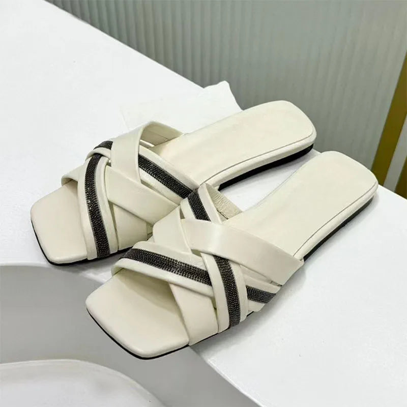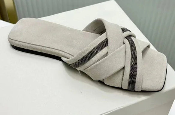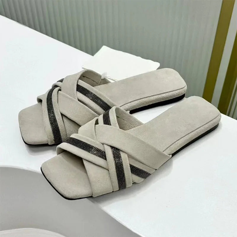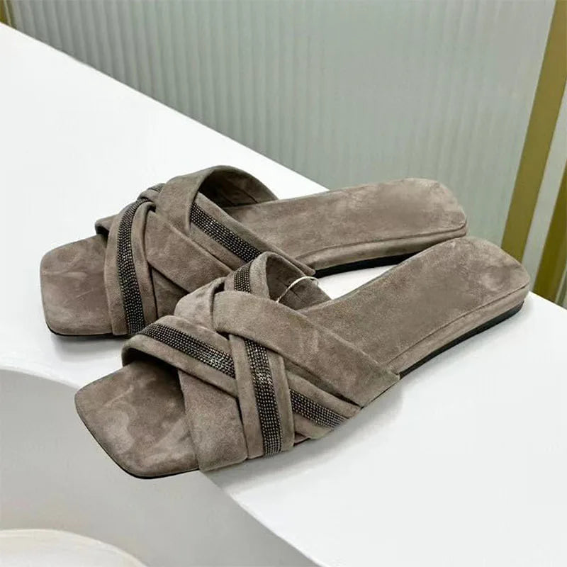 Summer Cross Strap Square Peep Toe Flat Suede Mules Slippers for Women