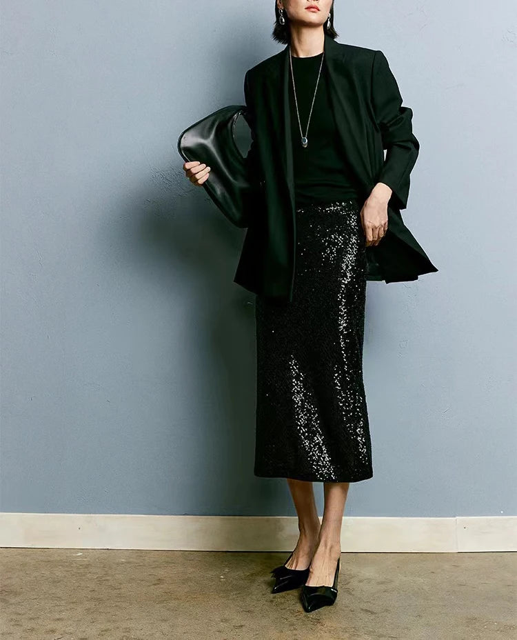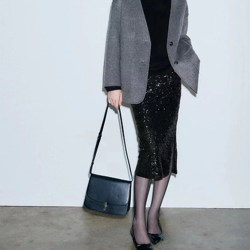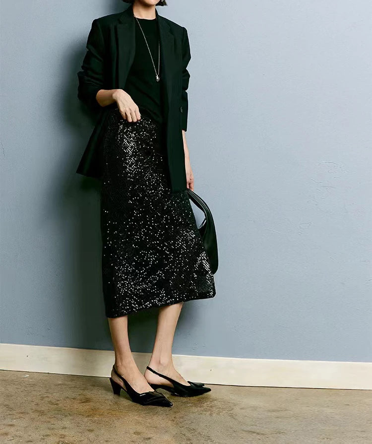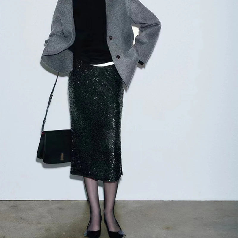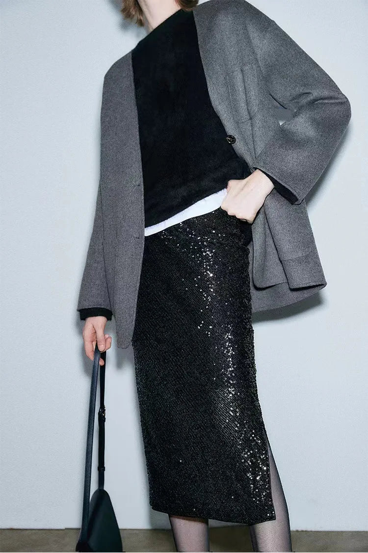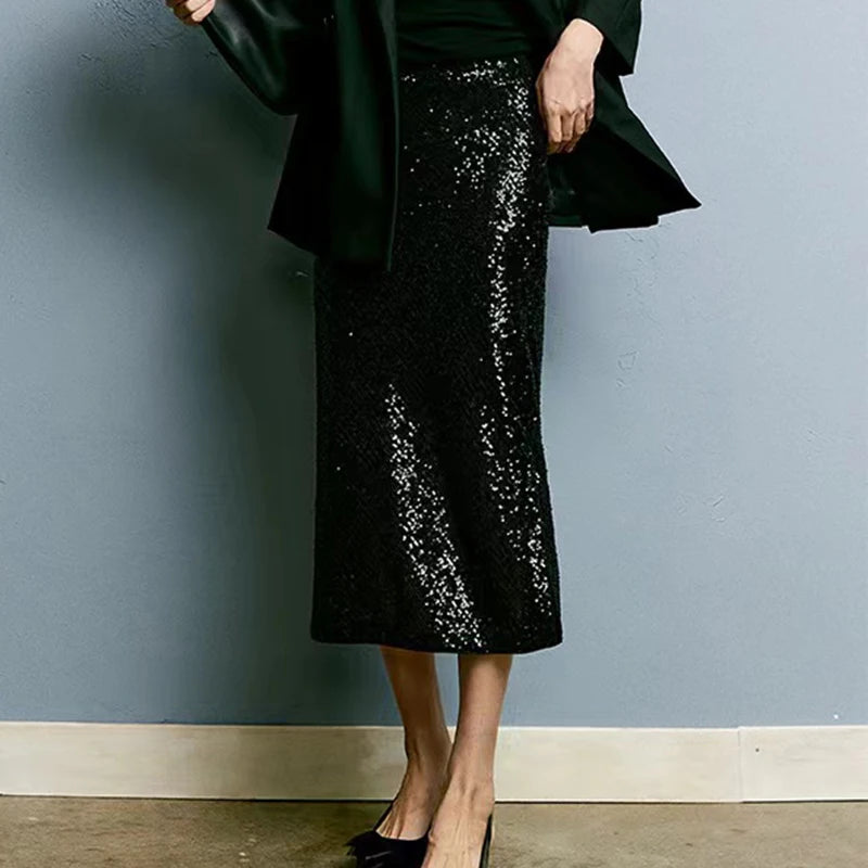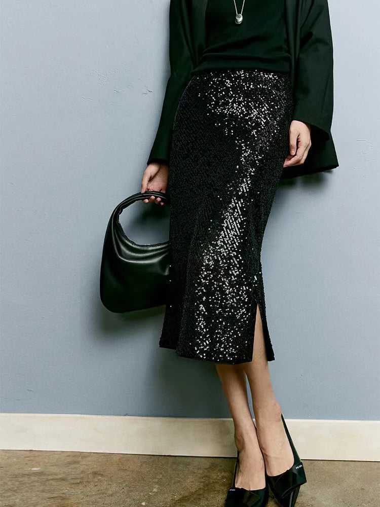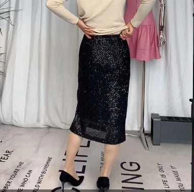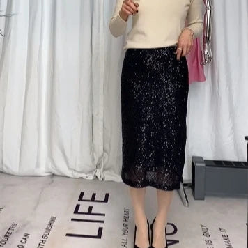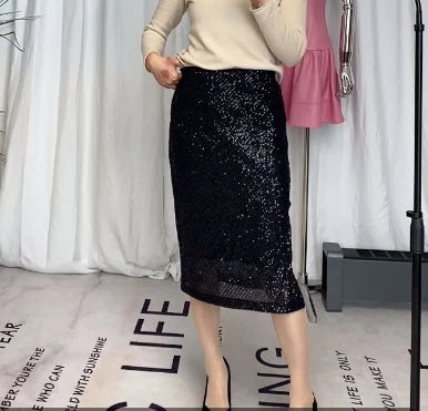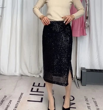 Elastic A-line Straight Wrap Hip High Waist Side Slit Sequin Skirt for Women