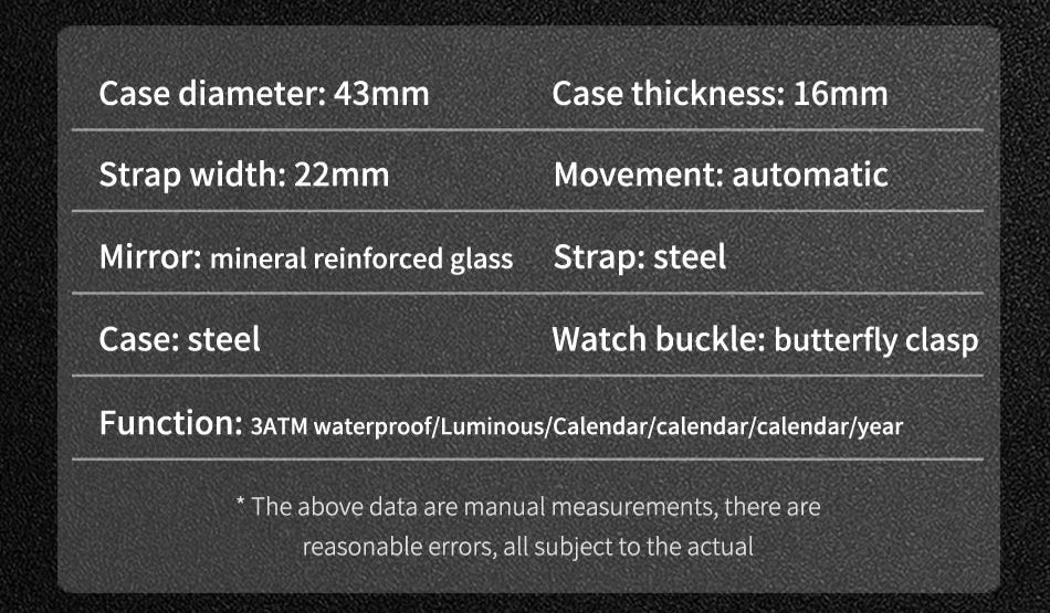 If you are looking for an aesthetic and classy men's mechanical watch, then this is for you. Made with a stainless steel strap and casing, this watch sits comfortably on your wrist. The shock resistance, auto date, complete calendar, water resistance and week display features are mindblowing. Order now!