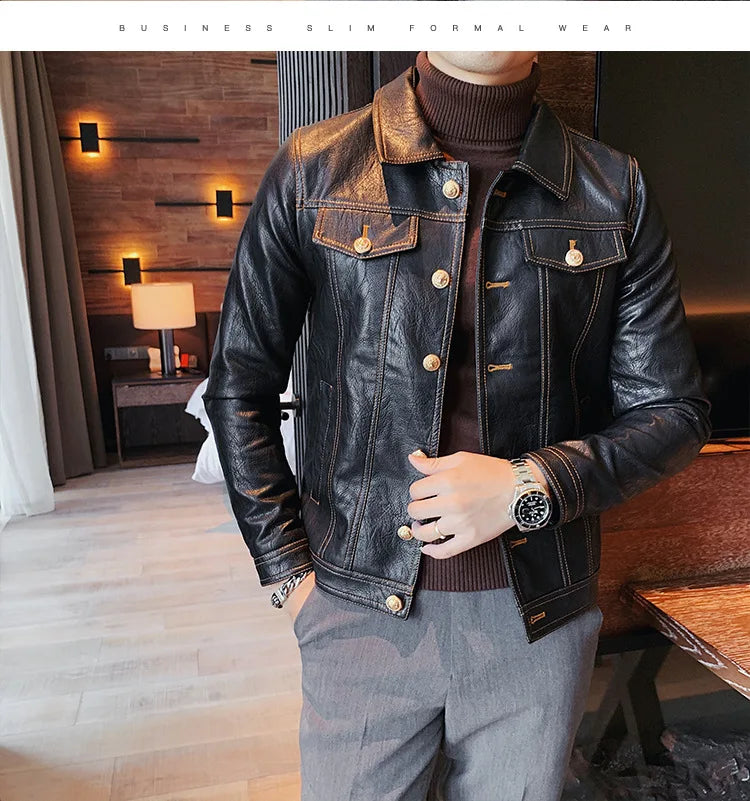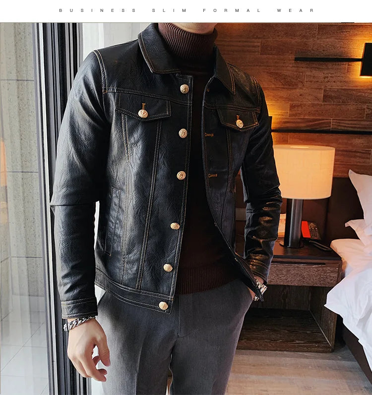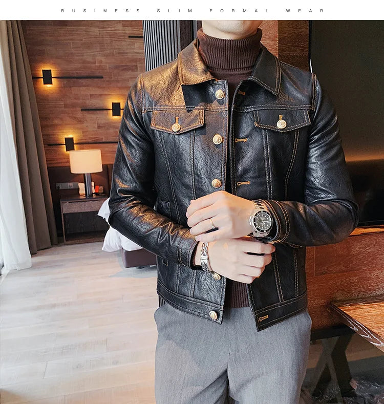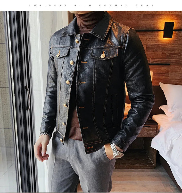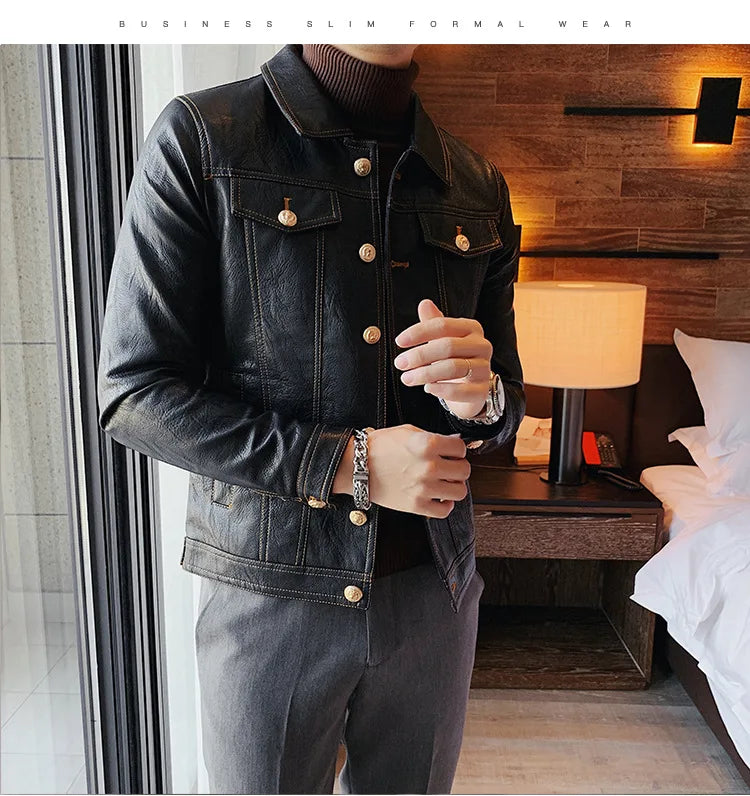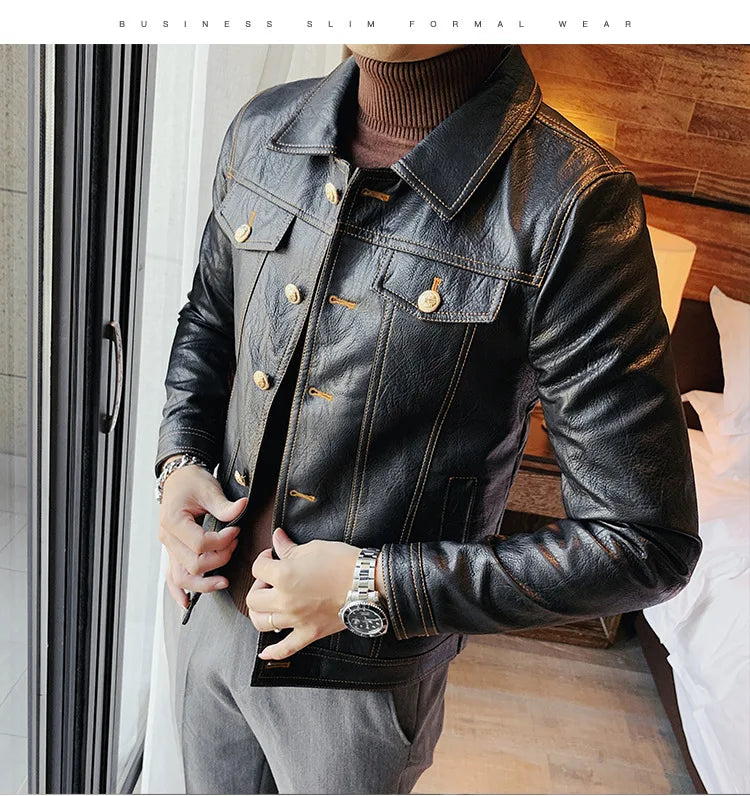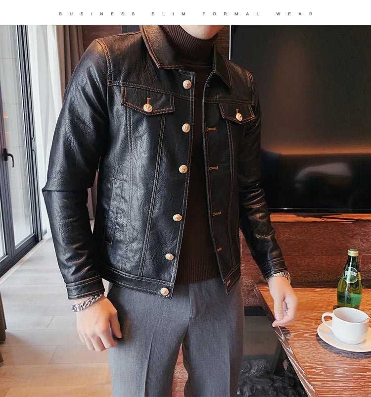 Perfect for the modern man who loves a simple and smart look, this lovely jacket exudes timeless appeal. Made of synthetic leather in solid color finishes, it offers both durability and style. Available in various styles, single-breasted and double-breasted and with various collar styles, these jackets are a practical accessory to stay warm and look stylish. Offers practicality, comfort and a smart look!