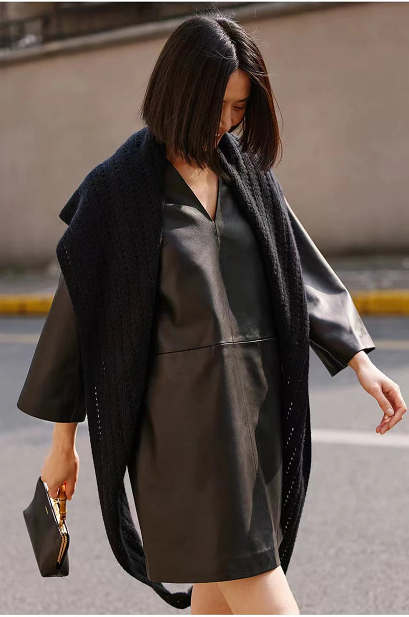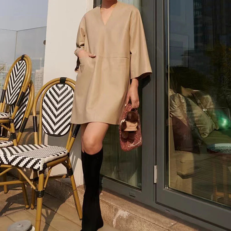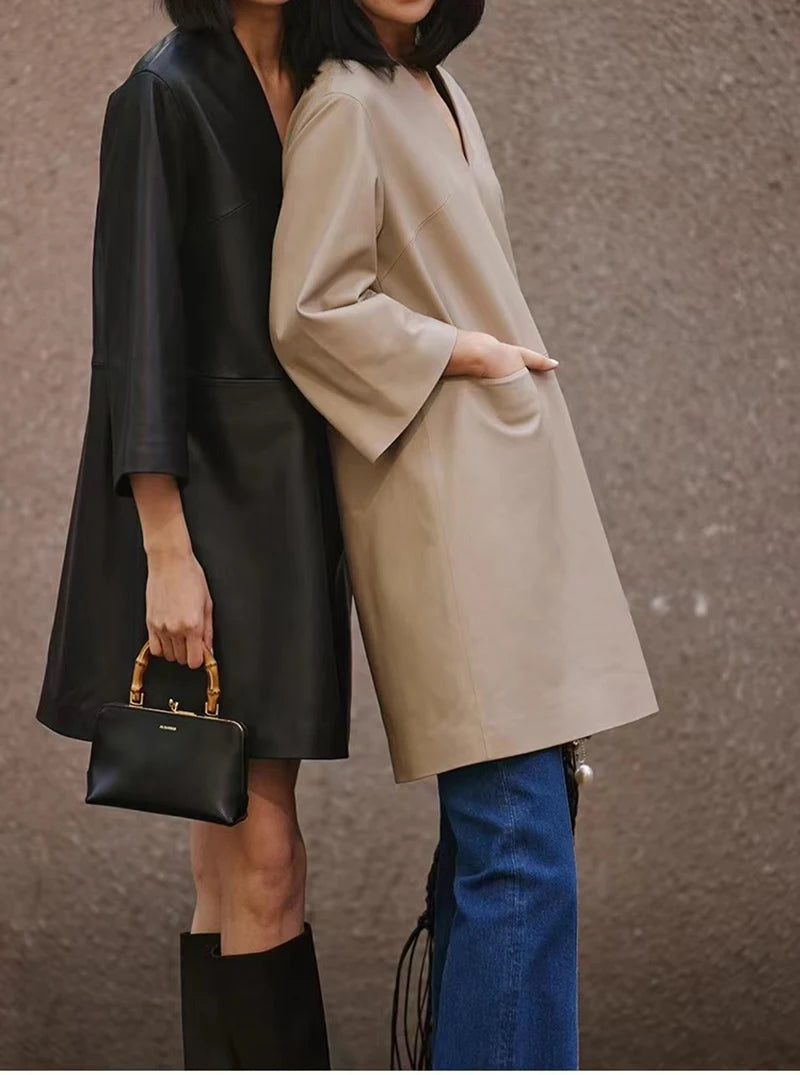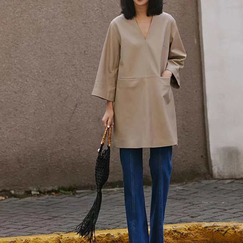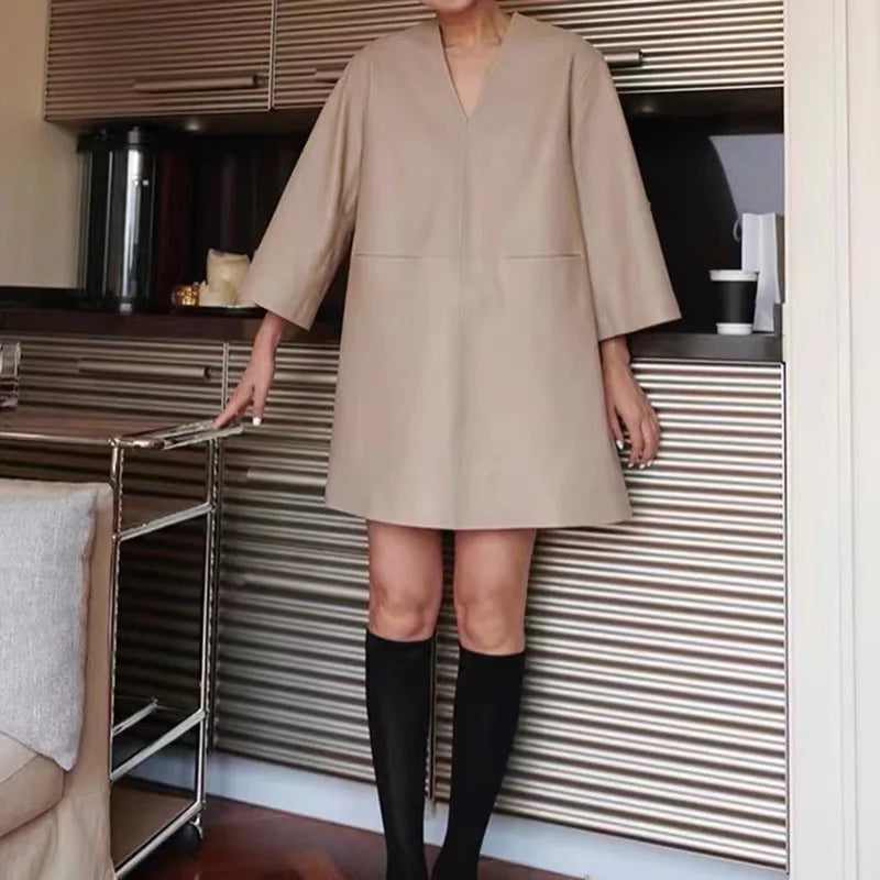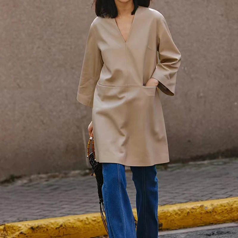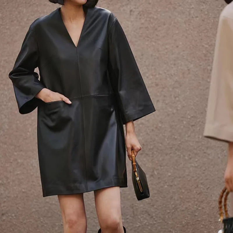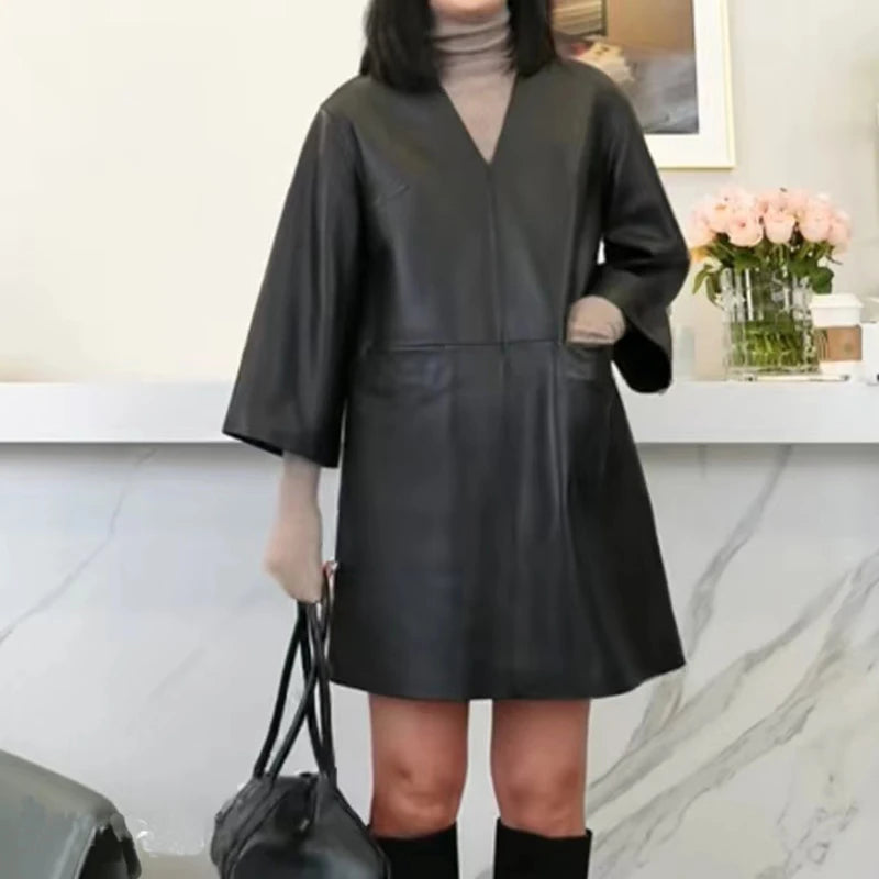 Spring Autumn V-Neck 8-Point Sleeve Loose Real Leather Jacket Dress for Women